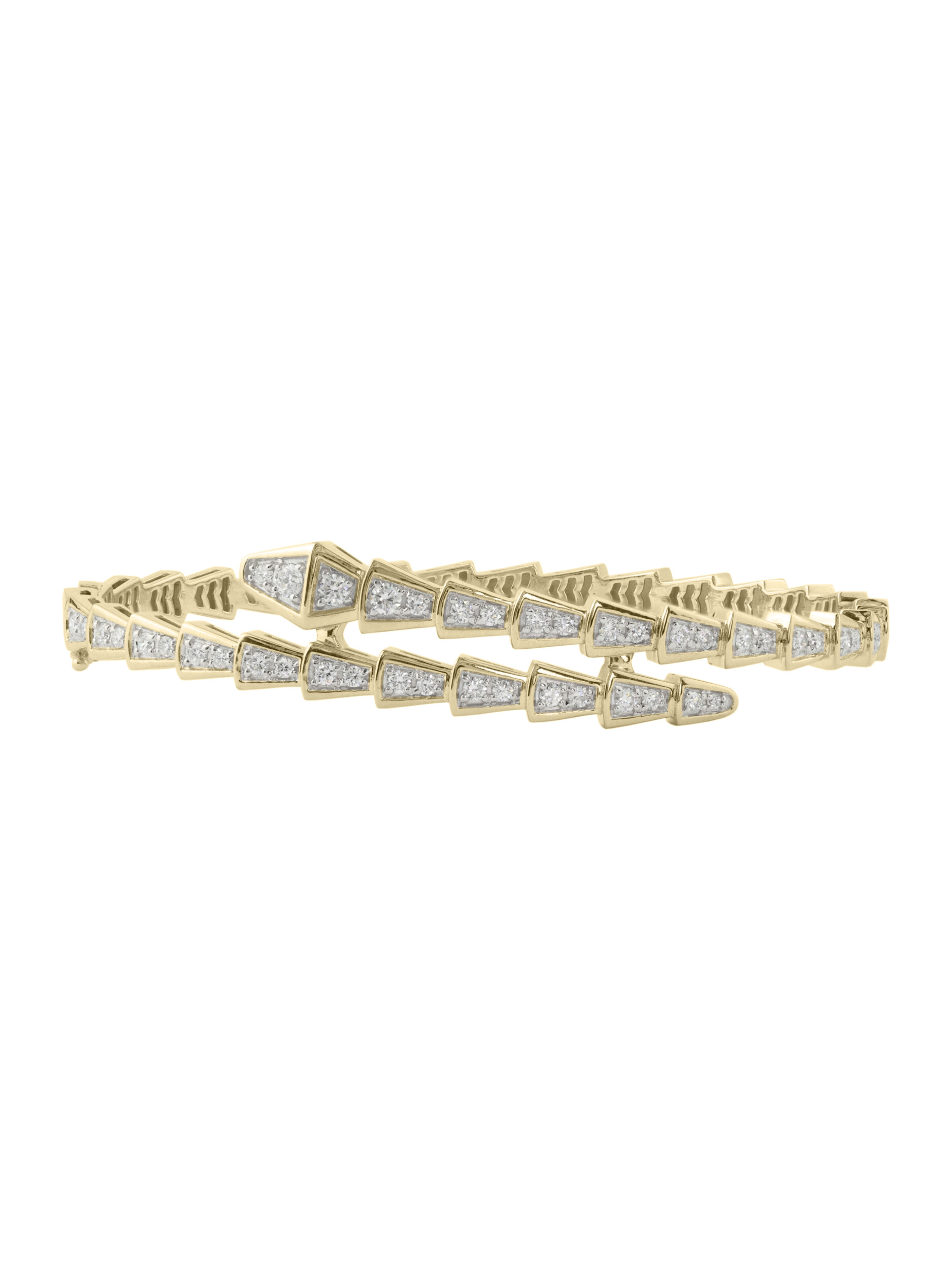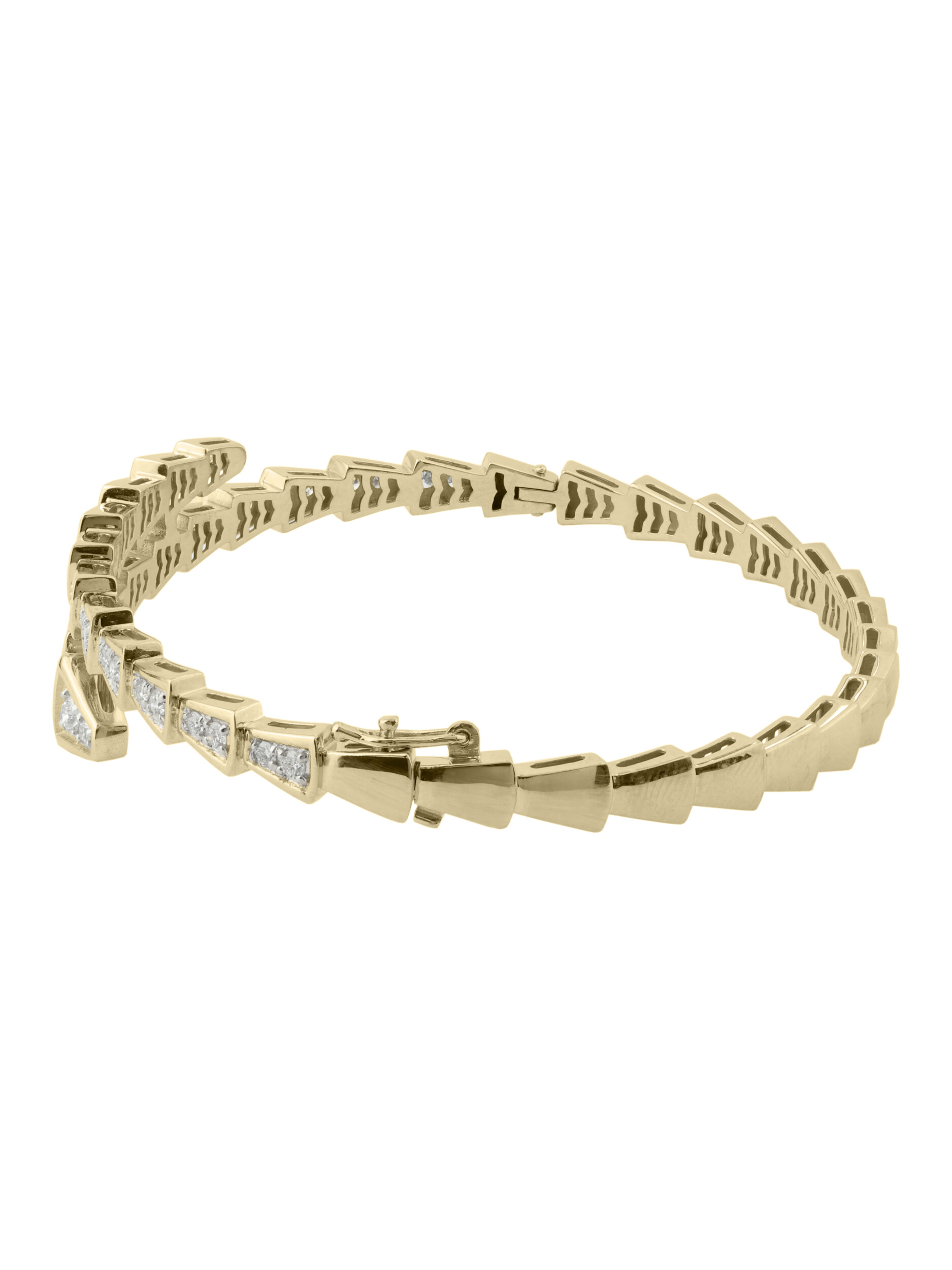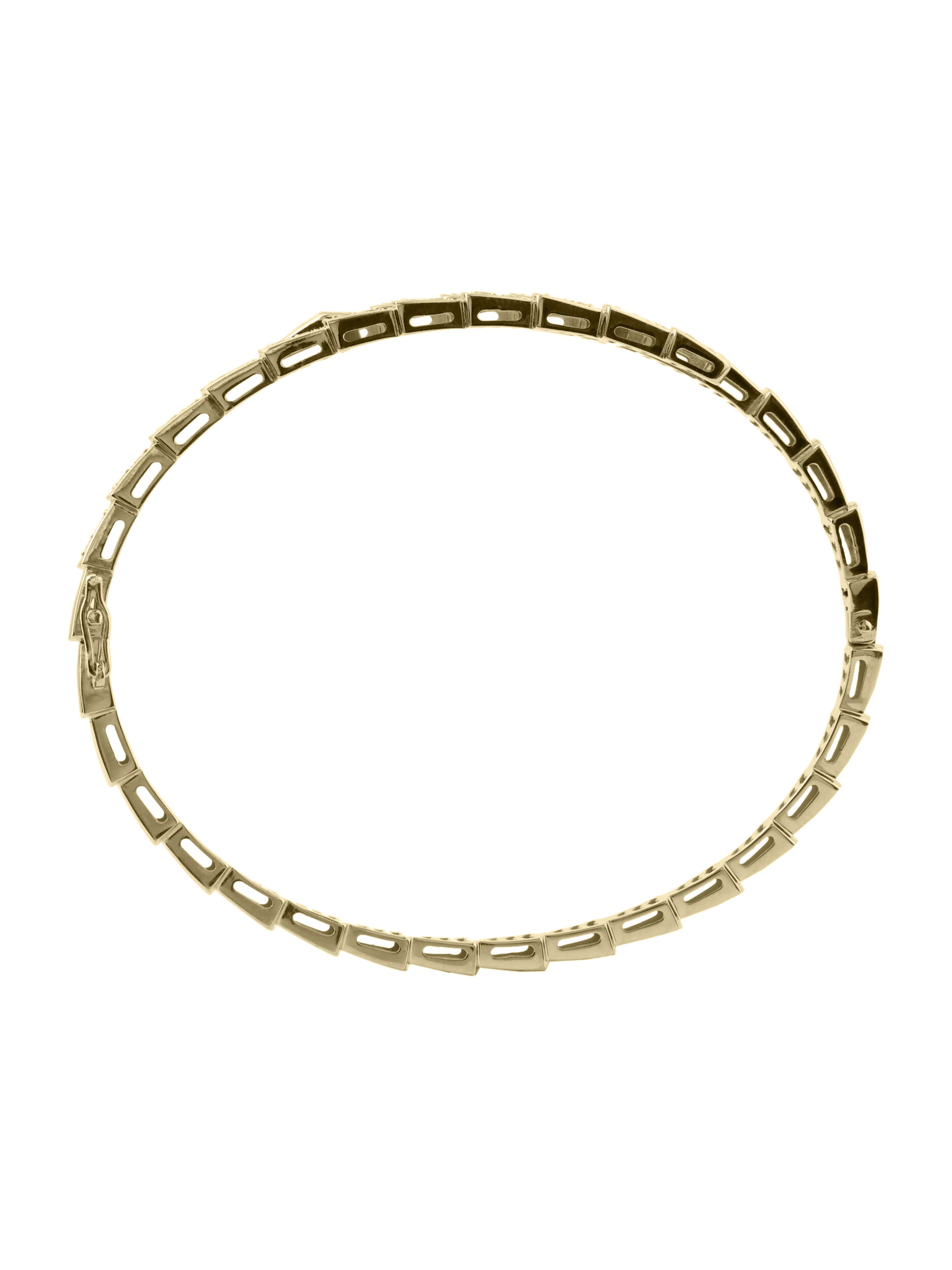 Особое сияние изделию придают вставки из 43 бриллиантов круглой формы с чистым белым цветом, которые инкрустированы в каждый сегмент браслета. Сочетание драгоценного металла лимонного цвета и блеска камней создает гармоничную игру света, привлекающую внимание к деталям. Этот аксессуар станет идеальным дополнением для ценителей смелых, но элегантных решений в ювелирном искусстве.