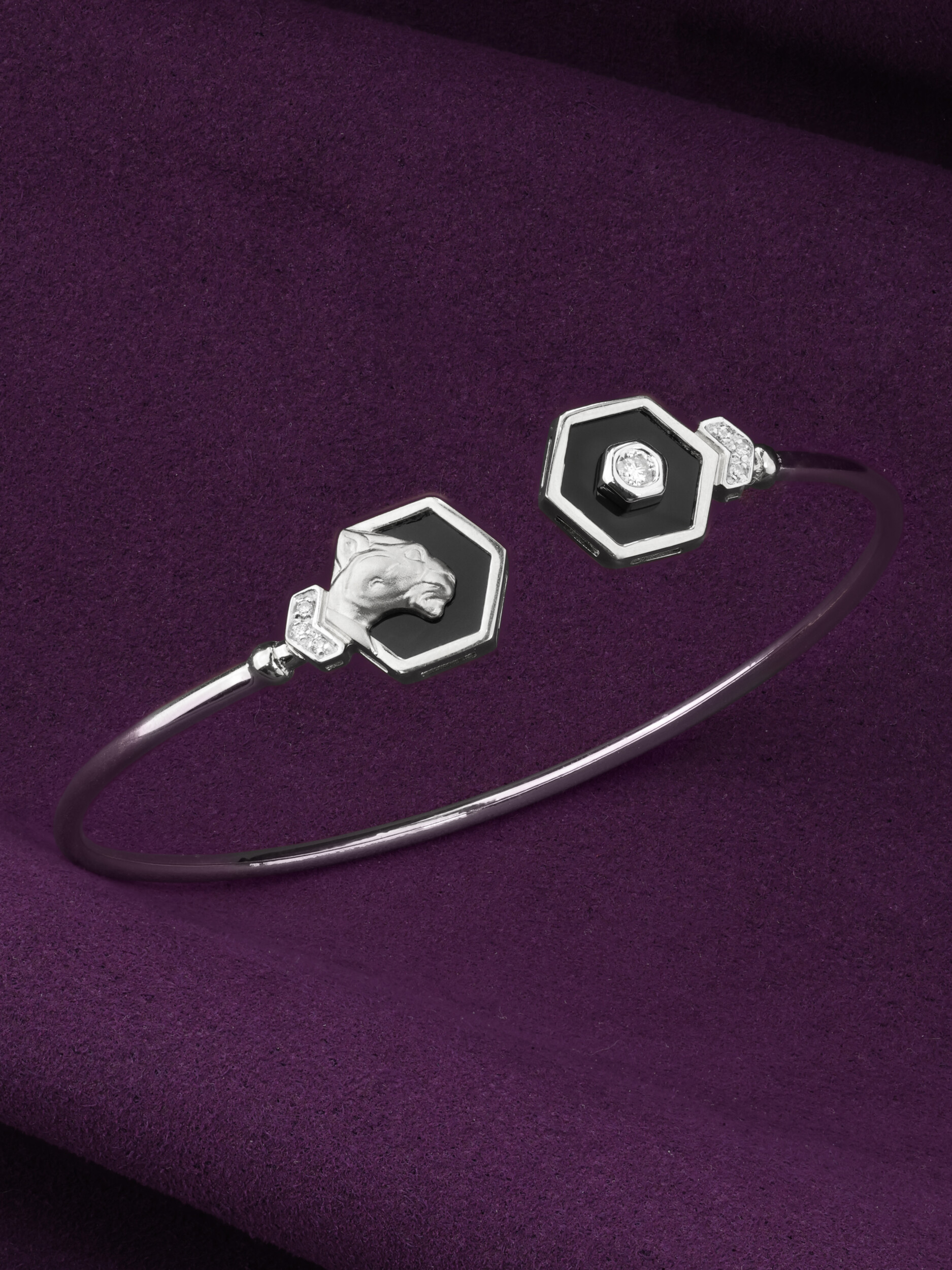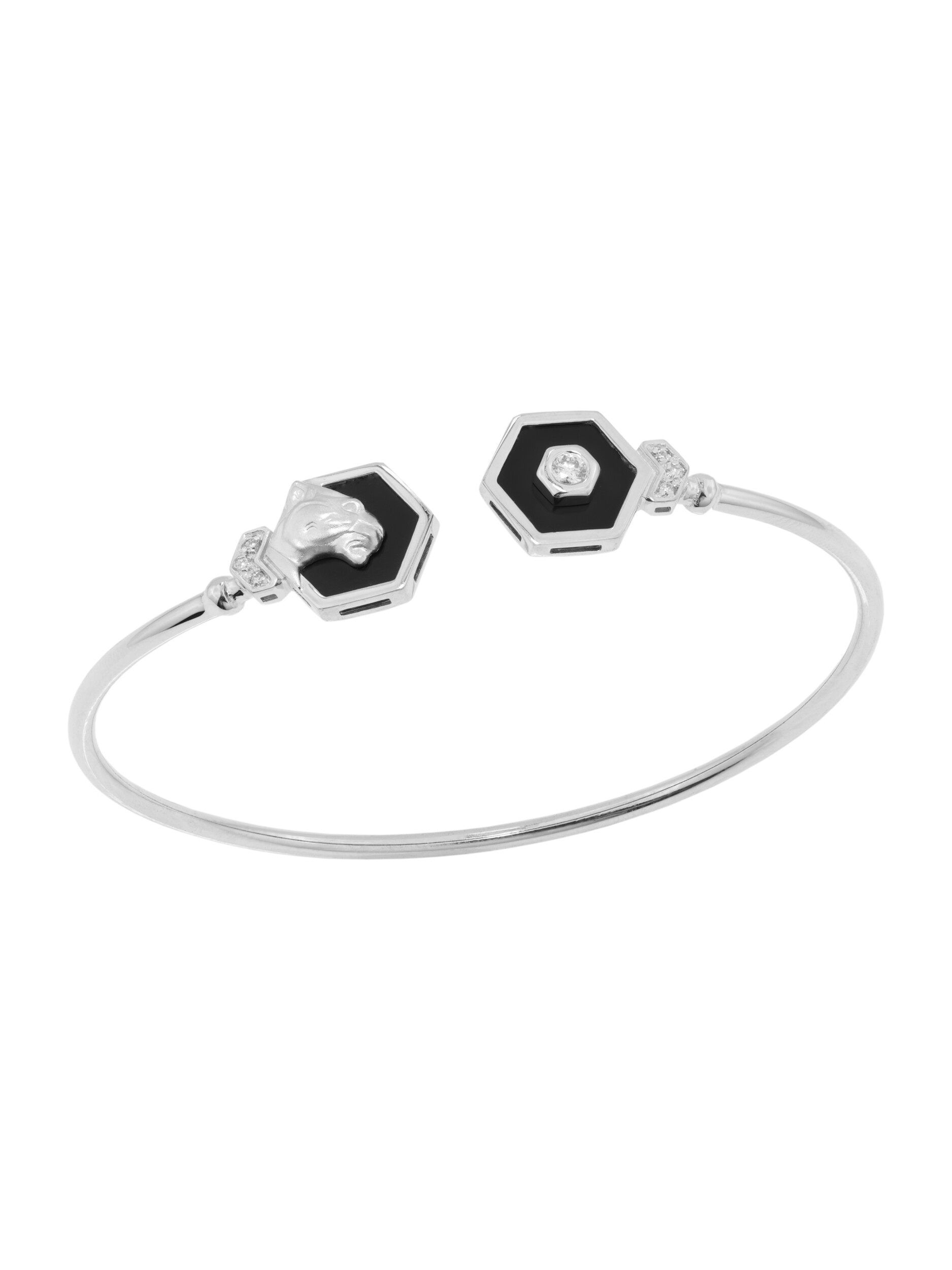 Элегантный и смелый браслет из белого золота 585 пробы станет ярким акцентом вашего образа. Дизайн украшения, вдохновленный грацией пантер, идеально сочетает в себе классику и современные ювелирные тенденции. В центре внимания композиции находятся вставки из черного оникса, которые эффектно контрастируют с холодным блеском белого металла. Геометрические формы вставок — шестигранники — придают изделию особое звучание, характерное для коллекции De Luxe — Гексагон.