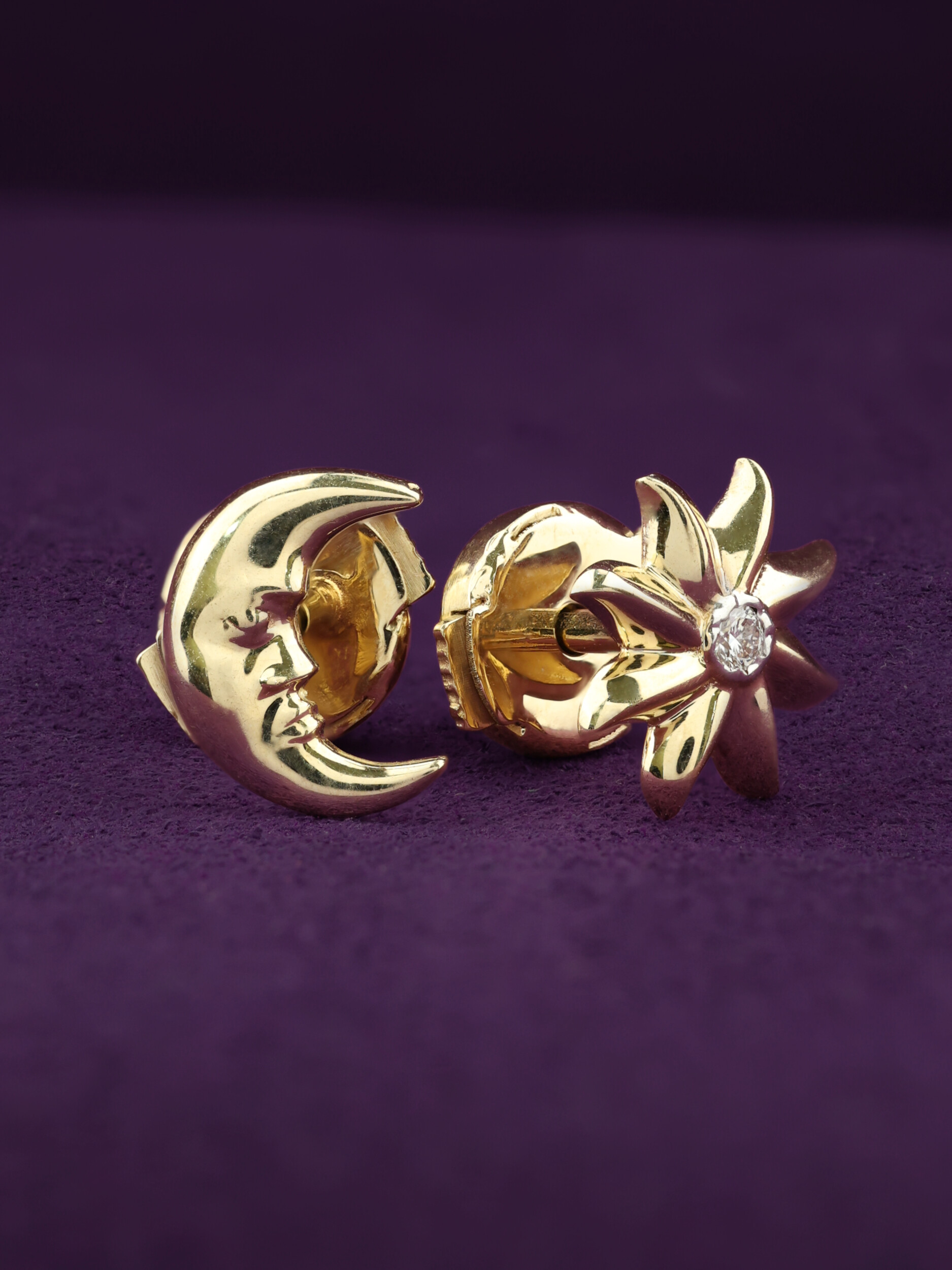 Эти необыкновенные серьги из лимонного золота 585 пробы станут символом вашего уникального стиля. Украшения воплощают в себе притягательную эстетику дизайна Солнце и Луна, где каждая деталь подчеркивает мастерство исполнения. Нежный блеск лимонного золота гармонично сочетается с сиянием белых бриллиантов. В центре композиции расположена одна вставка круглой формы, которая притягивает взгляд своей чистотой и игрой света.