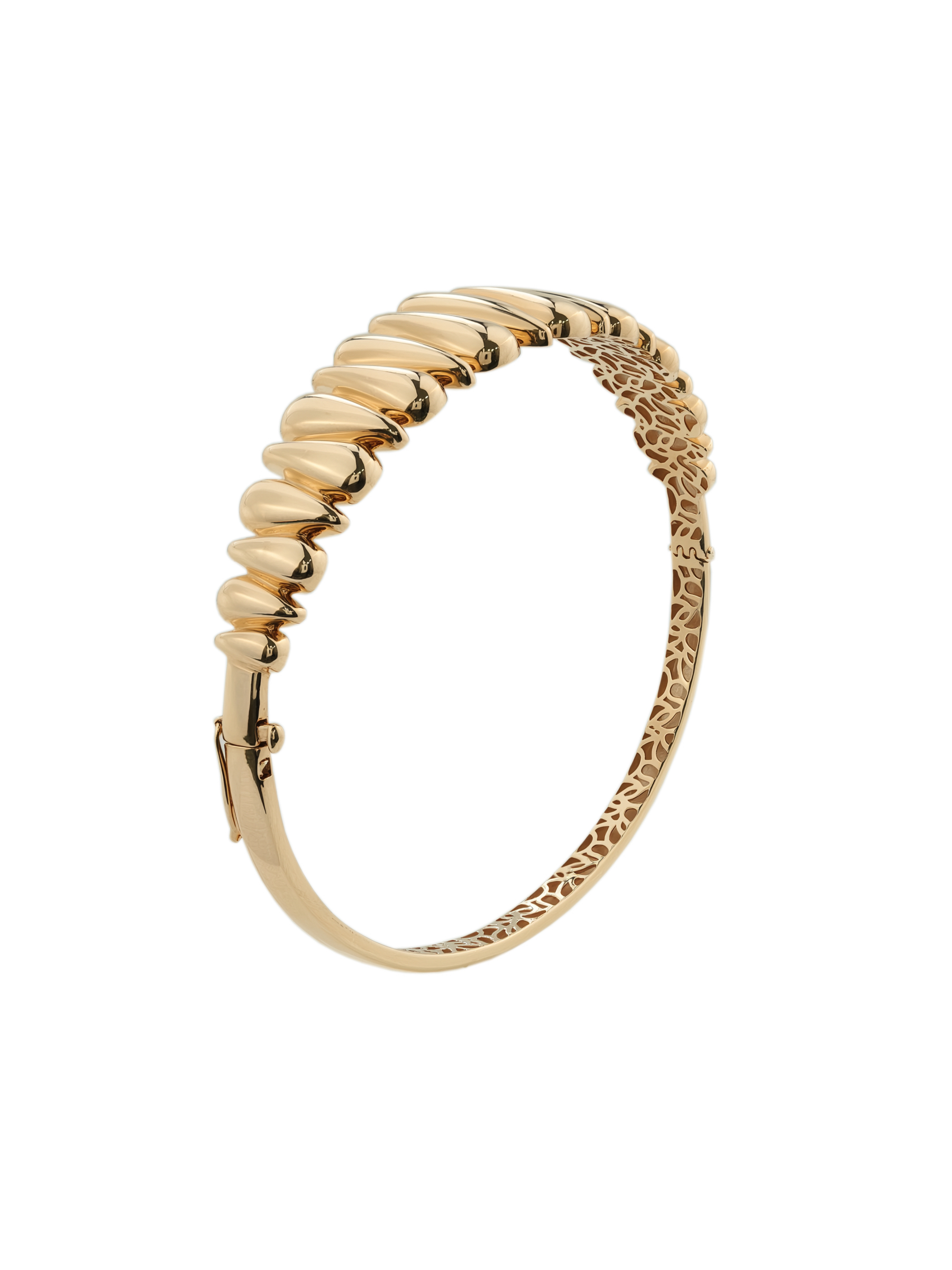 Эффектный золотой браслет — это воплощение смелого стиля и современного взгляда на ювелирное искусство. Украшение входит в коллекцию Vioretty — Transforme, которая создана для тех, кто ценит индивидуальность и готов к экспериментам в образе. Дизайн изделия впечатляет своей дерзостью: поверхность браслета декорирована выразительными элементами в виде шипов, создающих объемную фактуру и яркую игру света на гладком металле.