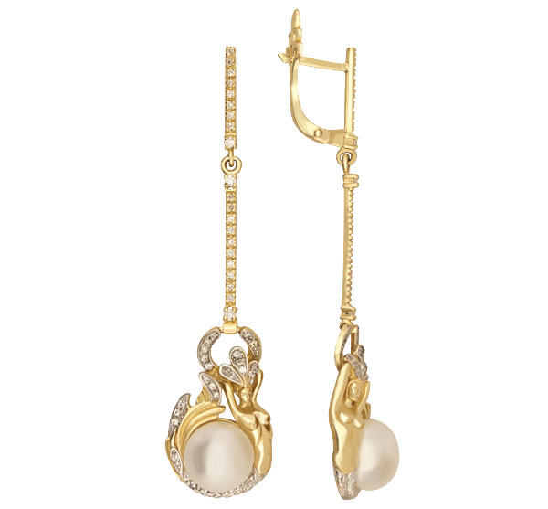 Серьги из лимонного золота c бриллиантами и жемчугом