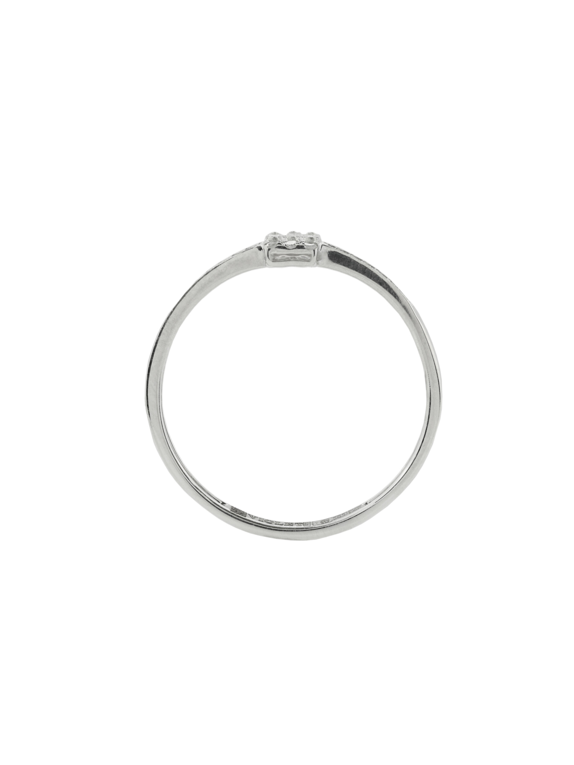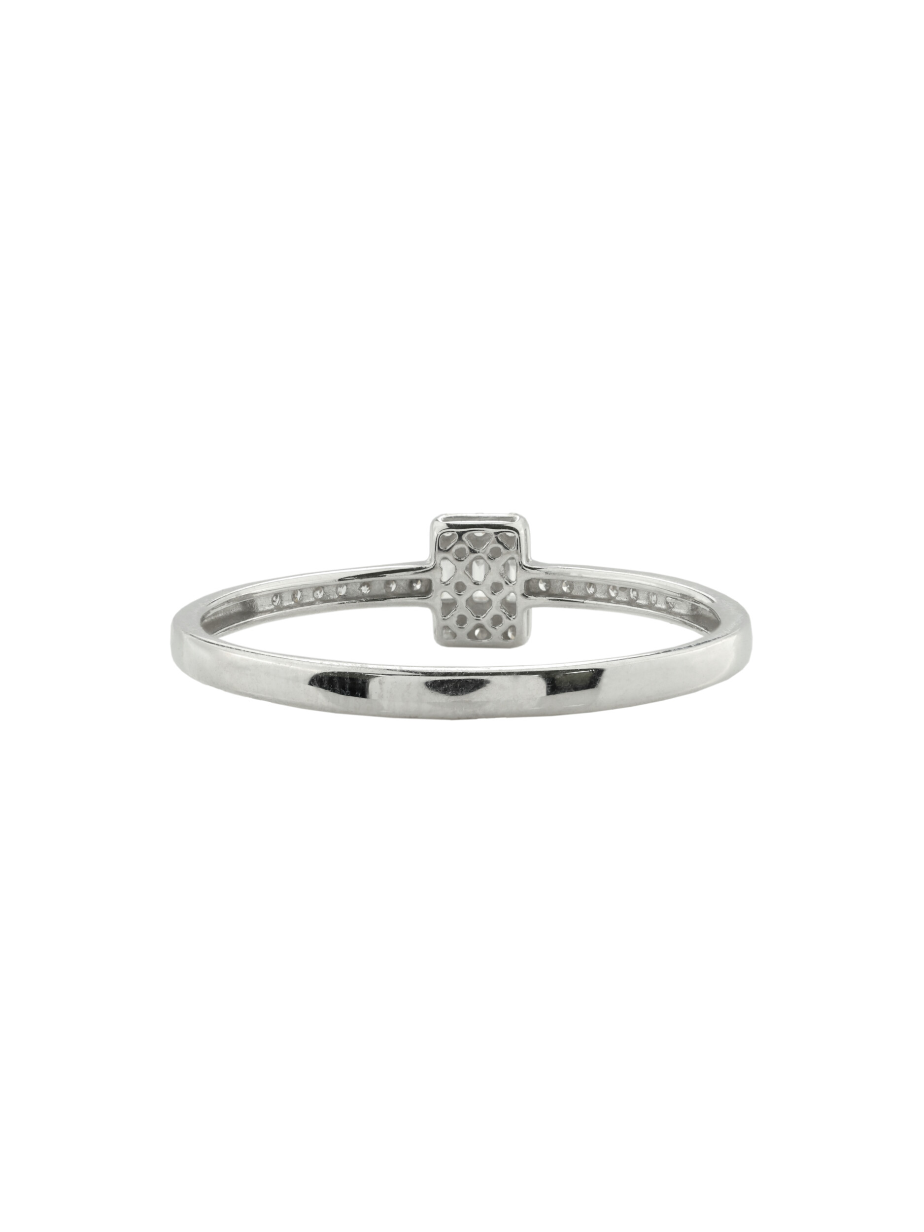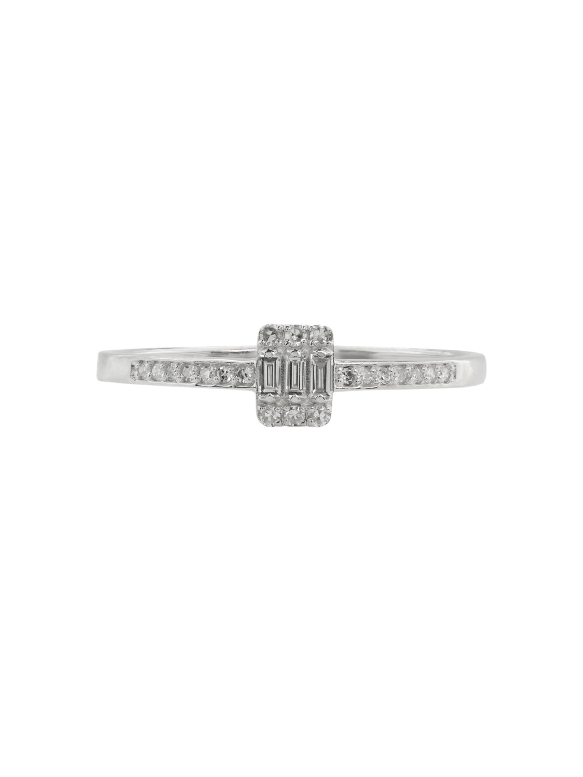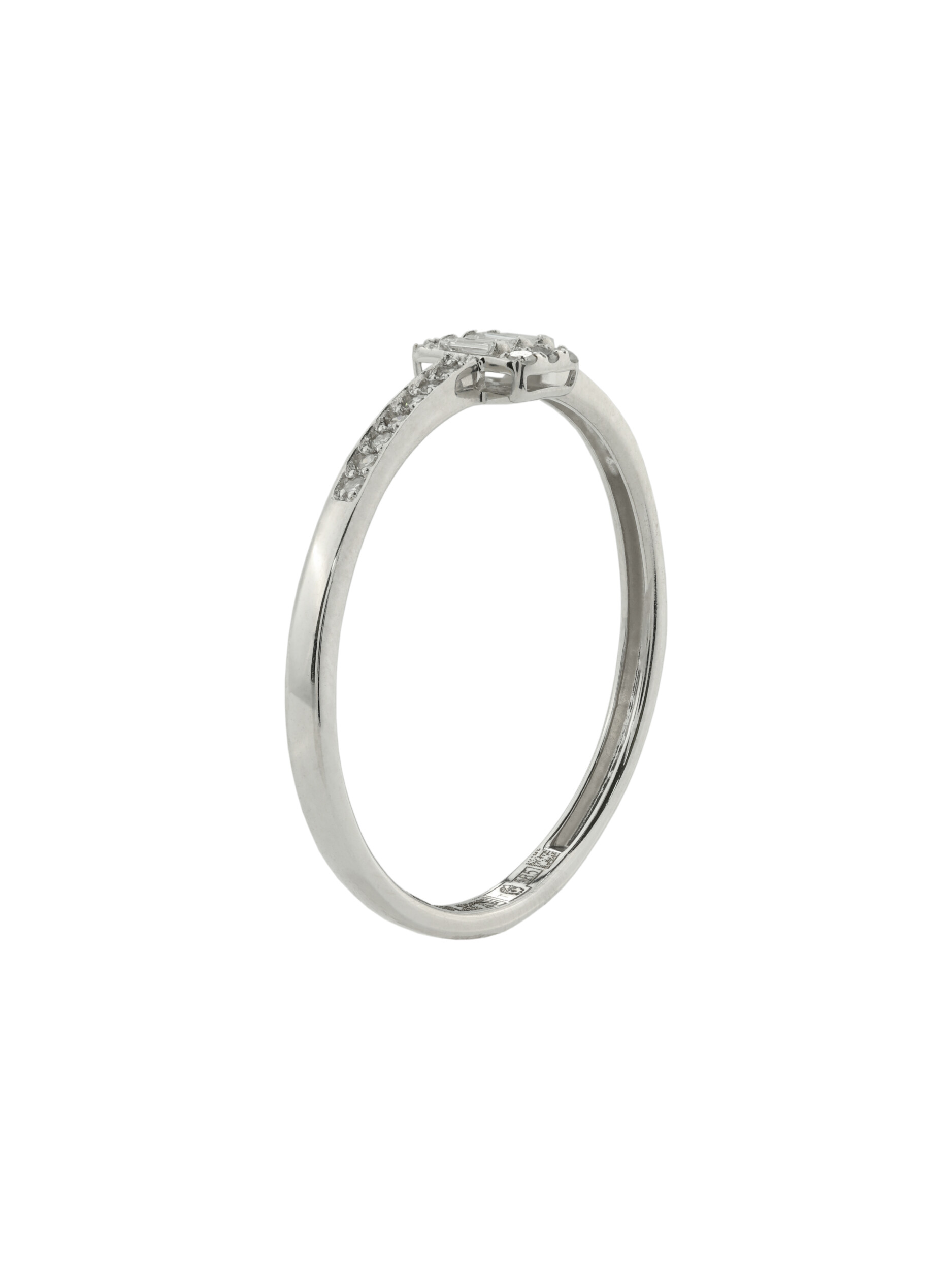 Центральная композиция изделия приковывает взгляд благодаря искусной комбинации форм вставок: строгий прямоугольный багет окружен сияющими круглыми камнями. Белый цвет вставок идеально сочетается с холодным блеском белого золота, создавая монохромную эстетику, которая всегда остается актуальной. Это кольцо создано для ценителей лаконичных, но выразительных украшений.