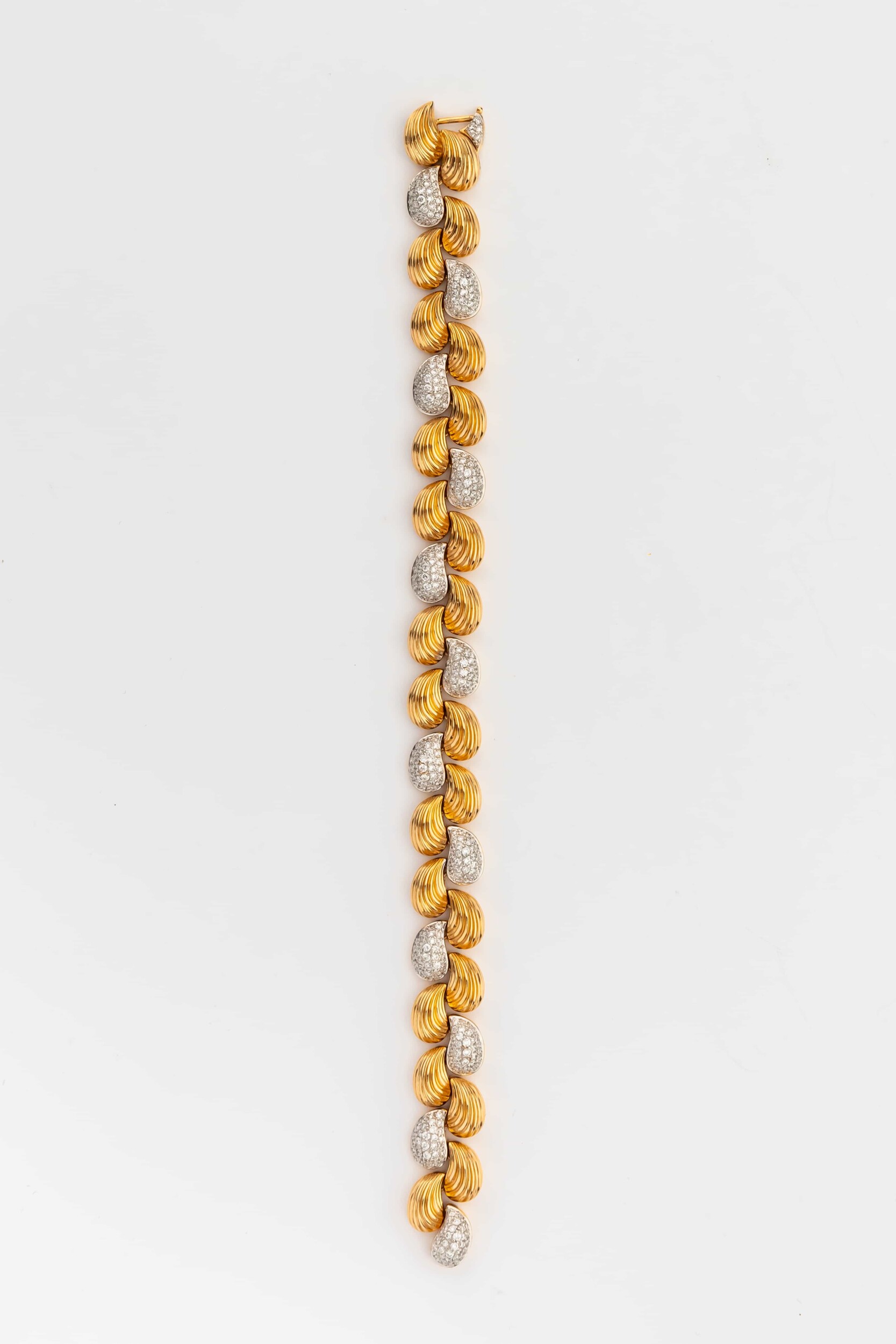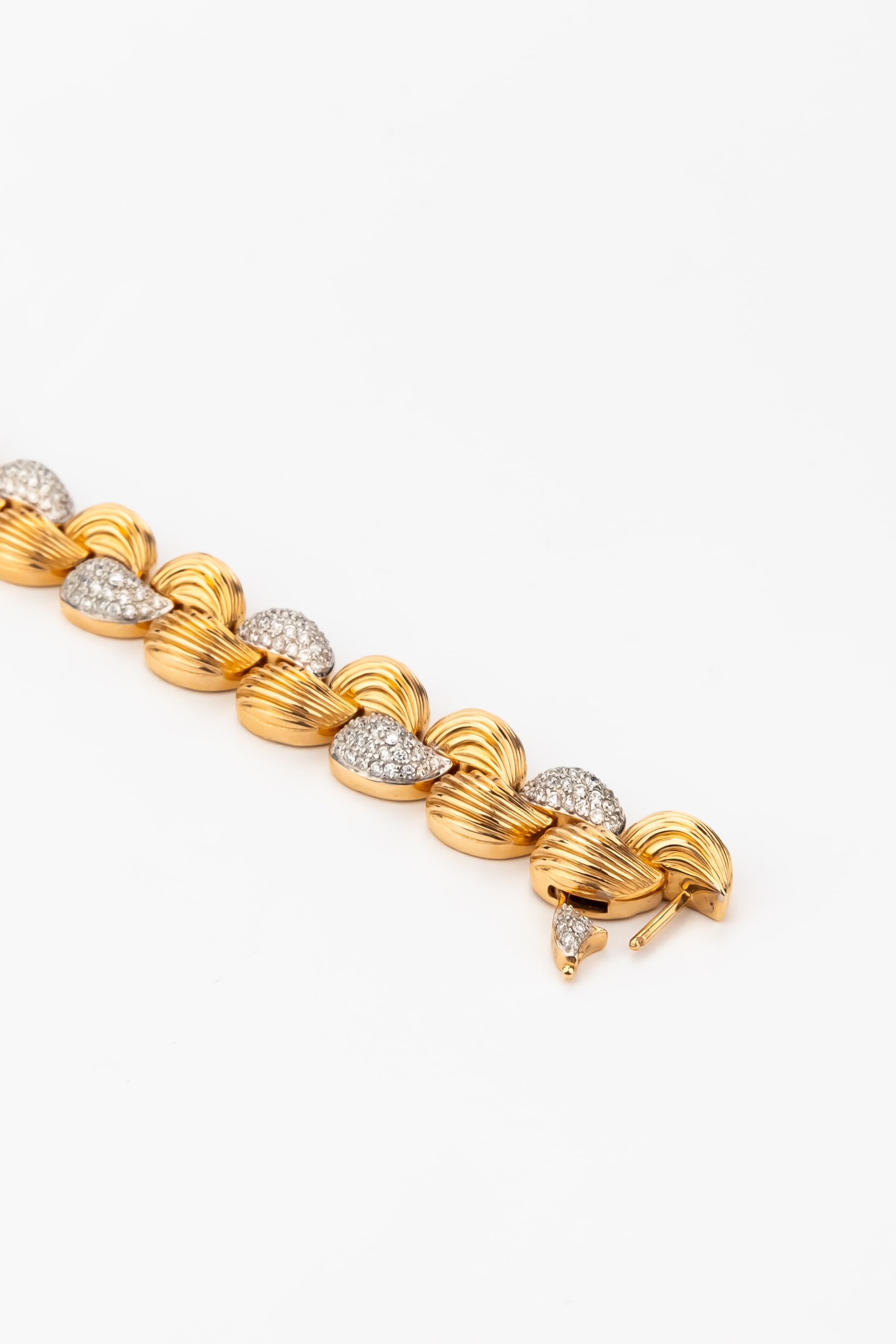 Особое внимание привлекает инкрустация: 389 бриллиантов круглой формы с классическим белым цветом вставок рассыпаны по поверхности браслета, словно капли утренней росы. Такое внушительное количество камней обеспечивает невероятное сияние при любом освещении, превращая украшение в настоящий шедевр ювелирного искусства. Сложная художественная ажурная обработка внутренней части звеньев придает изделию дополнительную изысканность.