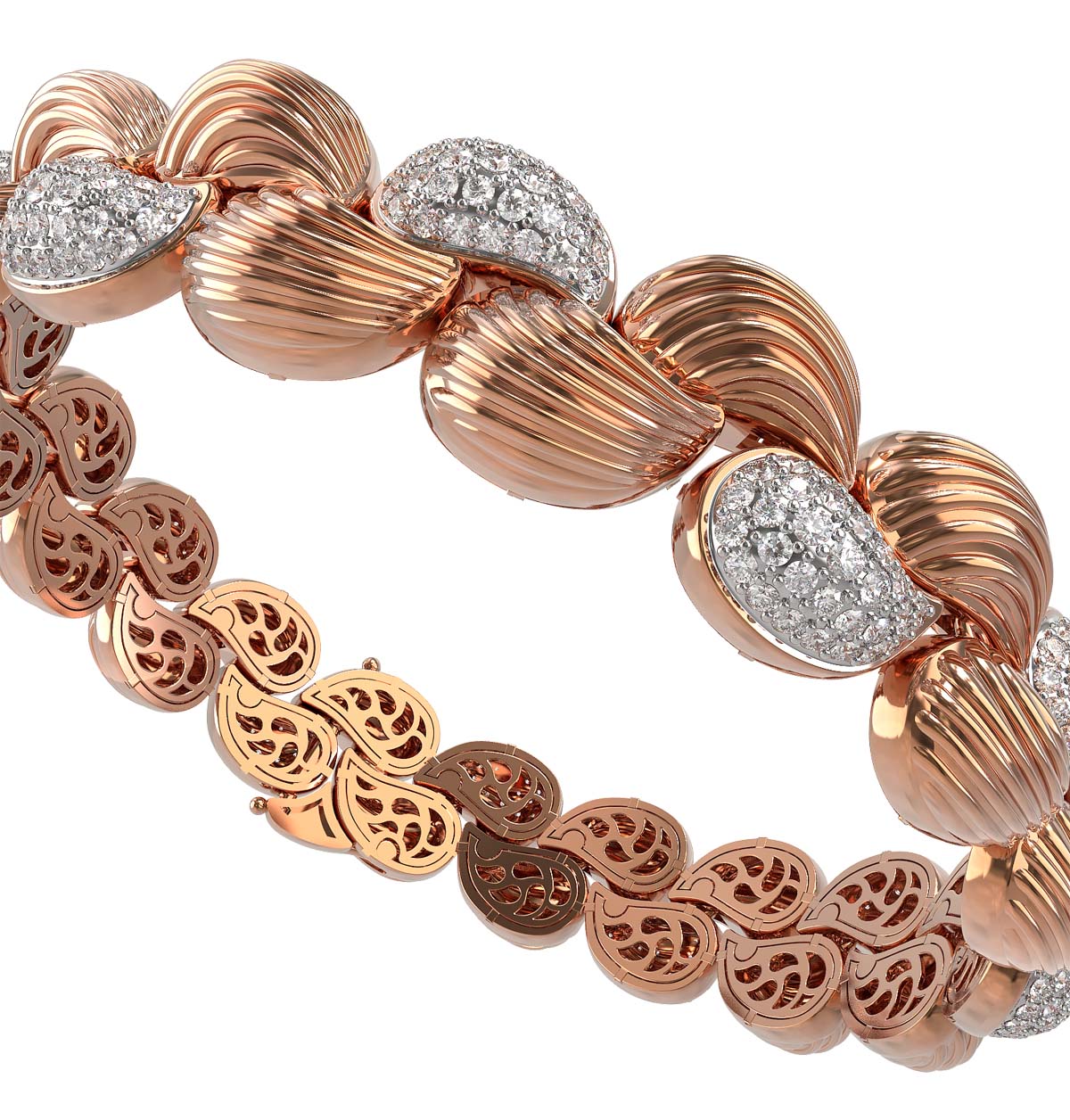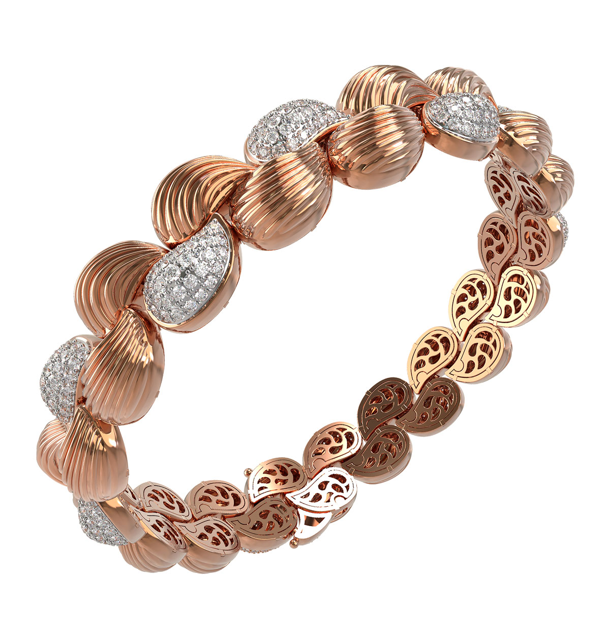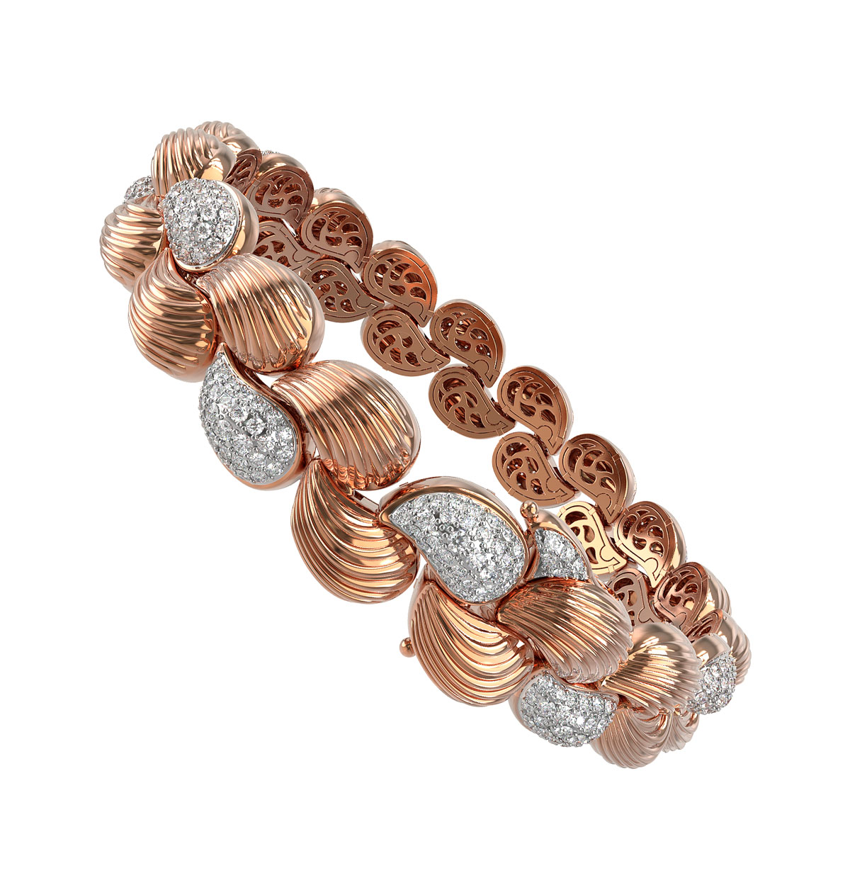 Роскошный браслет из красного золота 585 пробы станет центральным акцентом вашего образа, подчеркивая безупречный вкус и статус. Это ювелирное изделие из коллекции De Luxe Бриллианты — Treasure завораживает своей сложной архитектурной формой, напоминающей переплетение экзотических лепестков. Глянцевая поверхность металла, выполненная в благородном красном цвете, контрастирует с нежными вставками, создавая эффект динамичного объема и глубины.
