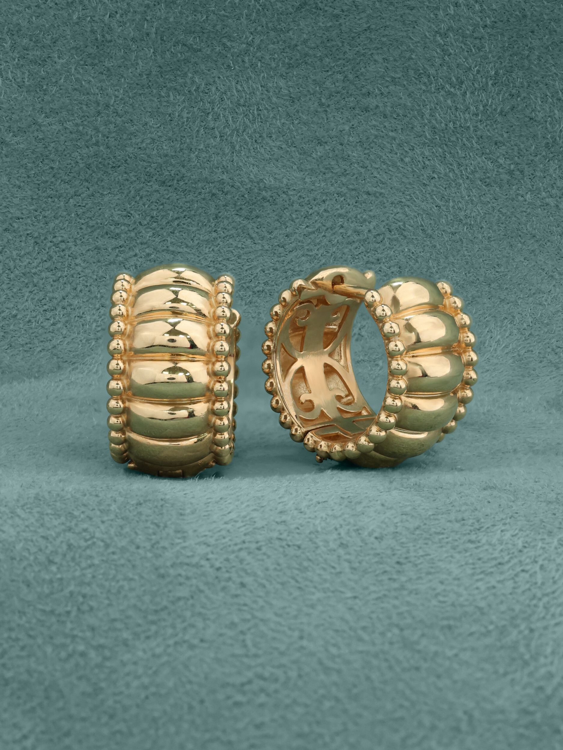 Эти изысканные серьги из коллекции Vioretty — Firenze воплощают в себе дух утонченности и высокого ювелирного искусства. Изделие выполнено из красного золота 585 пробы, что придает аксессуару теплый и благородный оттенок. Дизайн украшения вдохновлен итальянским стилем, для которого характерны выразительные формы, объемные линии и внимание к деталям. Гладкие, округлые элементы в сочетании с изящным бисерным декором по краям создают динамичный и современный образ, который привлекает внимание своей безупречной эстетикой.