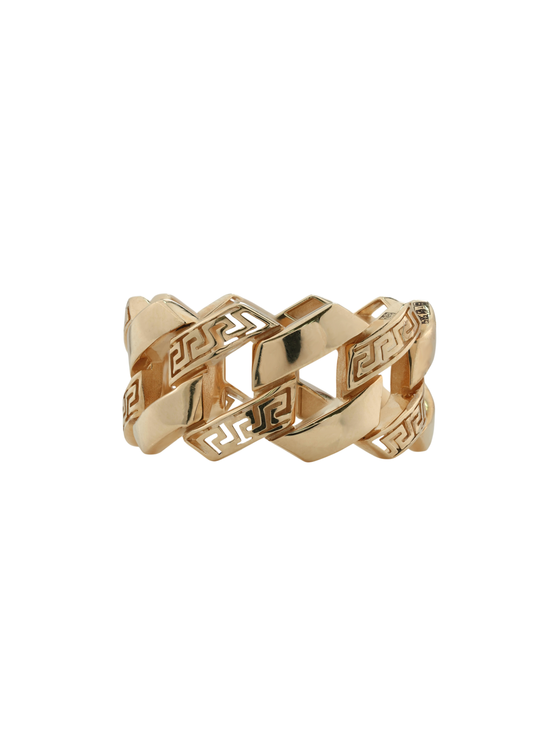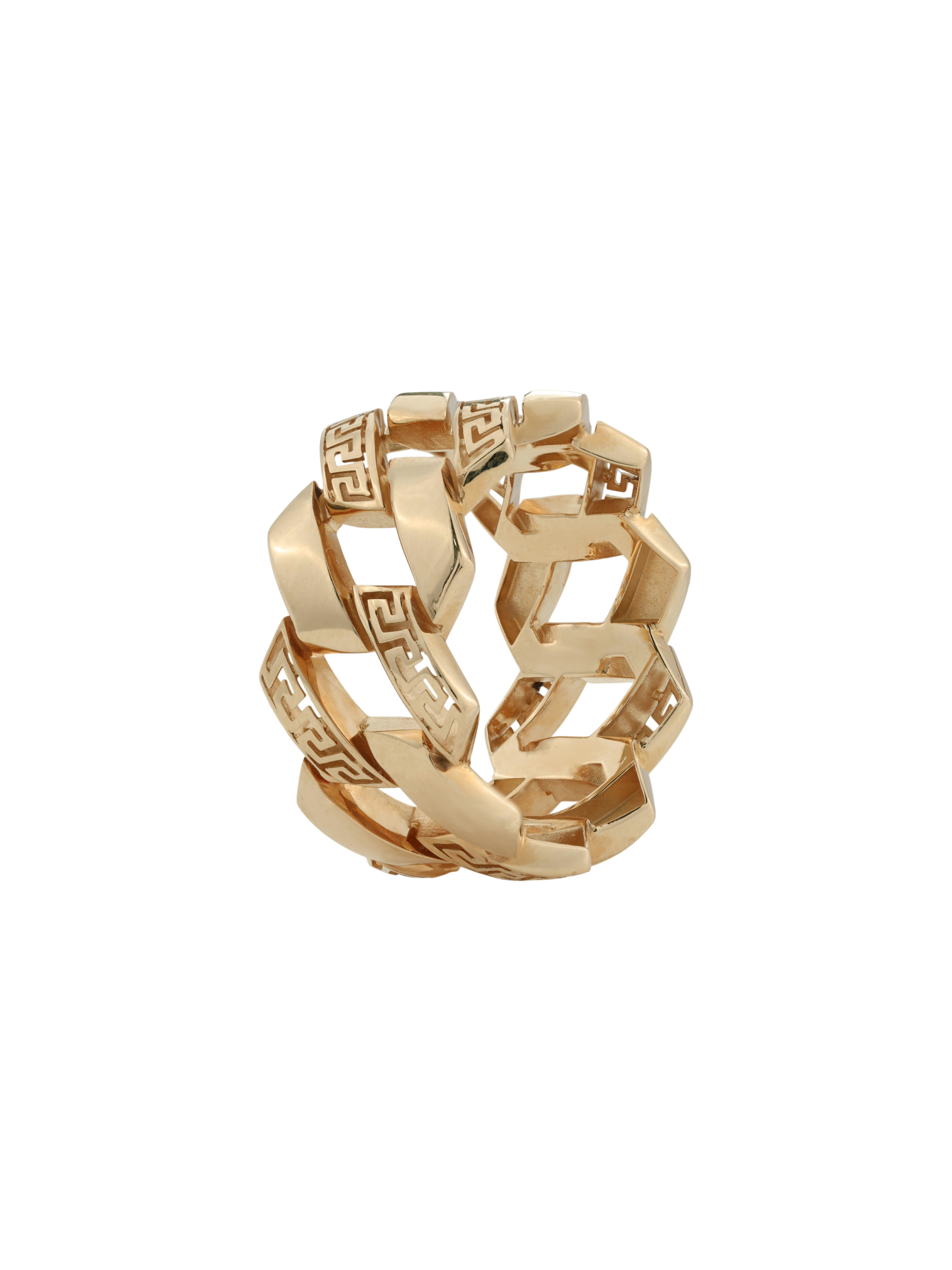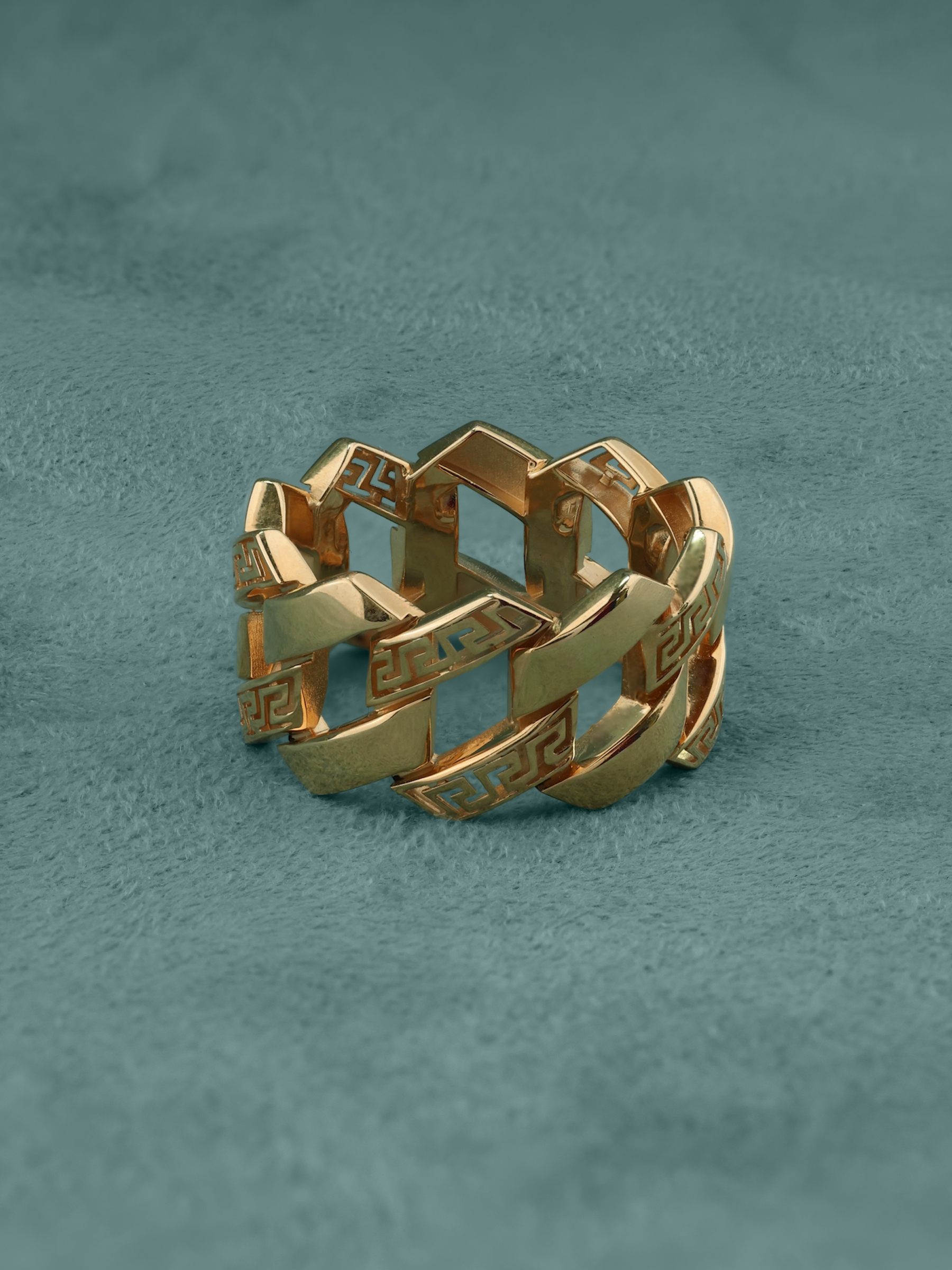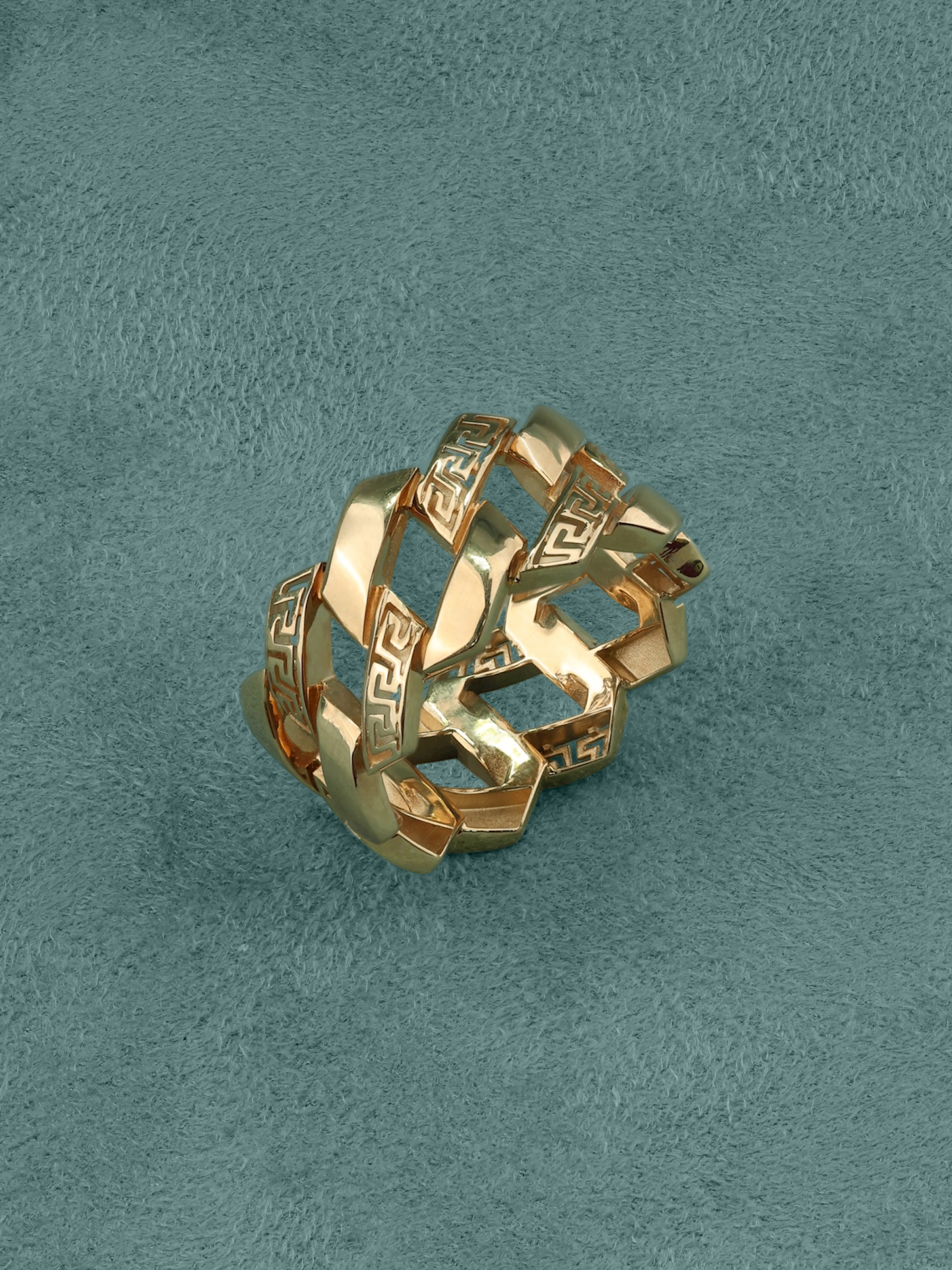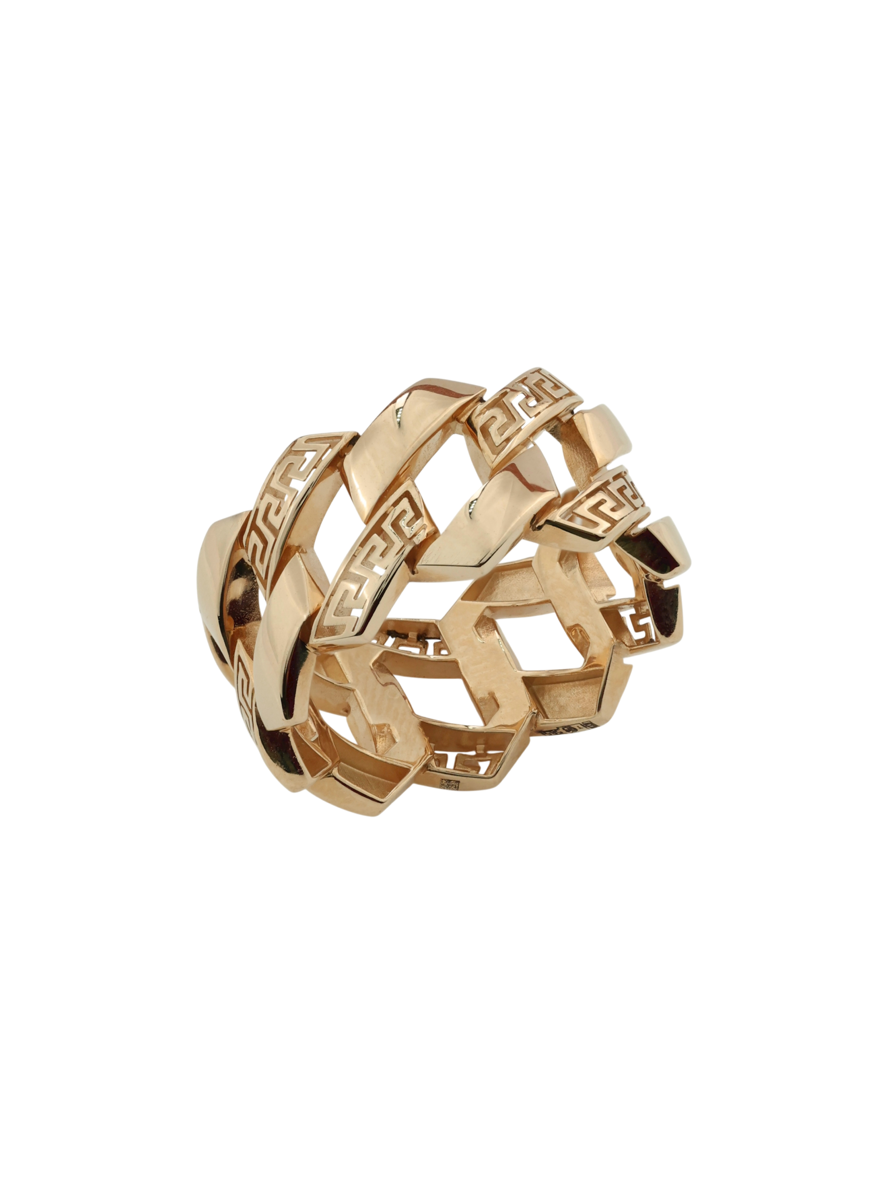 Кольцо из красного золота 585 пробы из коллекции Vioretty — Grecia станет акцентным украшением вашего образа. Дизайн изделия вдохновлен античной эстетикой — по всей поверхности металла нанесен характерный орнамент «греческий ключ», который добавляет украшению строгости и статусности. Массивная, объемная форма кольца привлекает внимание к рукам, подчеркивая уверенность и чувство стиля своего владельца.