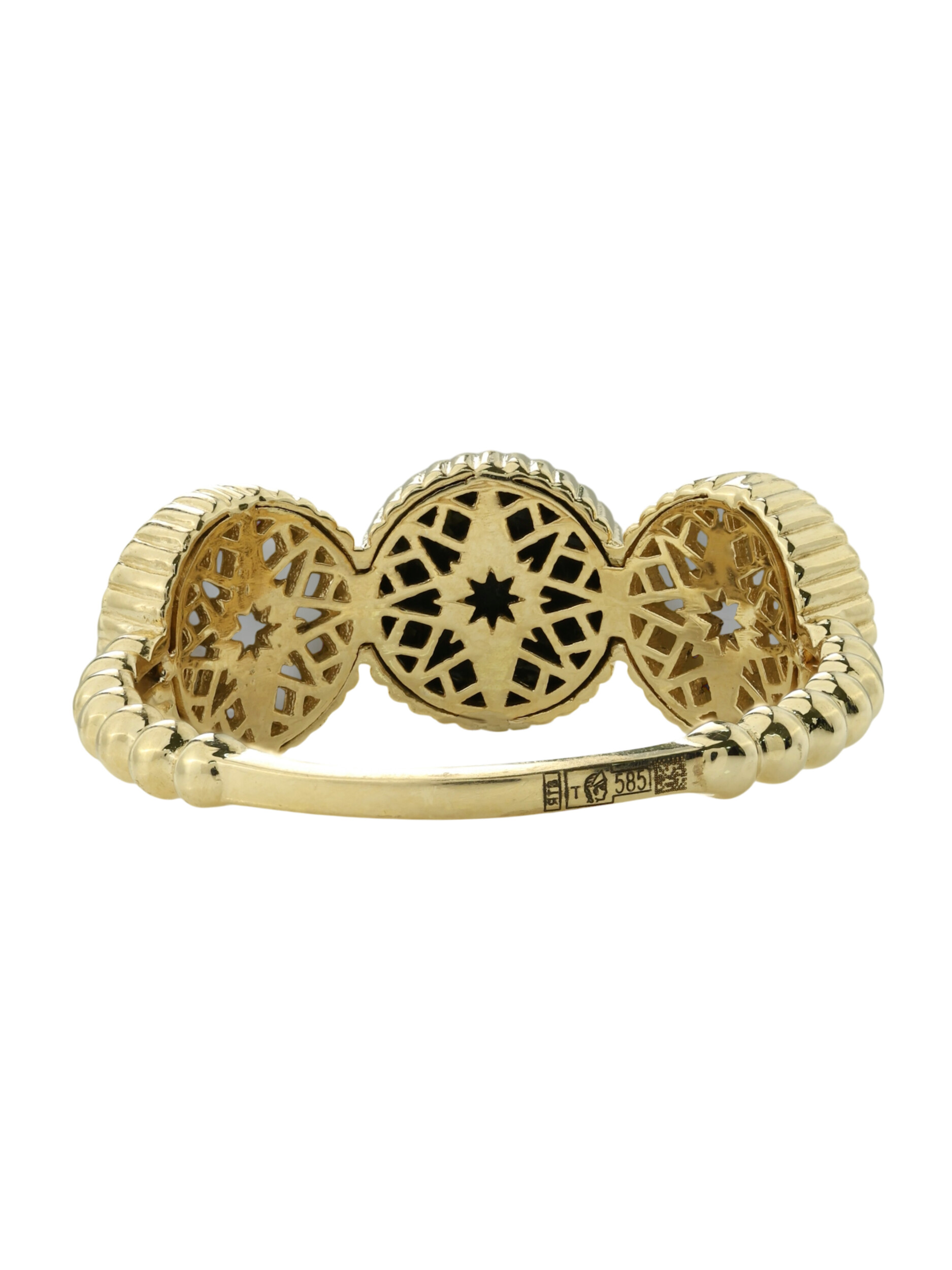 Роскошное кольцо из лимонного золота 585 пробы — яркий акцент, способный преобразить любой образ. Дизайн украшения, выполненный в стилистике звезд, притягивает внимание своей детализацией и оригинальным сочетанием материалов. Ювелиры использовали контрастный дуэт черного оникса и нежного перламутра, которые подчеркивают глубину и благородство лимонного оттенка металла.