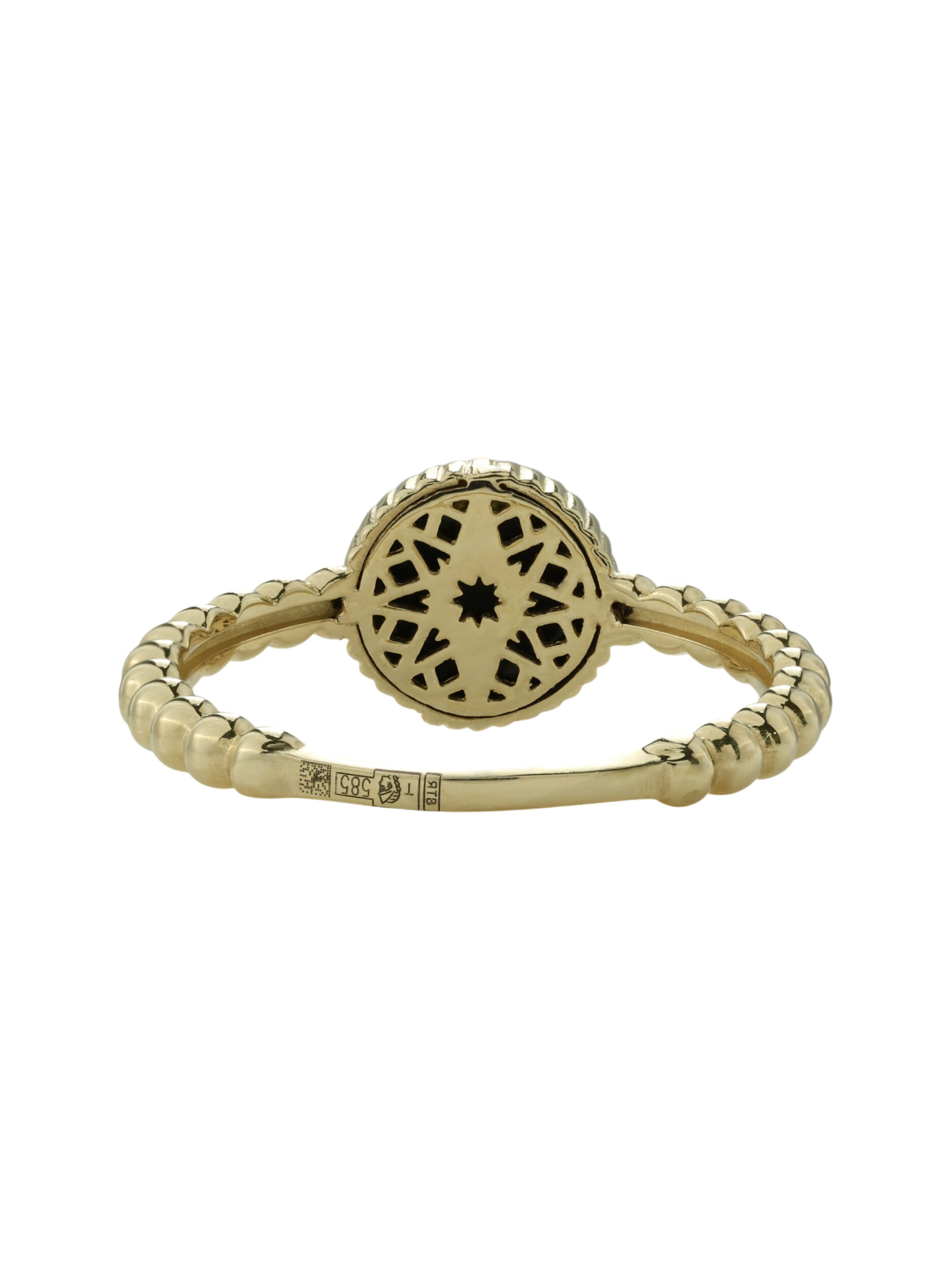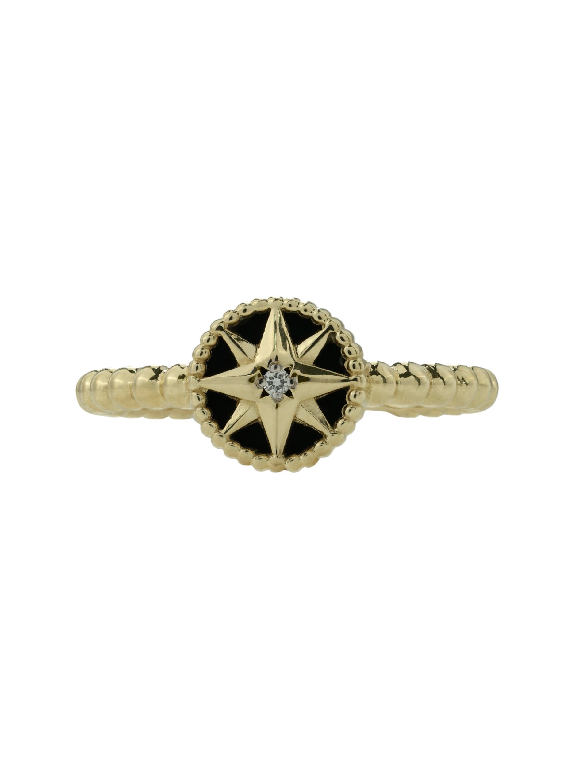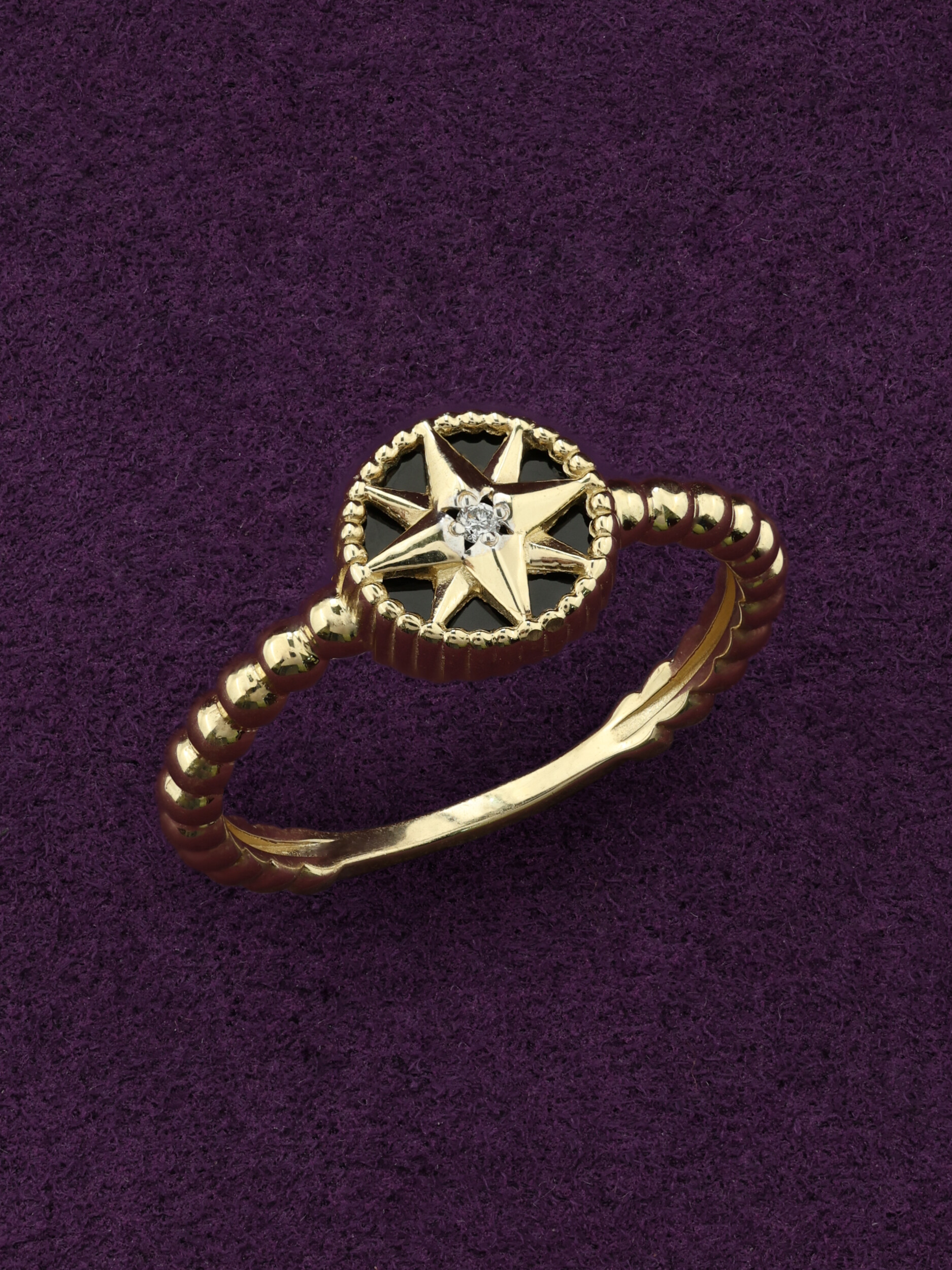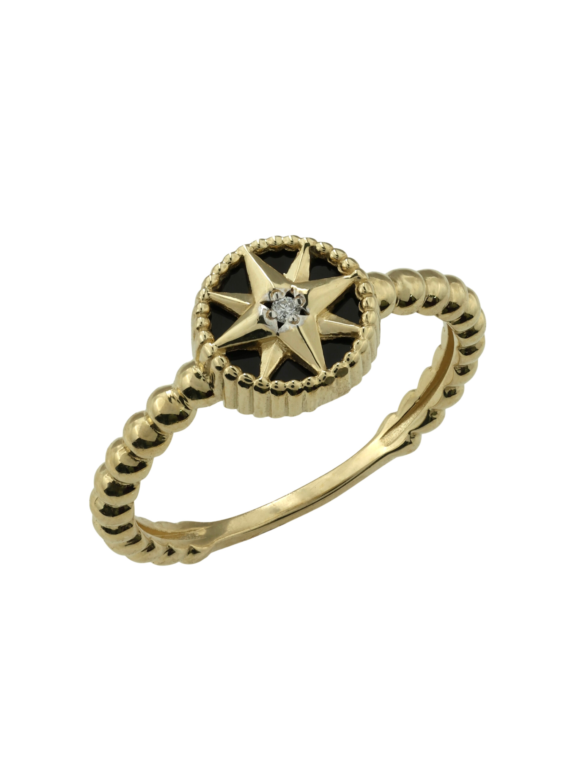 Кольцо из лимонного золота 585 пробы из коллекции De Luxe — Звёзды — Бриллианты станет изысканным акцентом вашего образа. Это стильное украшение в дизайне «Звезды» привлекает внимание контрастным сочетанием благородных материалов и ювелирным мастерством исполнения. Центральный декоративный элемент украшен вставками из оникса черного цвета и сияющим бриллиантом белого цвета, имеющим круглую форму огранки.