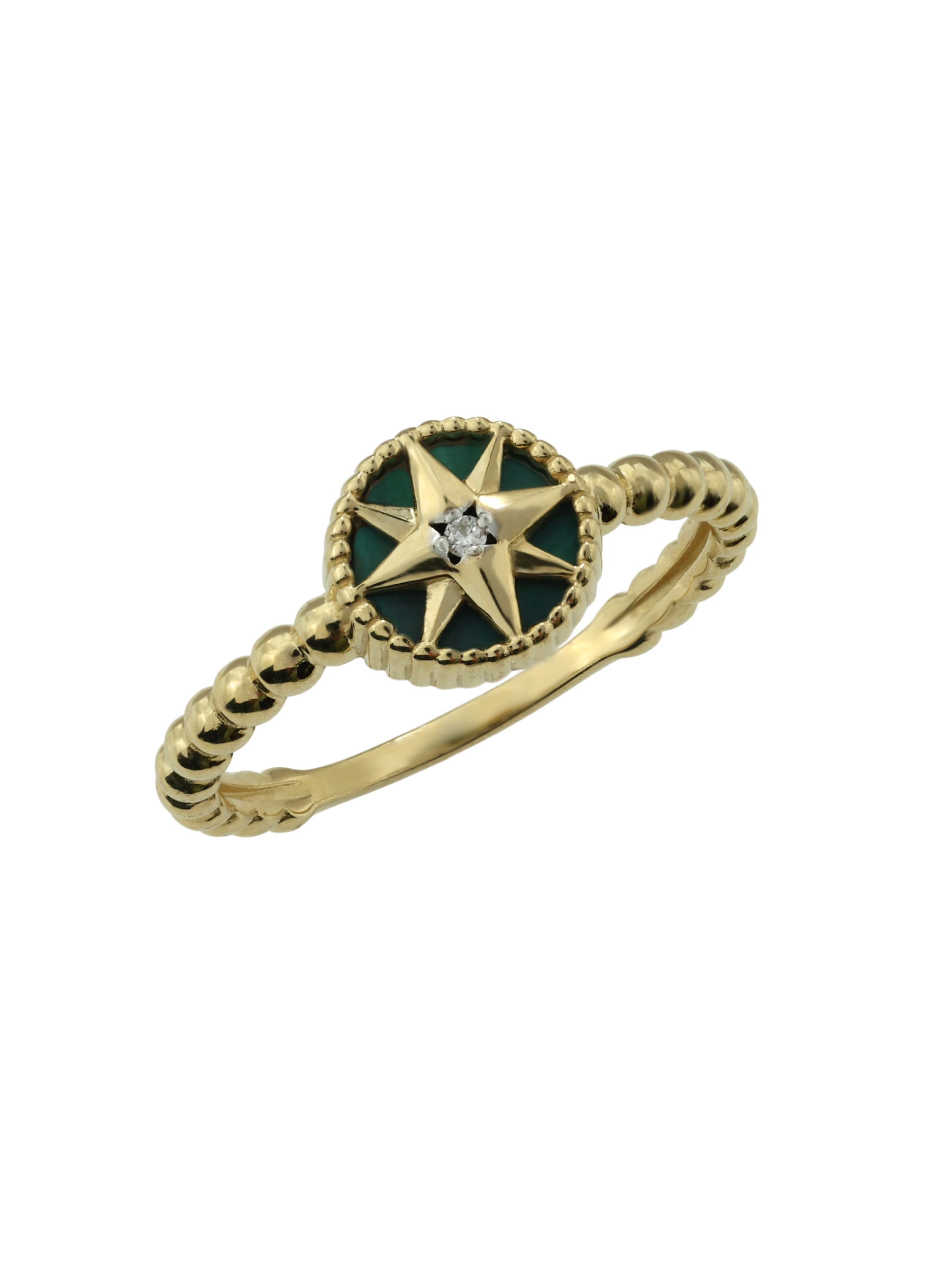 Элегантное кольцо из лимонного золота 585 пробы станет ярким акцентом в вашем образе. Дизайн украшения, выполненный в тематике Звезды, притягивает взгляд и подчеркивает статус владельца. Центром композиции является сочетание насыщенного зеленого малахита и сияющего белого бриллианта круглой формы. Контрастный тандем благородного металла и природных камней создает гармоничный и завершенный стиль.
