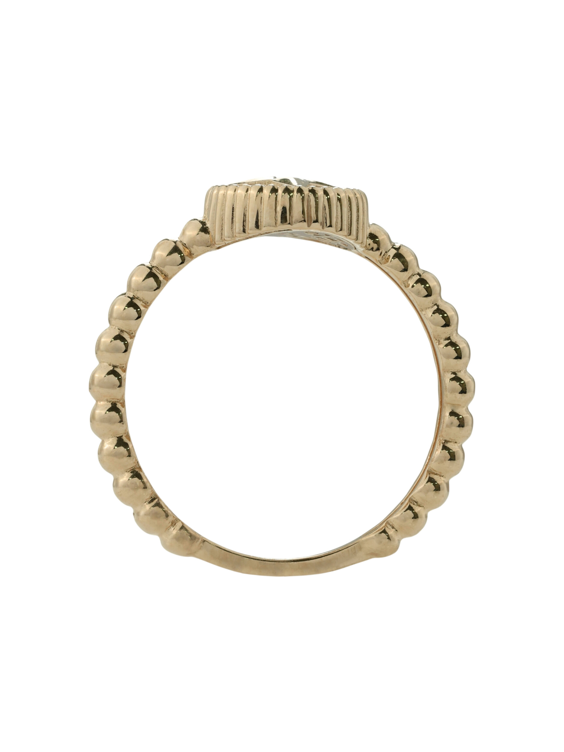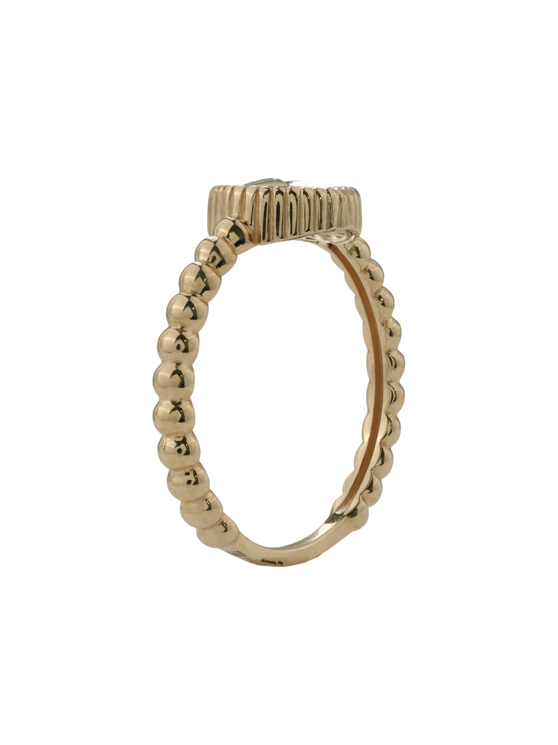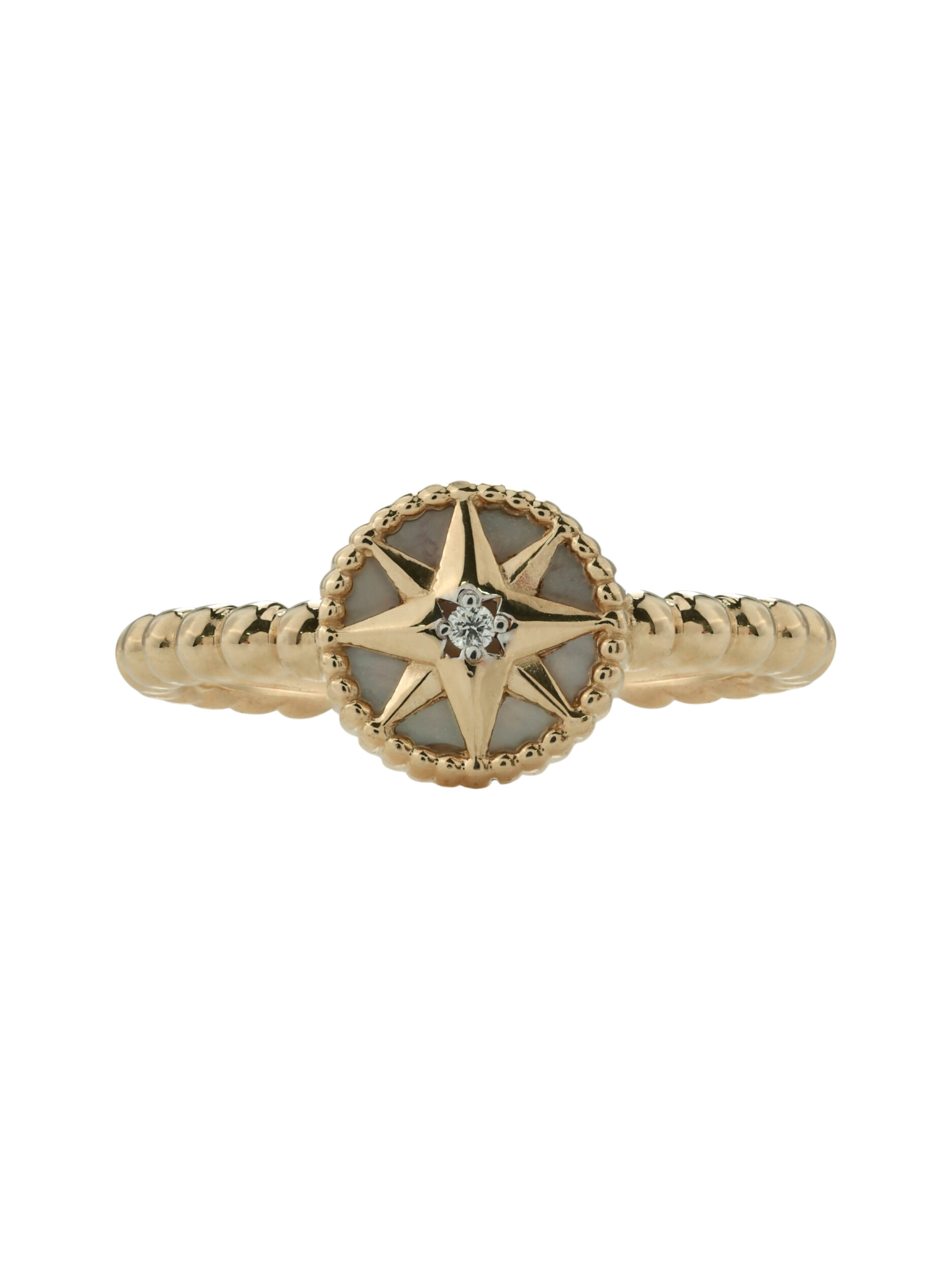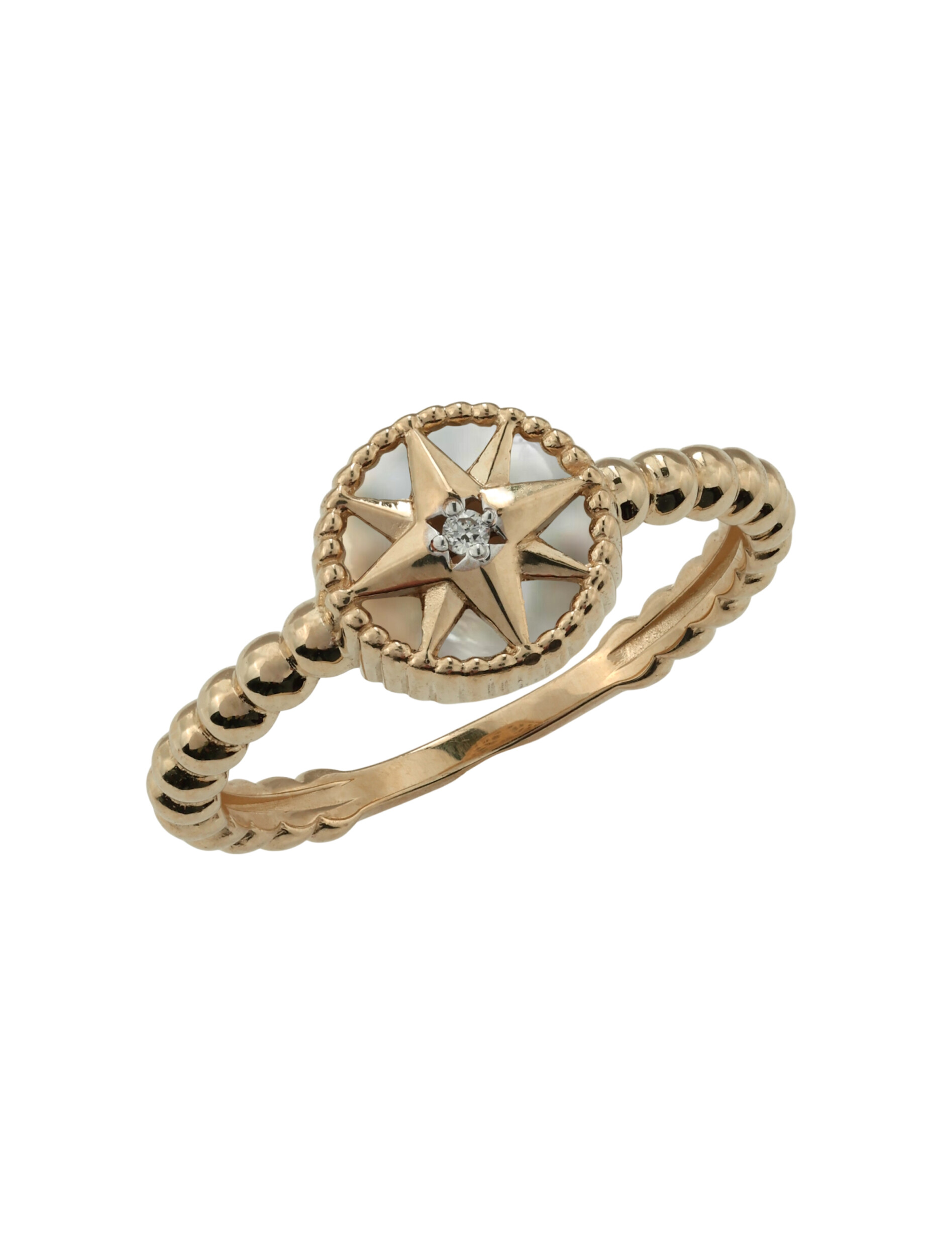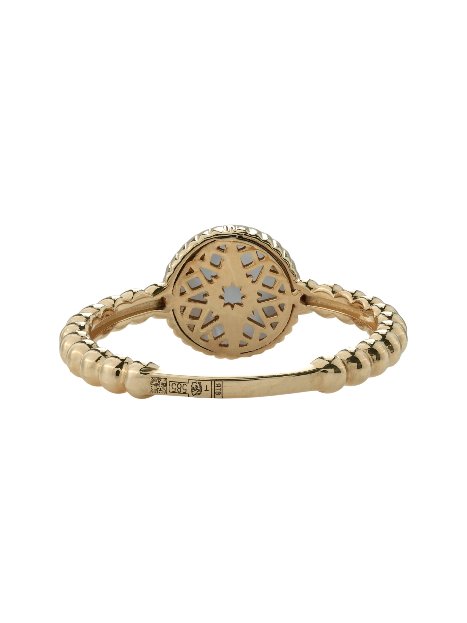 В центре композиции расположен круглый бриллиант, который ярко играет на свету, подчеркивая статусность владельца. Вставка из нежного перламутра с белым оттенком придает изделию мягкое перламутровое сияние и особый шарм. Шинка кольца имеет необычную фактурную форму, напоминающую изящную цепочку из бусин, что добавляет украшению визуальной легкости и оригинальности.