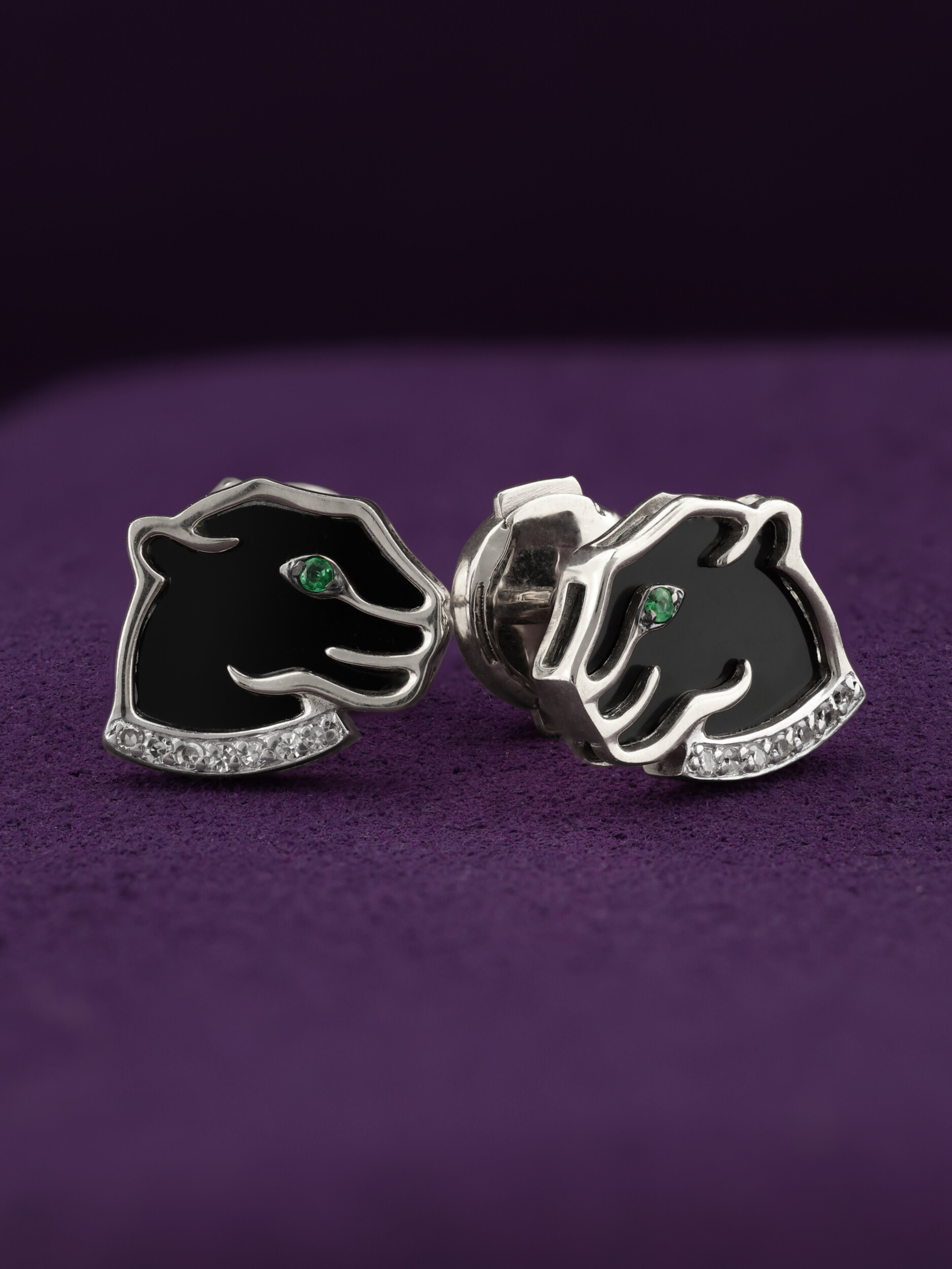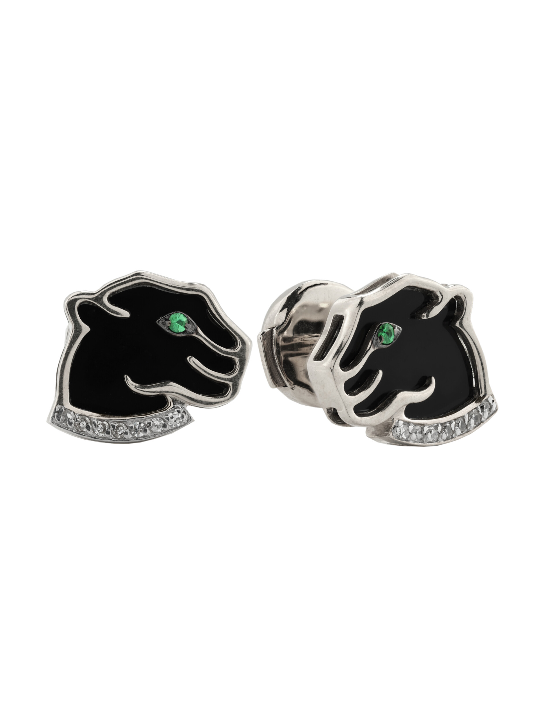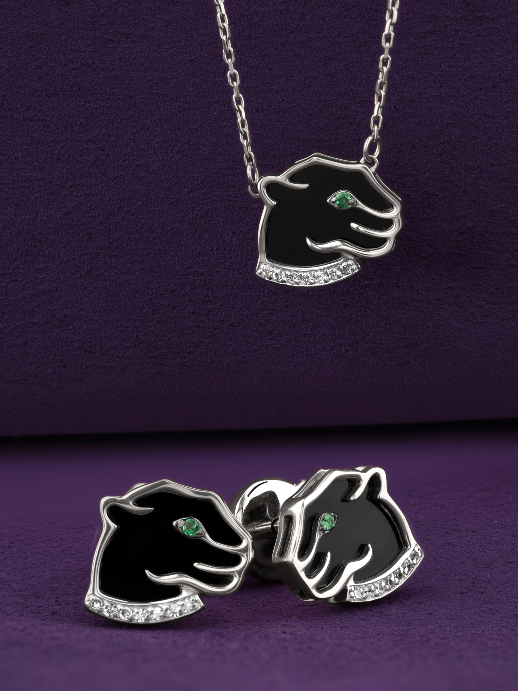 Композиция украшена 18 вставками, среди которых сочетаются драгоценные камни и минералы. Глубокий черный оникс создает идеальный контраст с блеском белых бриллиантов, а пронзительные изумруды зеленого цвета придают взгляду пумы особую выразительность и глубину. Все вставки имеют классическую круглую форму, которая идеально подчеркивает детализацию ювелирного изделия.