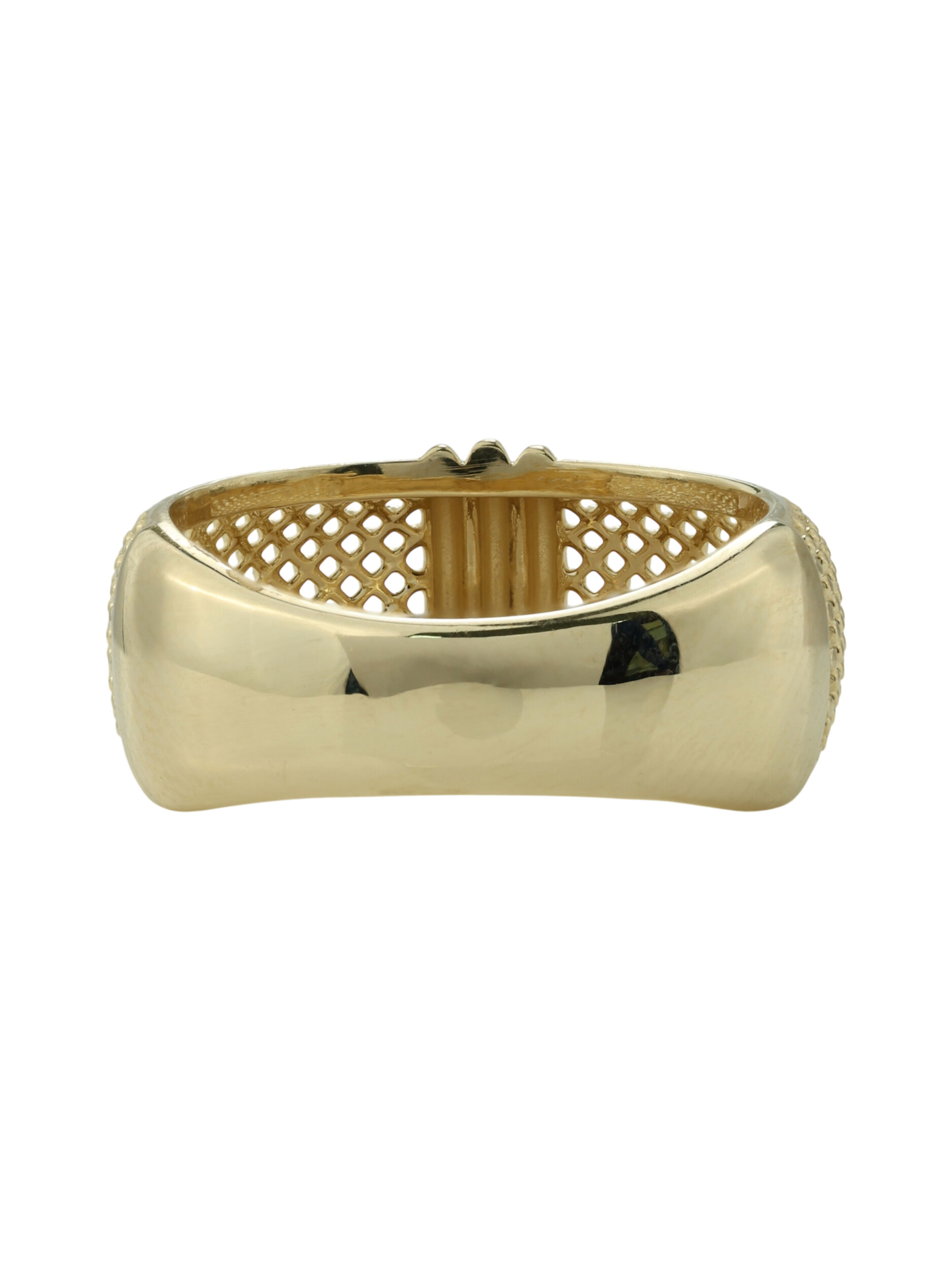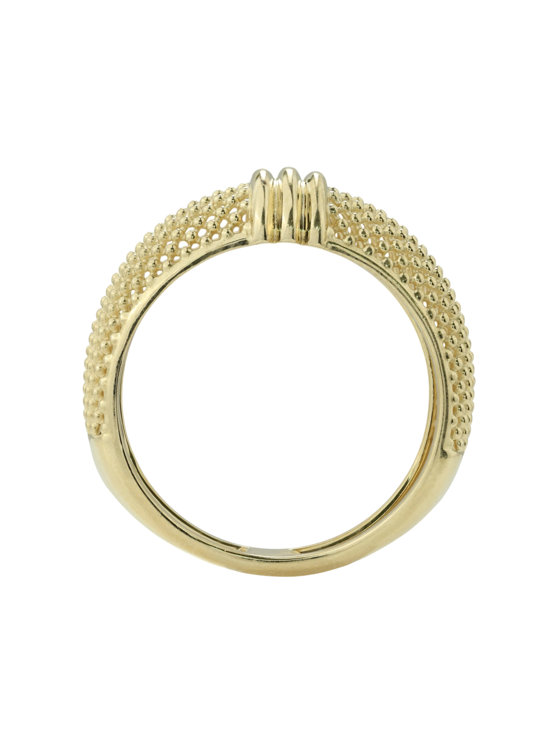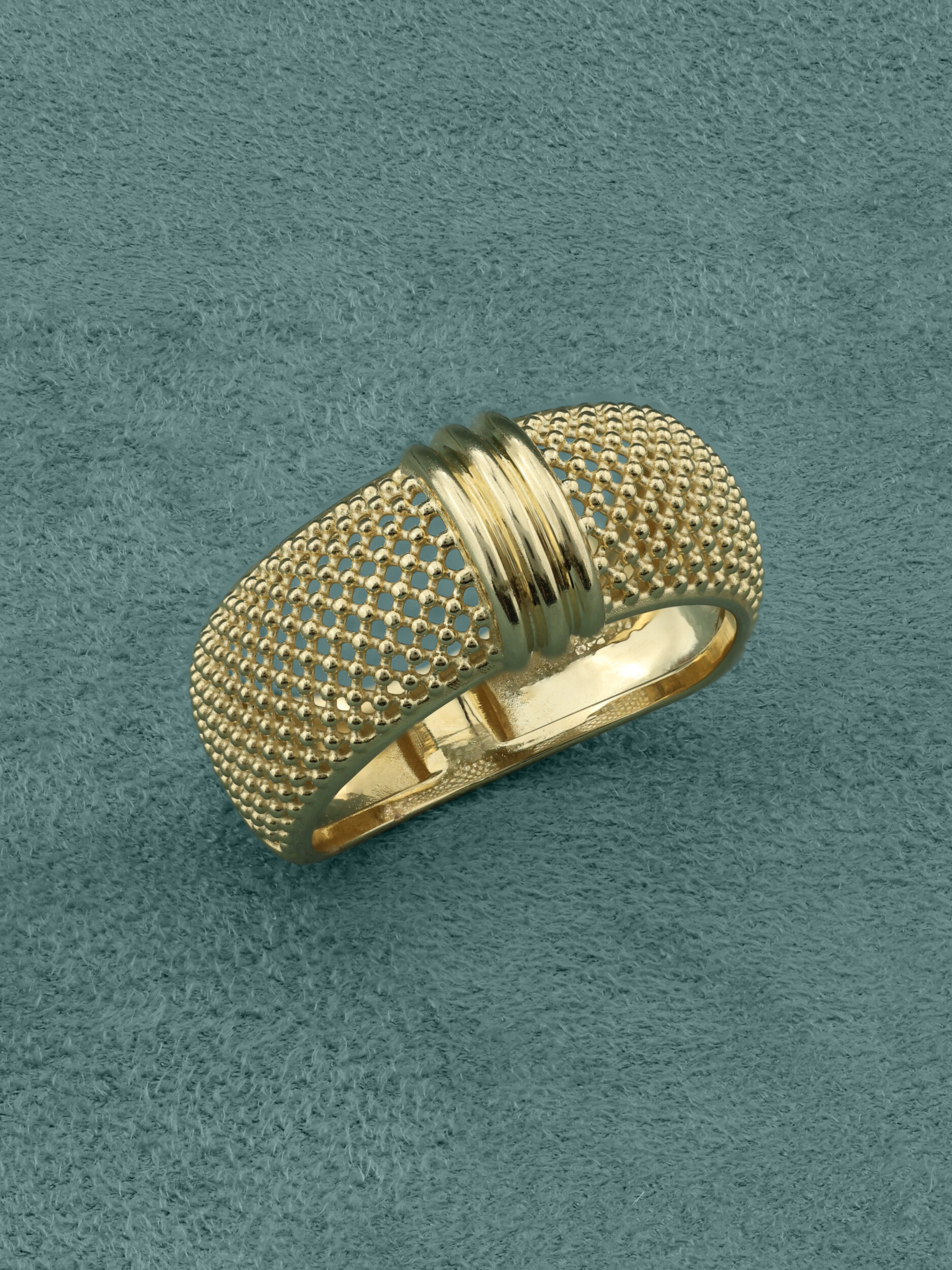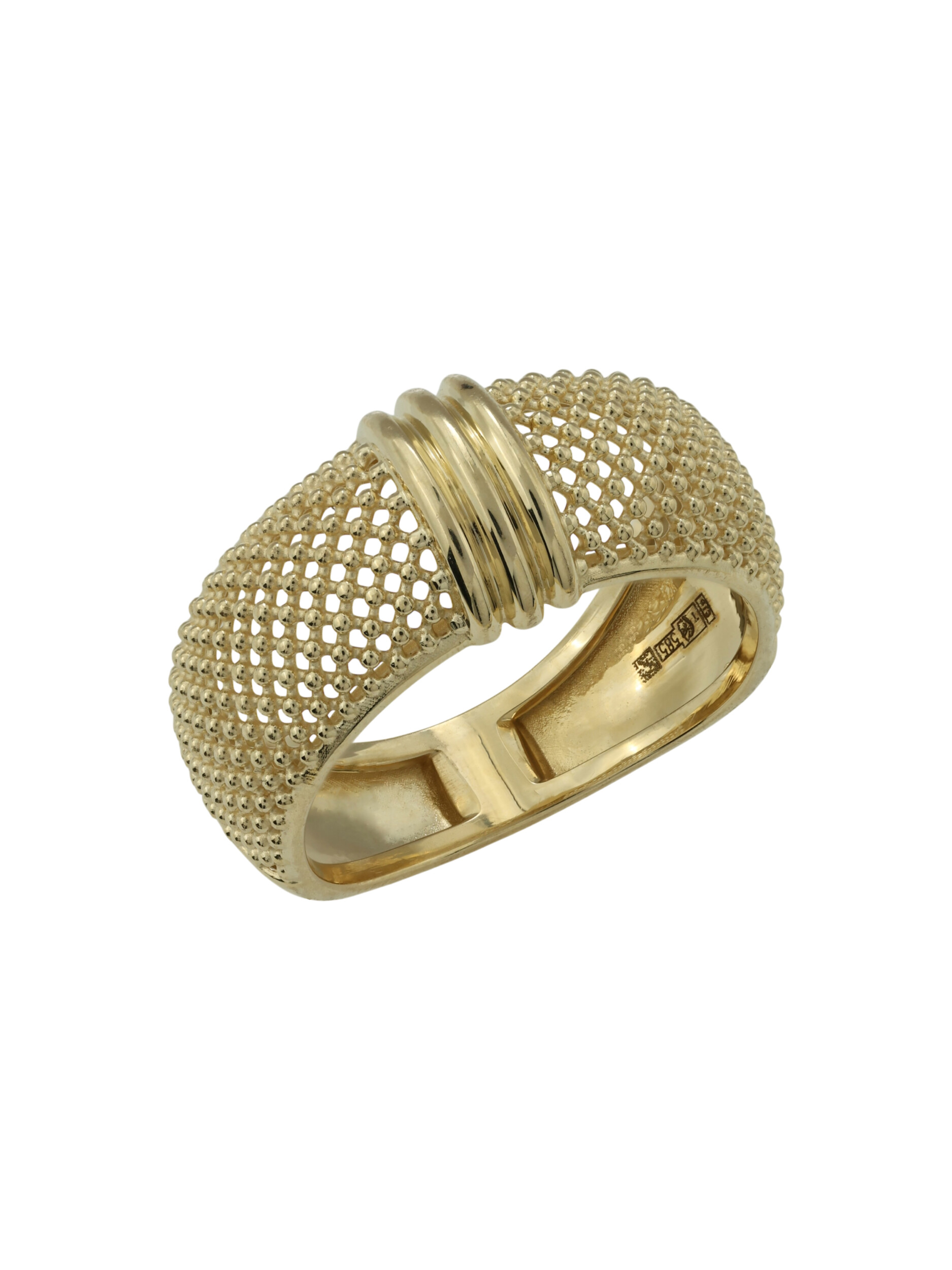 Кольцо из лимонного золота 585 пробы из коллекции Vioretty — Firenze — воплощение утонченного итальянского стиля. Это украшение притягивает взгляд своей фактурой: широкая шинка декорирована изысканным сетчатым узором, который эффектно контрастирует с гладкими полированными вставками. Лимонный оттенок золота придает изделию особое благородство и яркость, подчеркивая статус и безупречный вкус владельца.