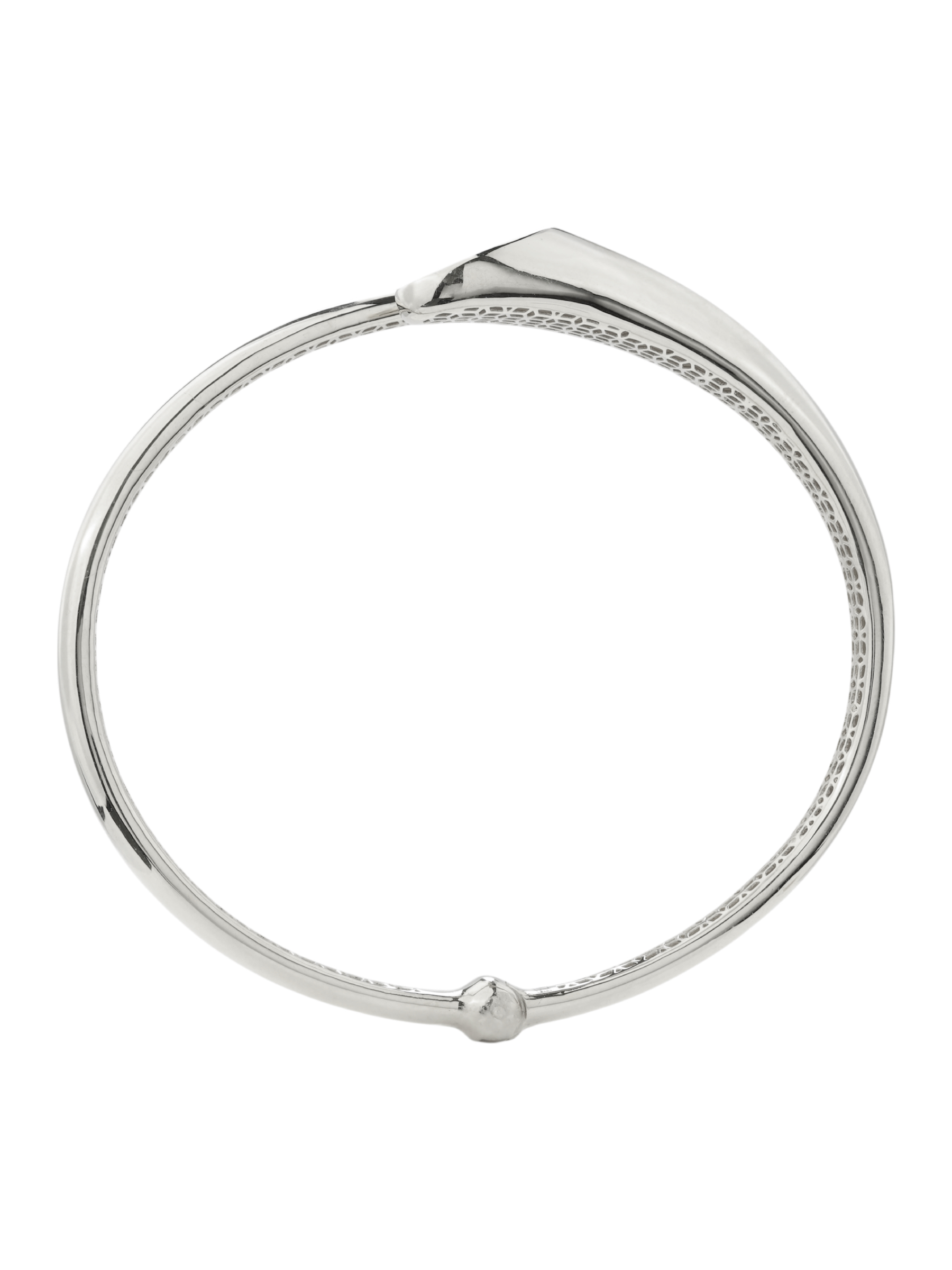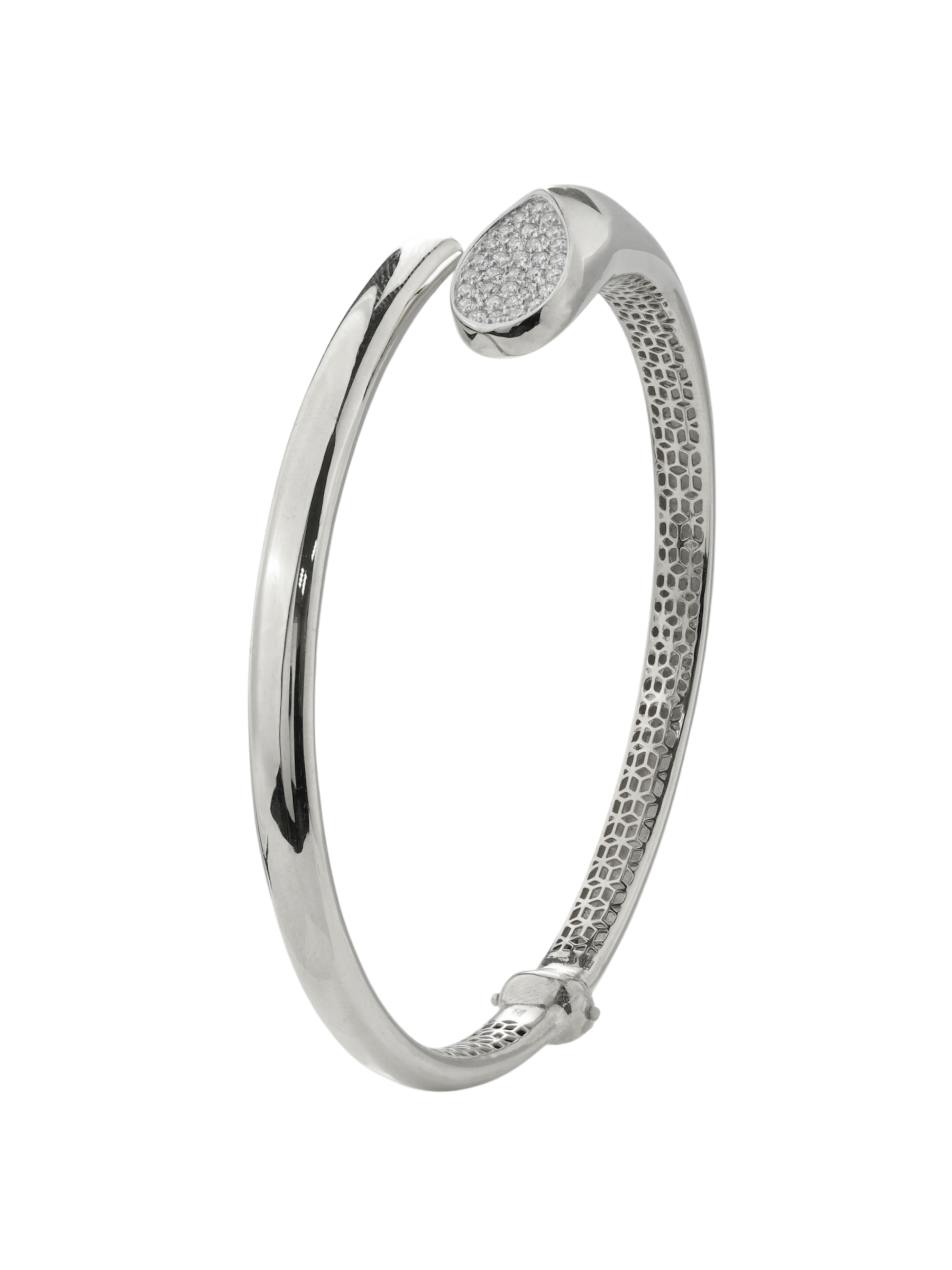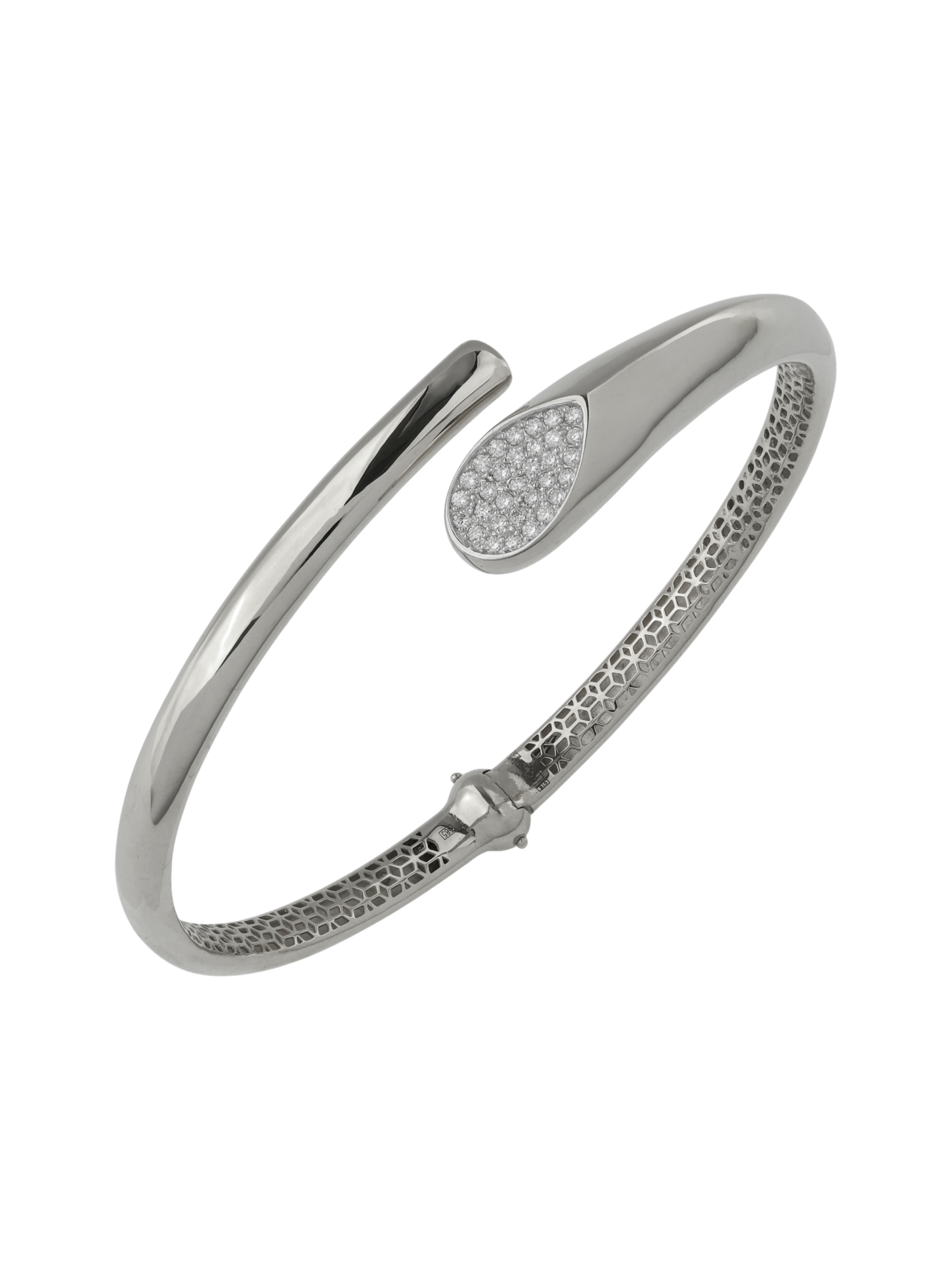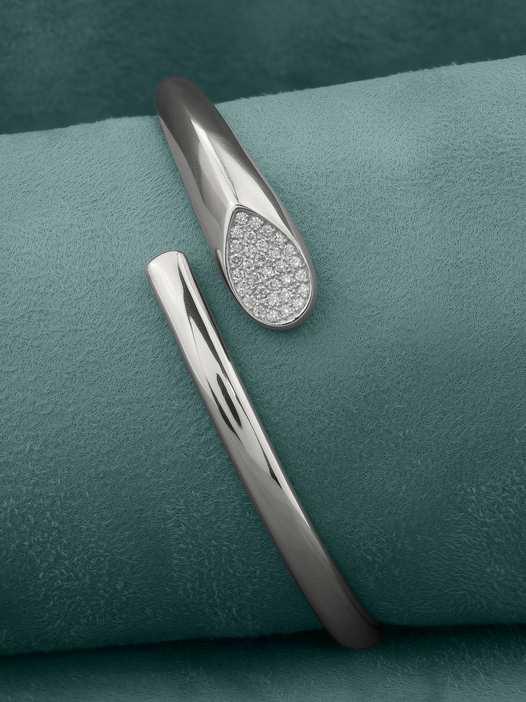 Центральным элементом композиции является изящная вставка, украшенная 32 бриллиантами круглой огранки. Белые камни гармонично перекликаются с благородным холодным блеском белого золота, создавая выразительный контраст и игру света. Плавные, современные линии изделия делают его универсальным аксессуаром для ценителей минимализма и высокого ювелирного стиля. Изделие представлено в 17 размере, что обеспечивает комфортную посадку на запястье.