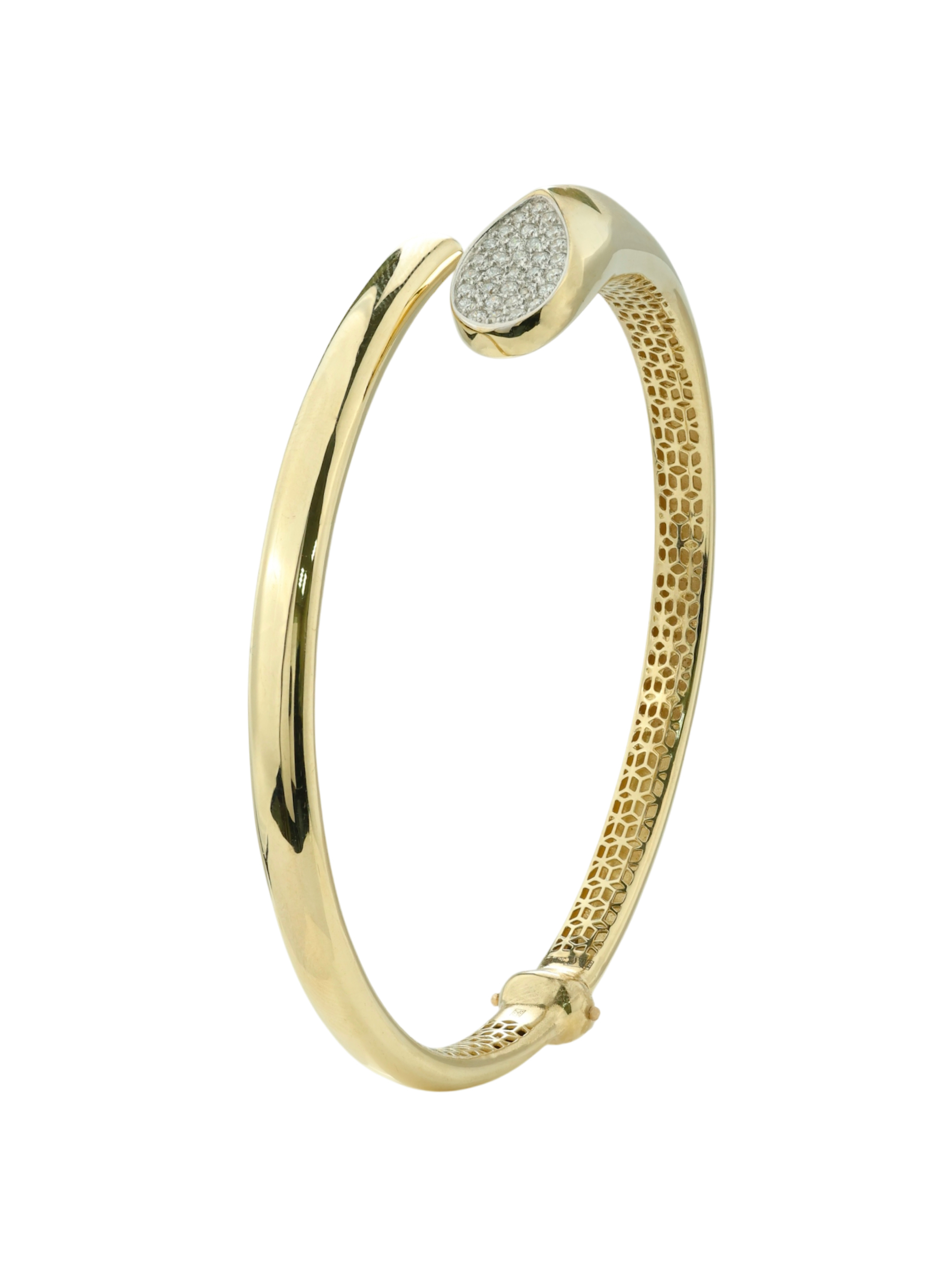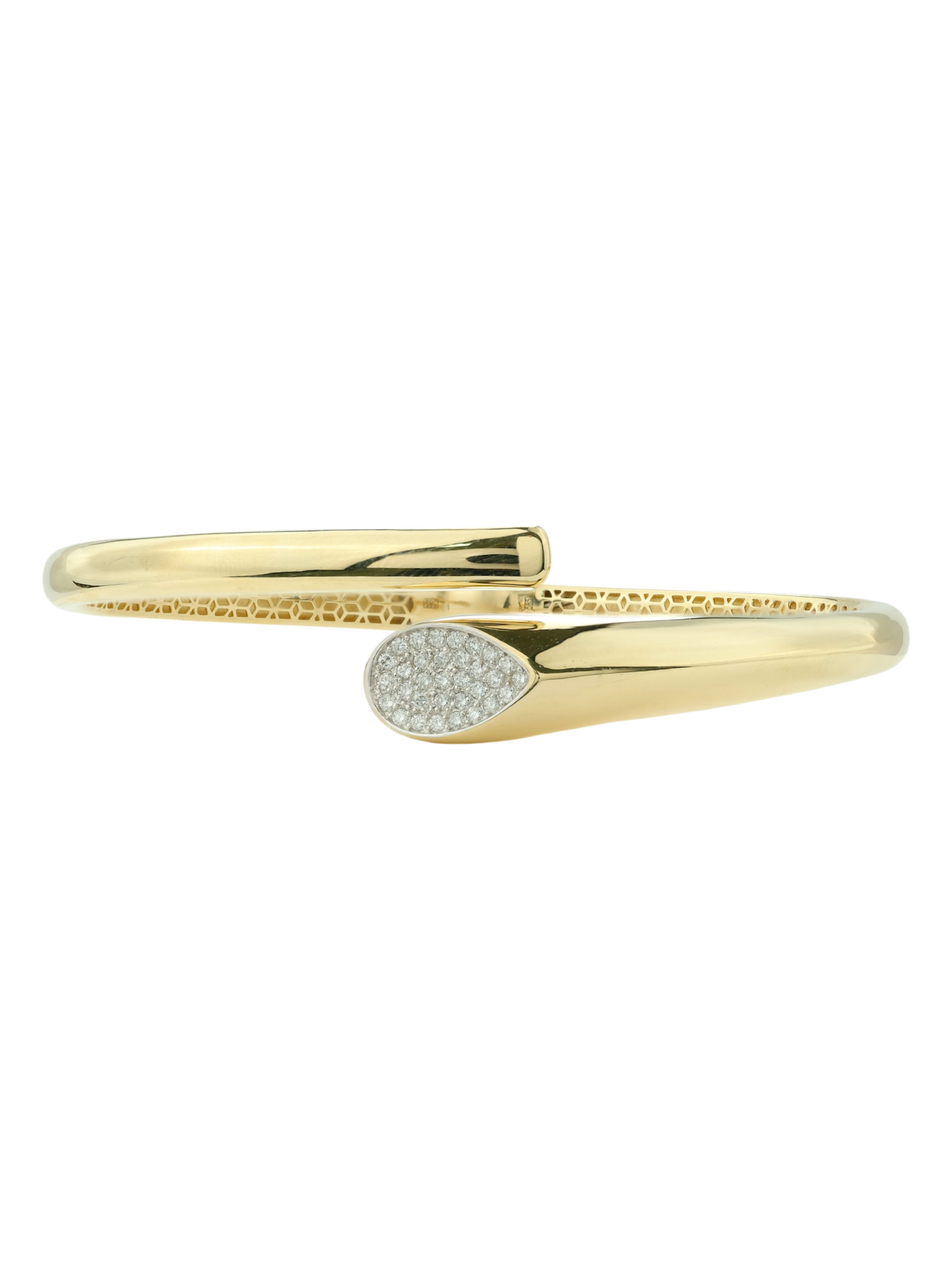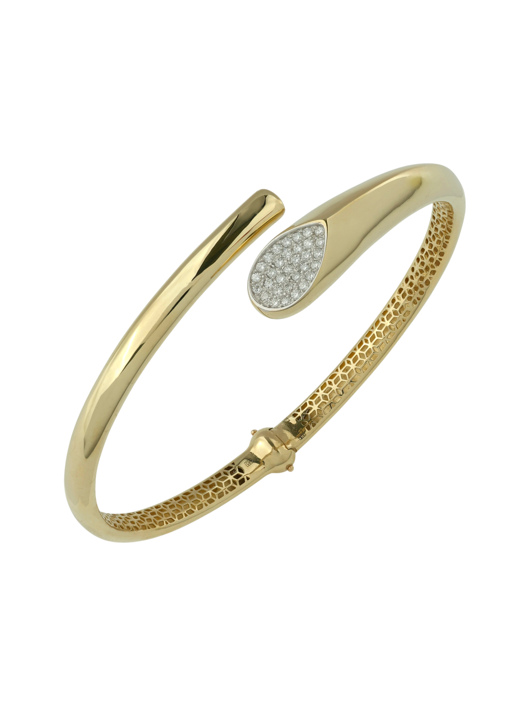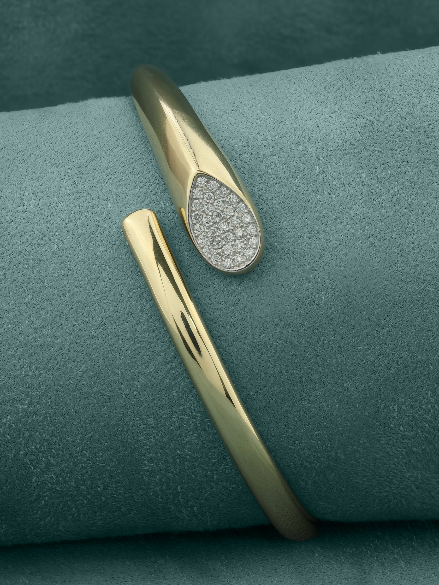 Центральным элементом композиции стали 32 бриллианта круглой формы с чистым белым цветом вставок. Их мерцание создает выразительный акцент на гладкой поверхности лимонного золота, превращая браслет в настоящее произведение ювелирного искусства. Продуманная форма изделия делает его универсальным аксессуаром: он одинаково гармонично дополнит как женский, так и мужской образ, добавляя нотку роскоши в повседневный или вечерний наряд.