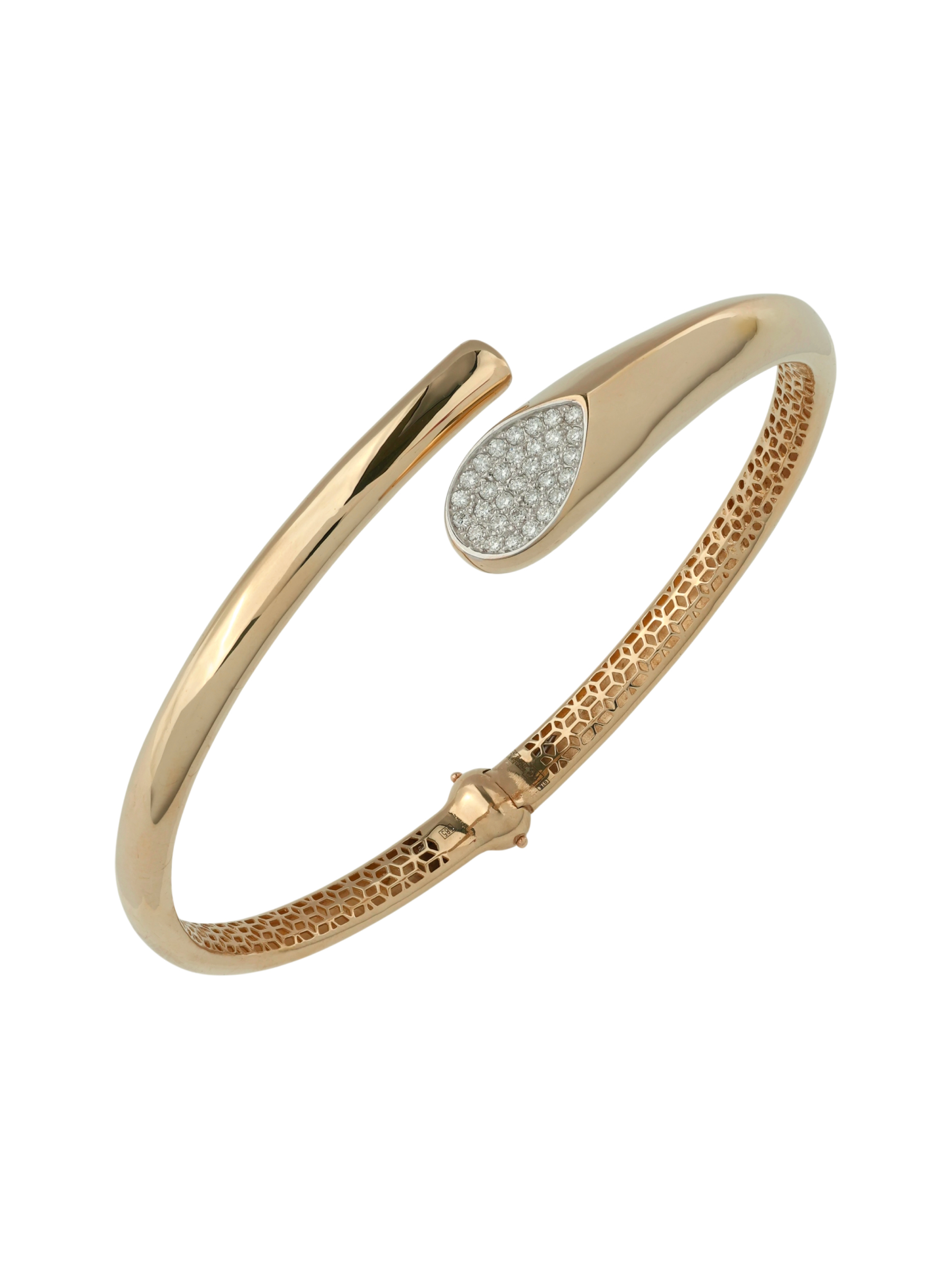 Центральный элемент композиции — выразительная декоративная вставка, декорированная 32 бриллиантами круглой огранки. Белый цвет вставок эффектно контрастирует с теплым сиянием красного золота, создавая гармоничный дуэт. Качественное исполнение и продуманная конструкция делают этот аксессуар комфортным для повседневного ношения.