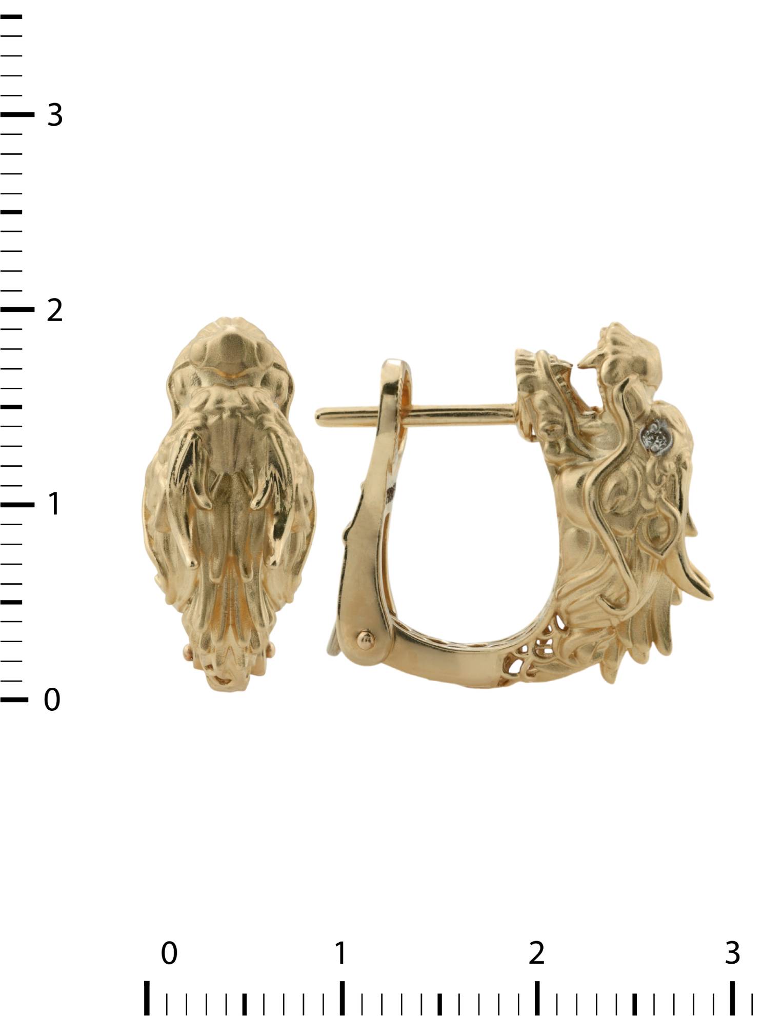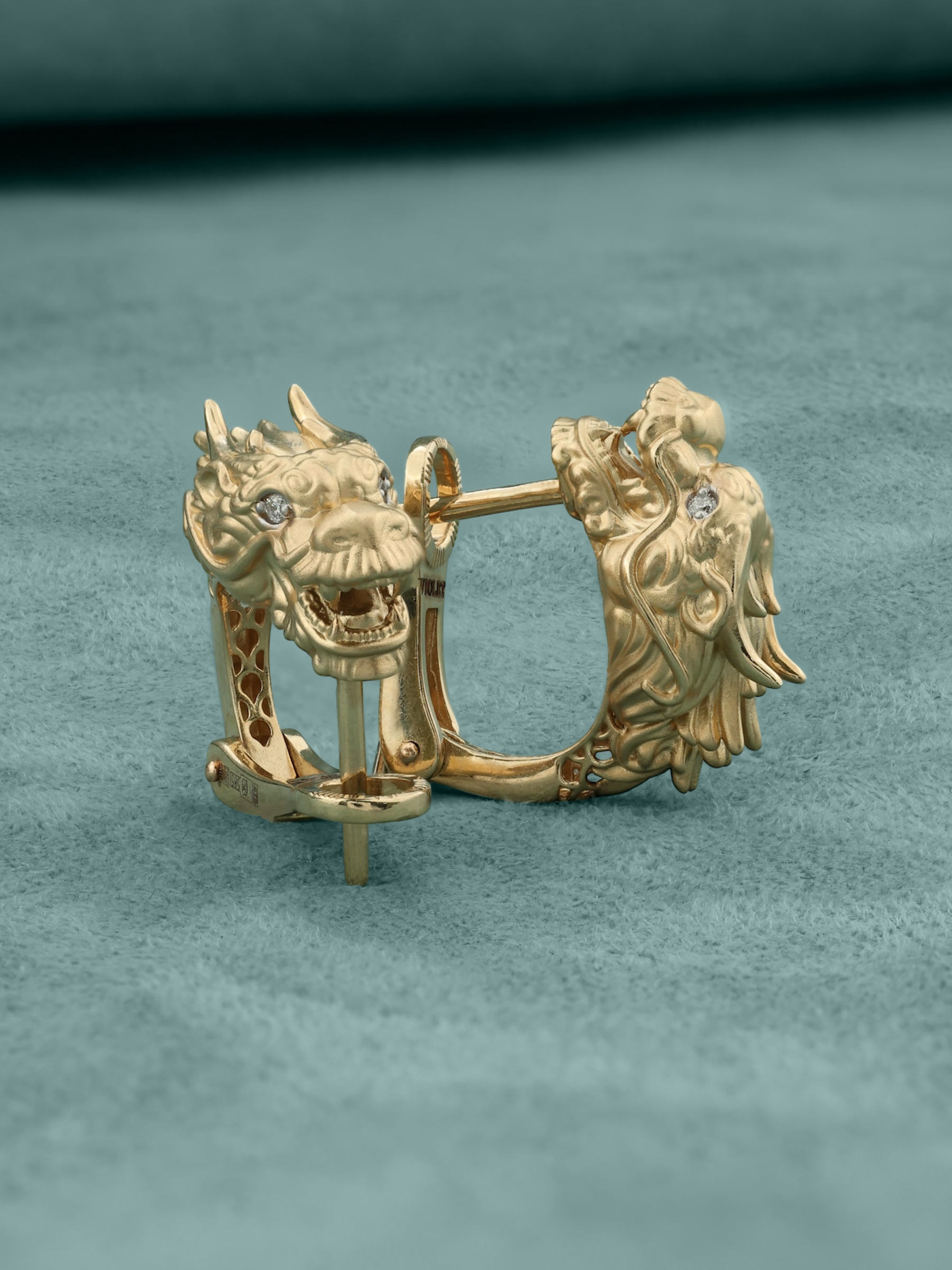 В дизайне модели акцент сделан на искусном сочетании фактур и блеска камней. В изделии использованы 4 бриллианта круглой огранки с чистым белым цветом, которые изящно подчеркивают детали драконьего облика, добавляя украшению благородное сияние. Красное золото теплого оттенка идеально подчеркивает проработанные линии декоративных элементов.
