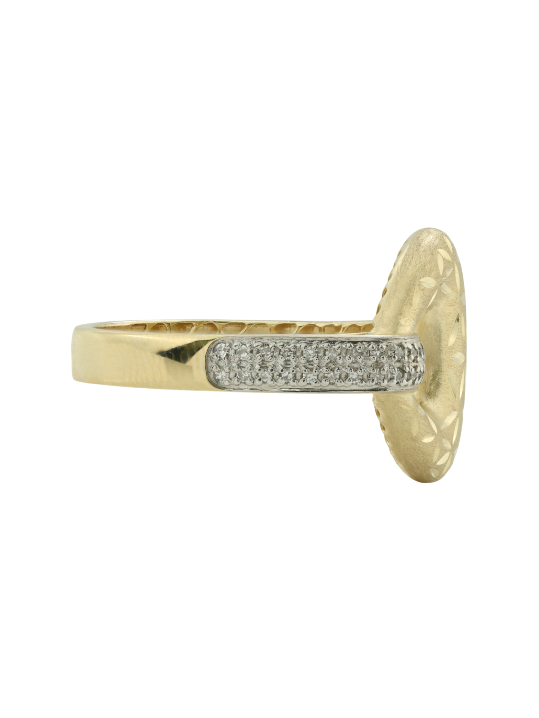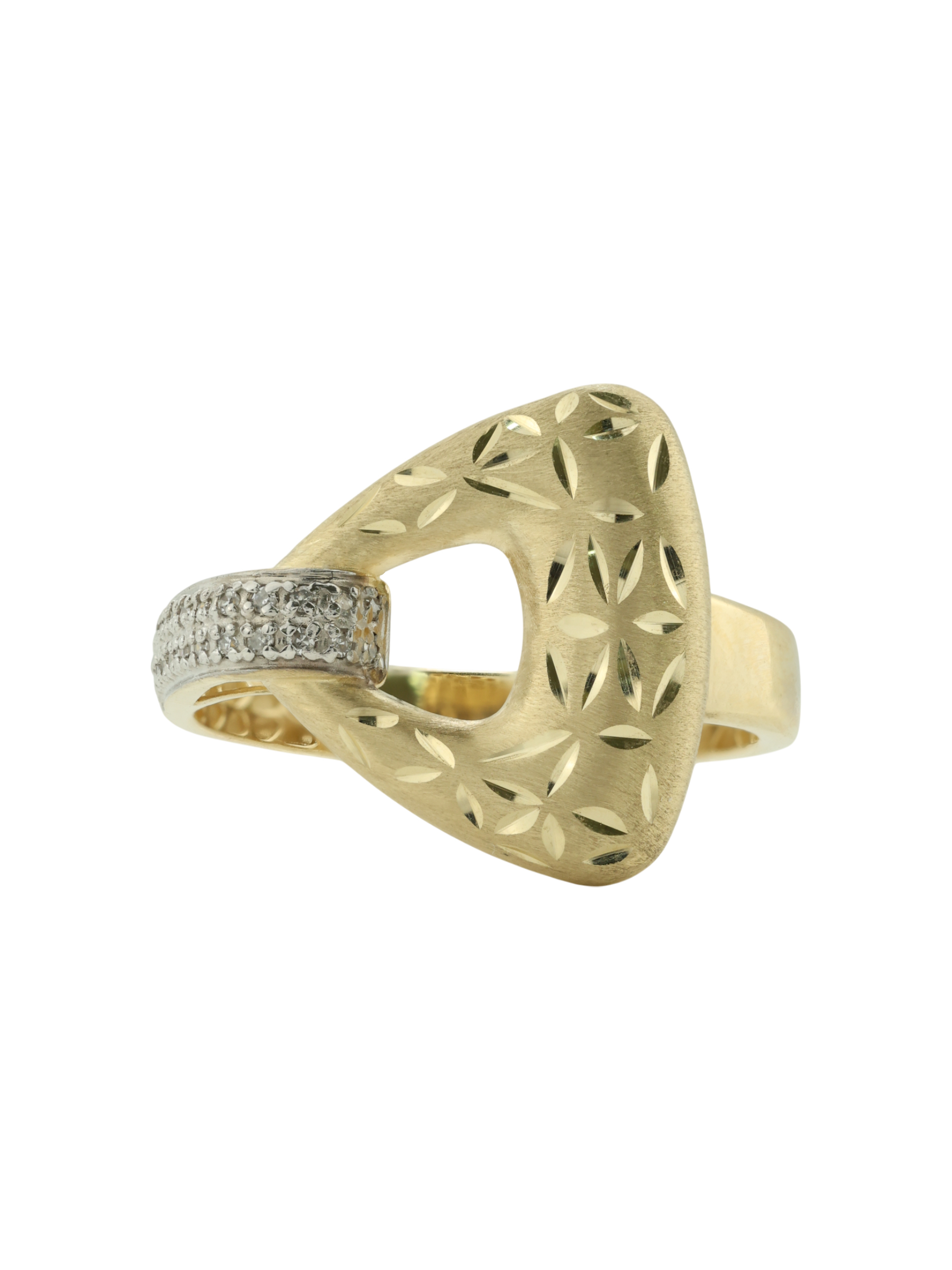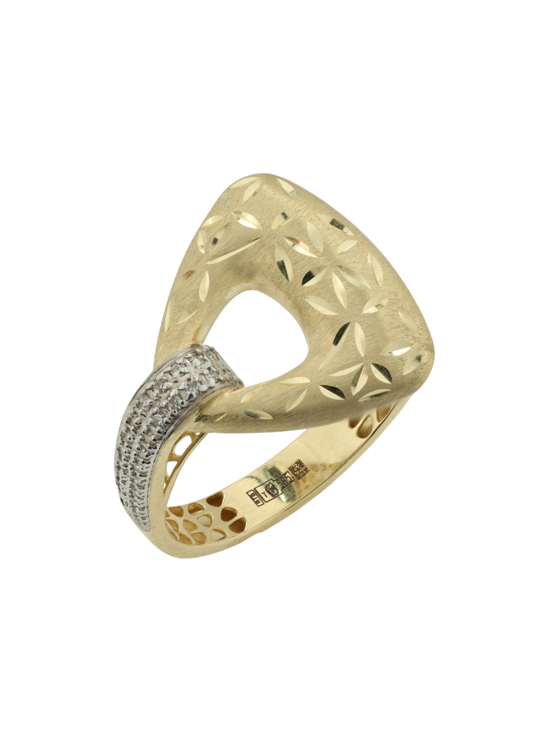 Основой изделия выступает благородное лимонное золото 585 пробы. Матовая фактура золотого элемента дополнена изящной гравировкой, которая придает украшению динамику и особое сияние при каждом движении. В качестве центрального акцента выступает инкрустация из 26 бриллиантов круглой огранки. Белый цвет вставок эффектно контрастирует с теплым оттенком лимонного золота, создавая гармоничную композицию, которая притягивает взгляд.