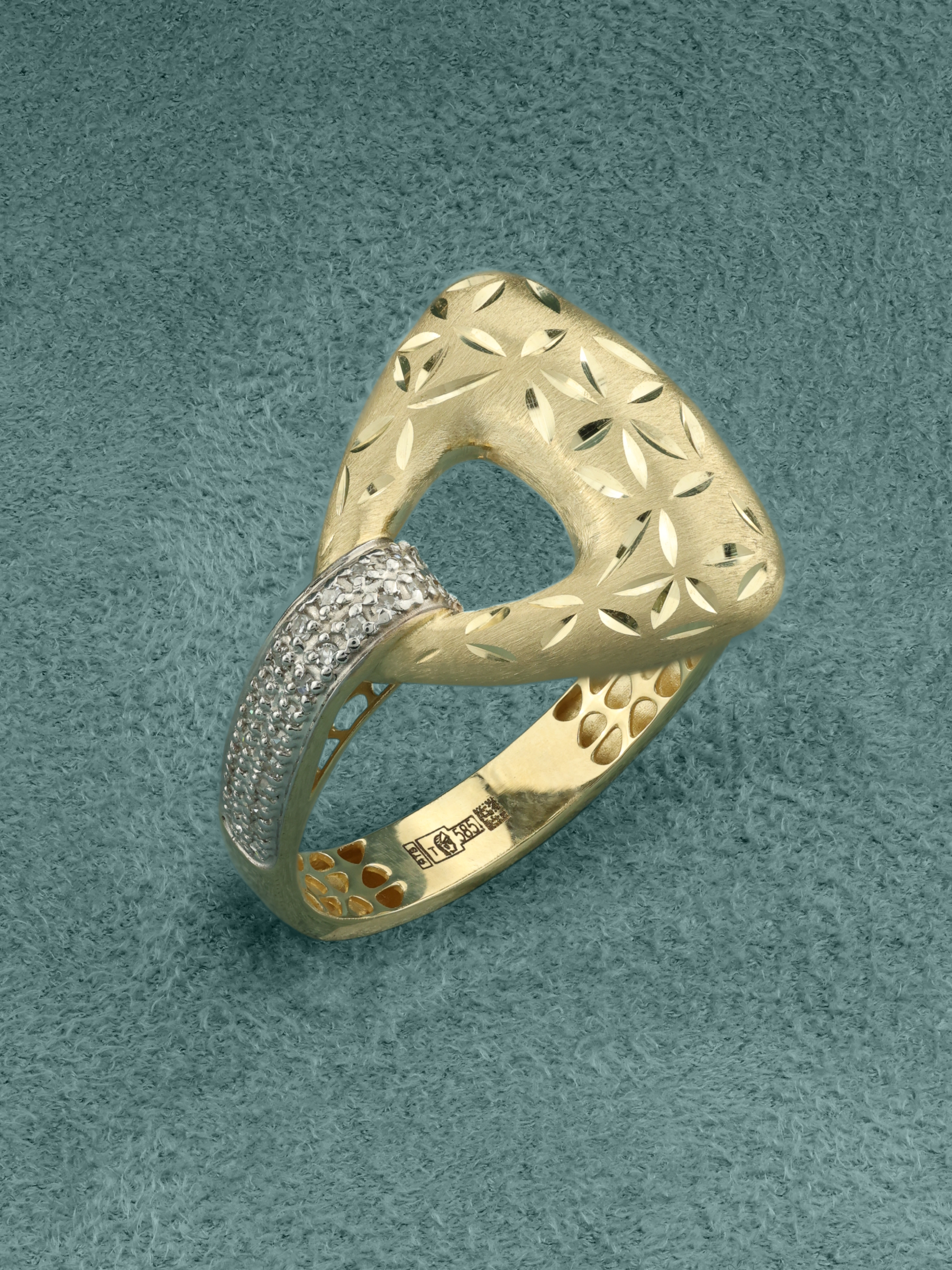 Кольцо из лимонного золота с бриллиантами — воплощение утонченного итальянского стиля, представленное в коллекции Vioretty — Milano. Это украшение создано для тех, кто ценит архитектурную выразительность и безупречное качество исполнения. Уникальный дизайн изделия сочетает в себе необычную геометрию форм и изысканность драгоценных камней, подчеркивая статус и индивидуальность владельца.