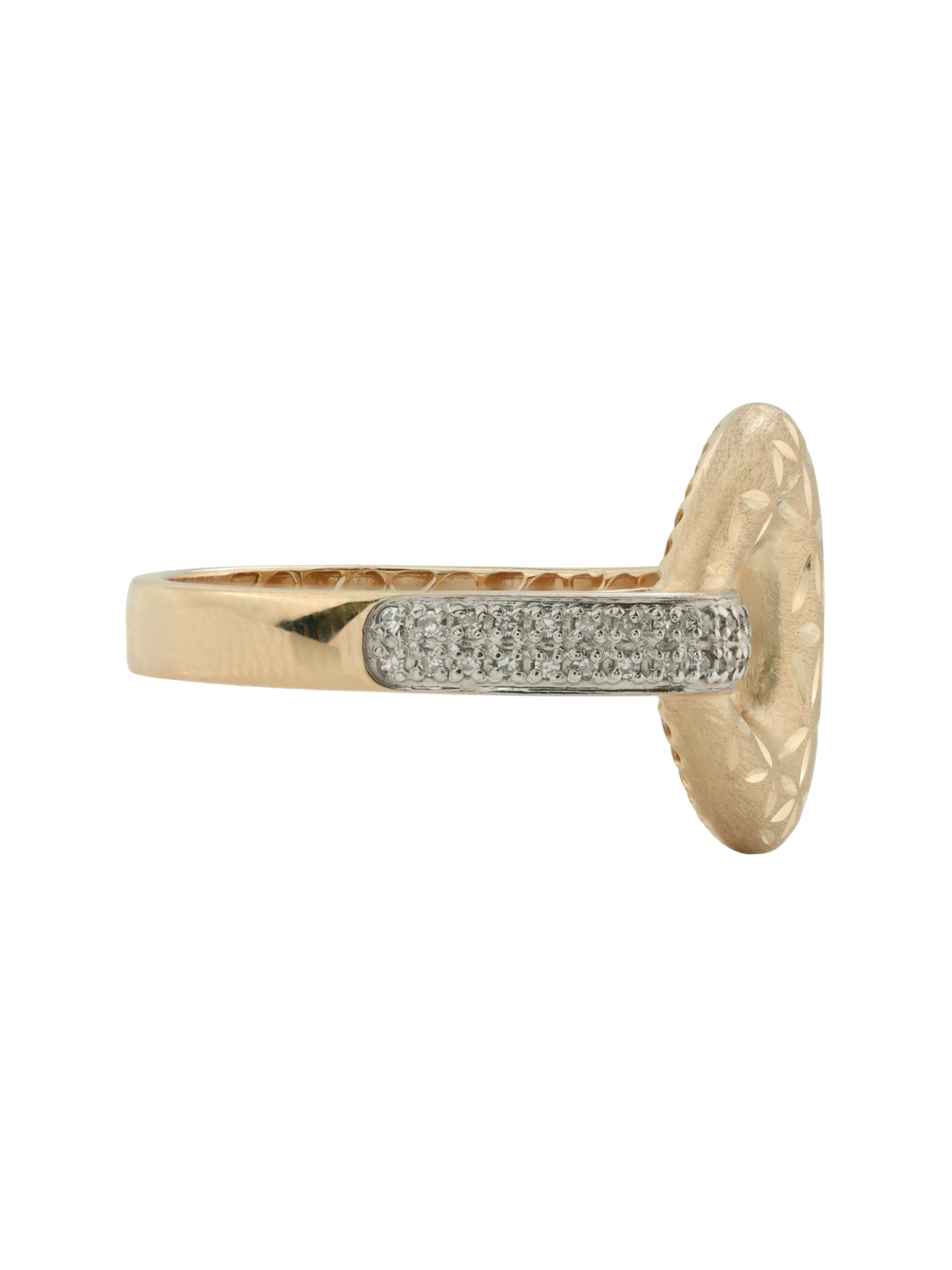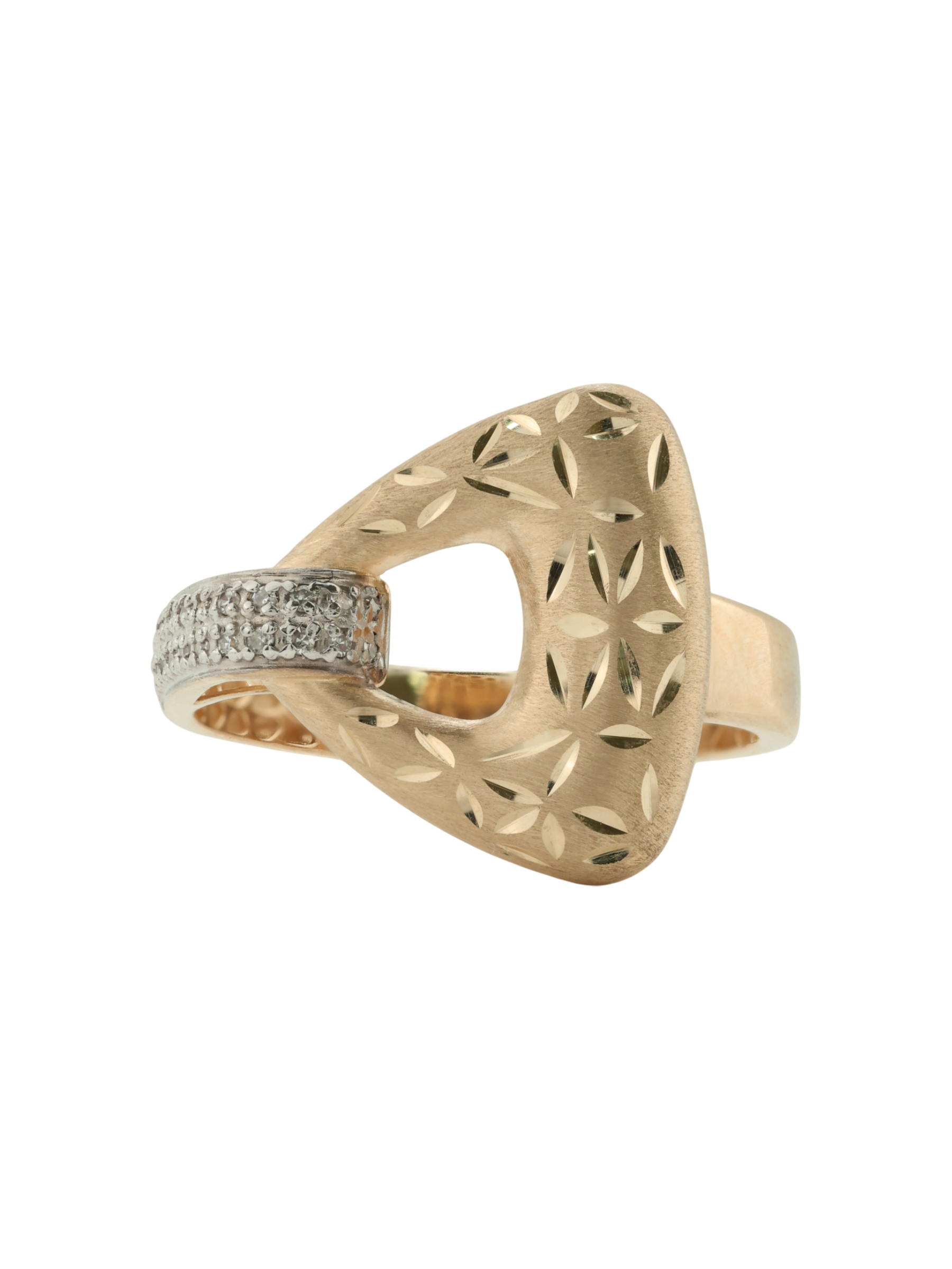 Центральным элементом дизайна является массивная декоративная часть треугольной формы с изящным узором, напоминающим цветочные лепестки. Эффект матовой поверхности контрастирует с блеском металла, создавая уникальную игру света. Широкая шинка кольца инкрустирована 26 круглыми бриллиантами с белыми вставками, которые добавляют изделию сияния и благородства. Это украшение универсально — оно подходит как для женщин, так и для мужчин, подчеркивая индивидуальность владельца.