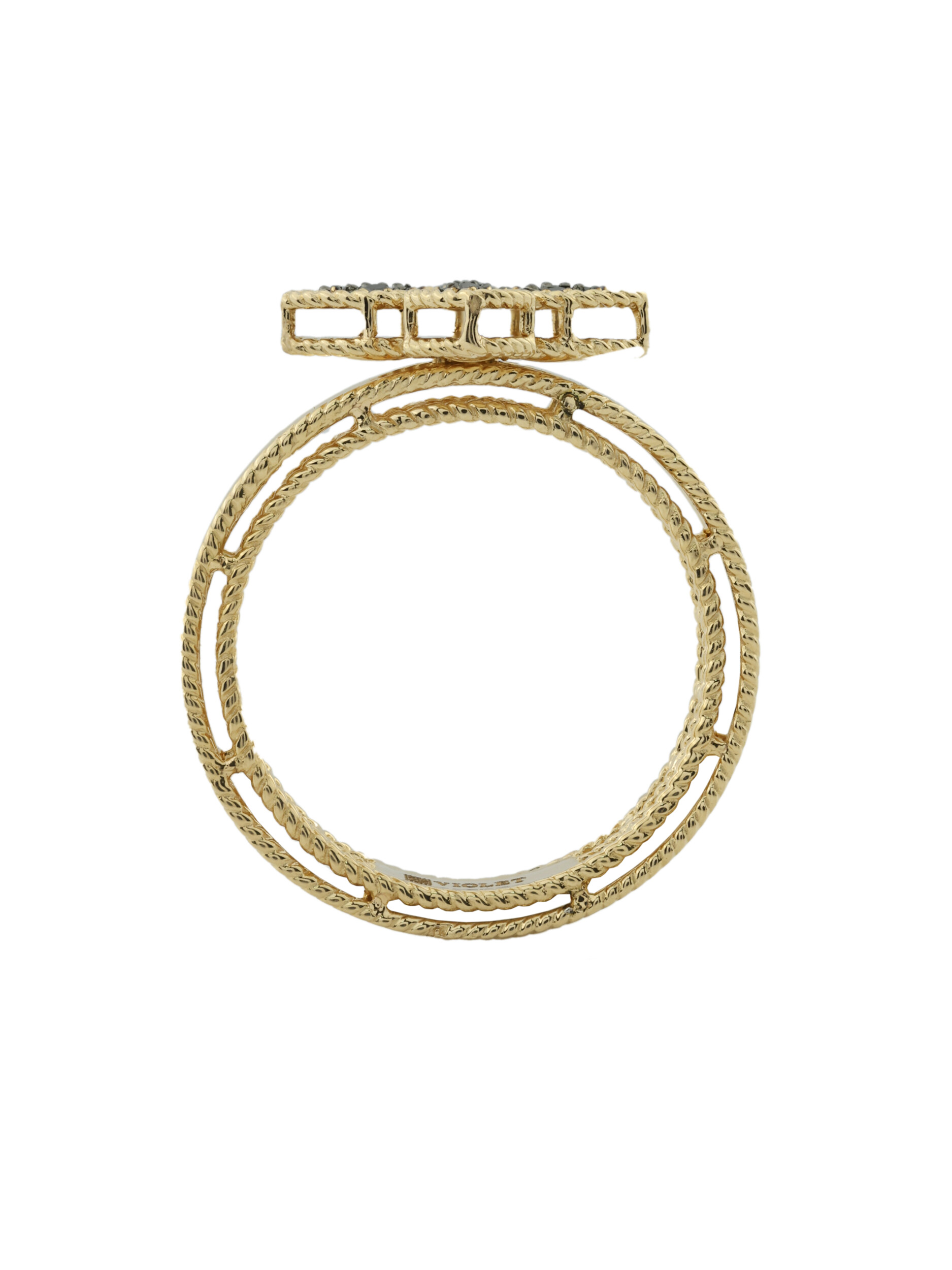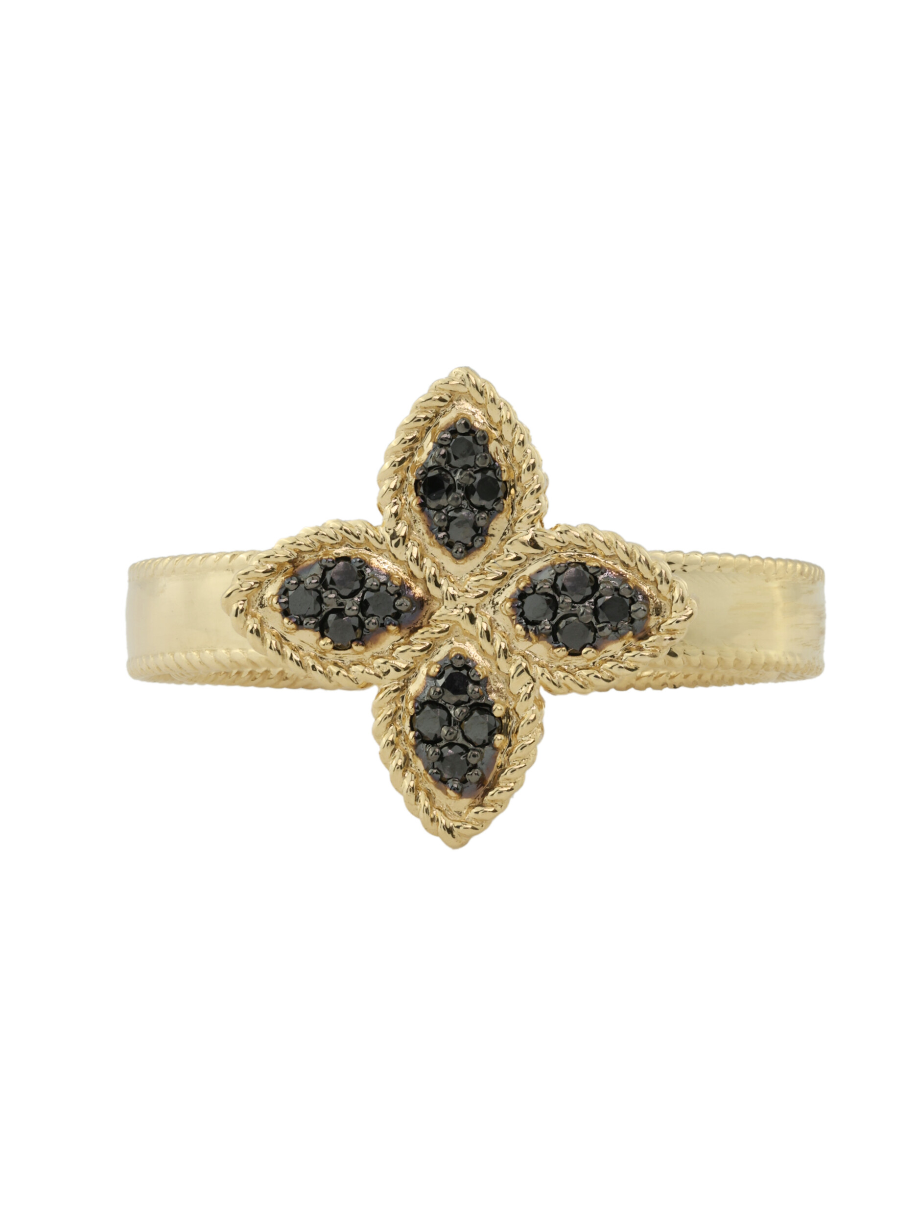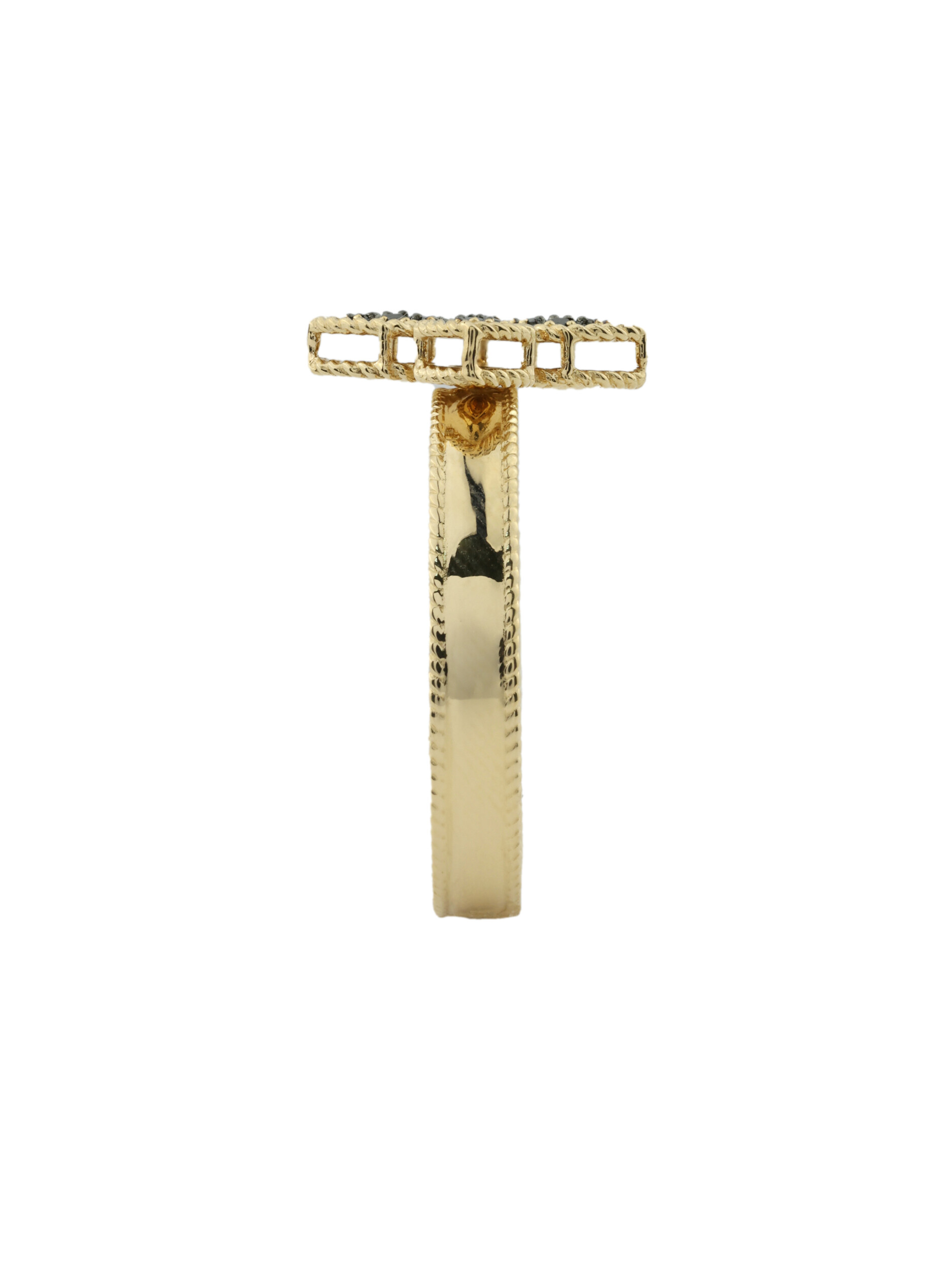 Центральный декоративный элемент украшен 16 черными бриллиантами круглой формы, которые создают завораживающую игру света на фоне лимонного металла. Детально проработанная фактура ободка и оправы подчеркивает высокий статус изделия, делая его универсальным дополнением к повседневному или вечернему образу. Это ювелирное изделие гармонично впишется в составные комплекты, позволяя создавать уникальные стилистические решения.
