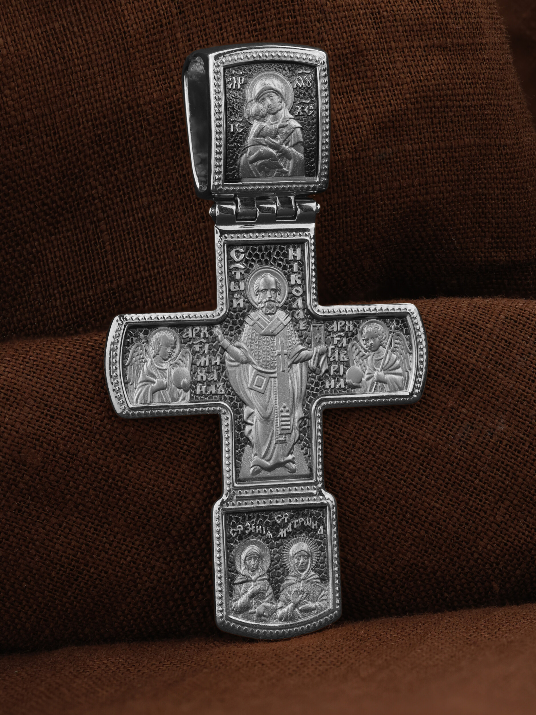 На кресте изображено Распятие Господа нашего Иисуса Христа. Ему предстоят Святая Мария Магдалина, Пресвятая Богородица, апостол Иоанн и Святой Иосиф, свидетели крестных страданий Господа. Вверху — икона Святой Троицы, на которой запечатлено явление Триединого Бога праотцу Аврааму в виде трех ангелов. В нижнем клейме изображено Чудо Святого Георгия о змие. Великомученик Георгий почитается как покровитель воинов, защитник от злых сил, помощник в духовной борьбе.