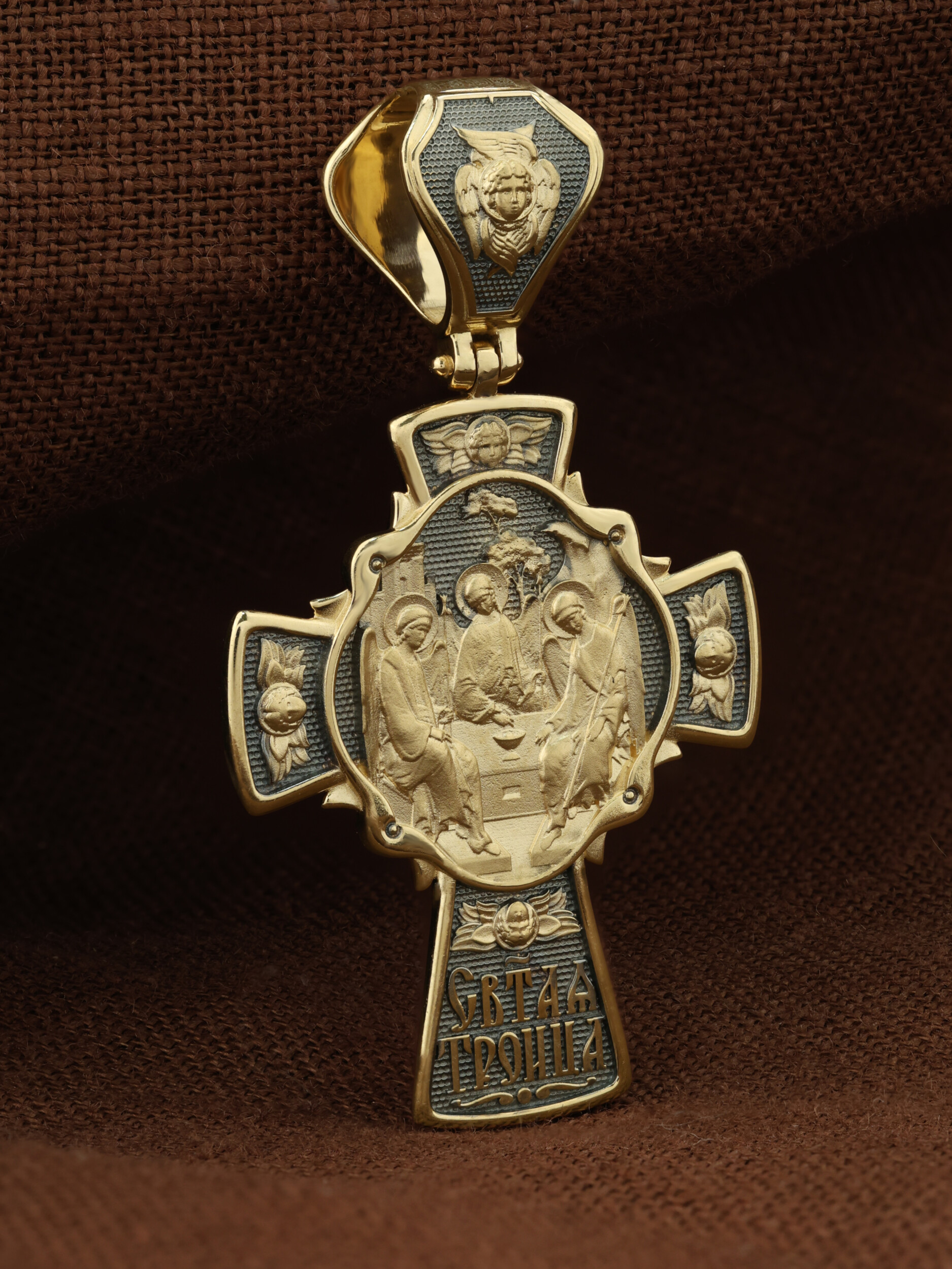 На оборотной стороне креста изображена икона Святой Троицы. На иконе изображены три ангела, являющихся образом Единосущного и Триипостасного Бога — Святой Троицы. Фигуры ангелов расположены так, что линии их фигур образуют как бы замкнутый круг. Три ангела безмятежно и неторопливо ведут беседу. Их позы непринужденны, одежды просты и свободны. В руках у них скипетры, символы власти. В центре иконы — чаша, как символ страданий Христа. За центральной фигурой — древо жизни, а левее от него — здание, символизирующее церковь. В правом верхнем углу изображена гора, как искупление падшего мира, прототип Голгофы, на которую взойдет Иисус. Единство трёх ипостасей Святой Троицы является совершенным прообразом всякого единения и любви — «Да будут все едино, как Ты, Отче, во Мне, и Я в Тебе, так и они да будут в Нас едино» (Ин.17:21). На кулонном кольце изображен шестикрылый Ангел — Серафим.