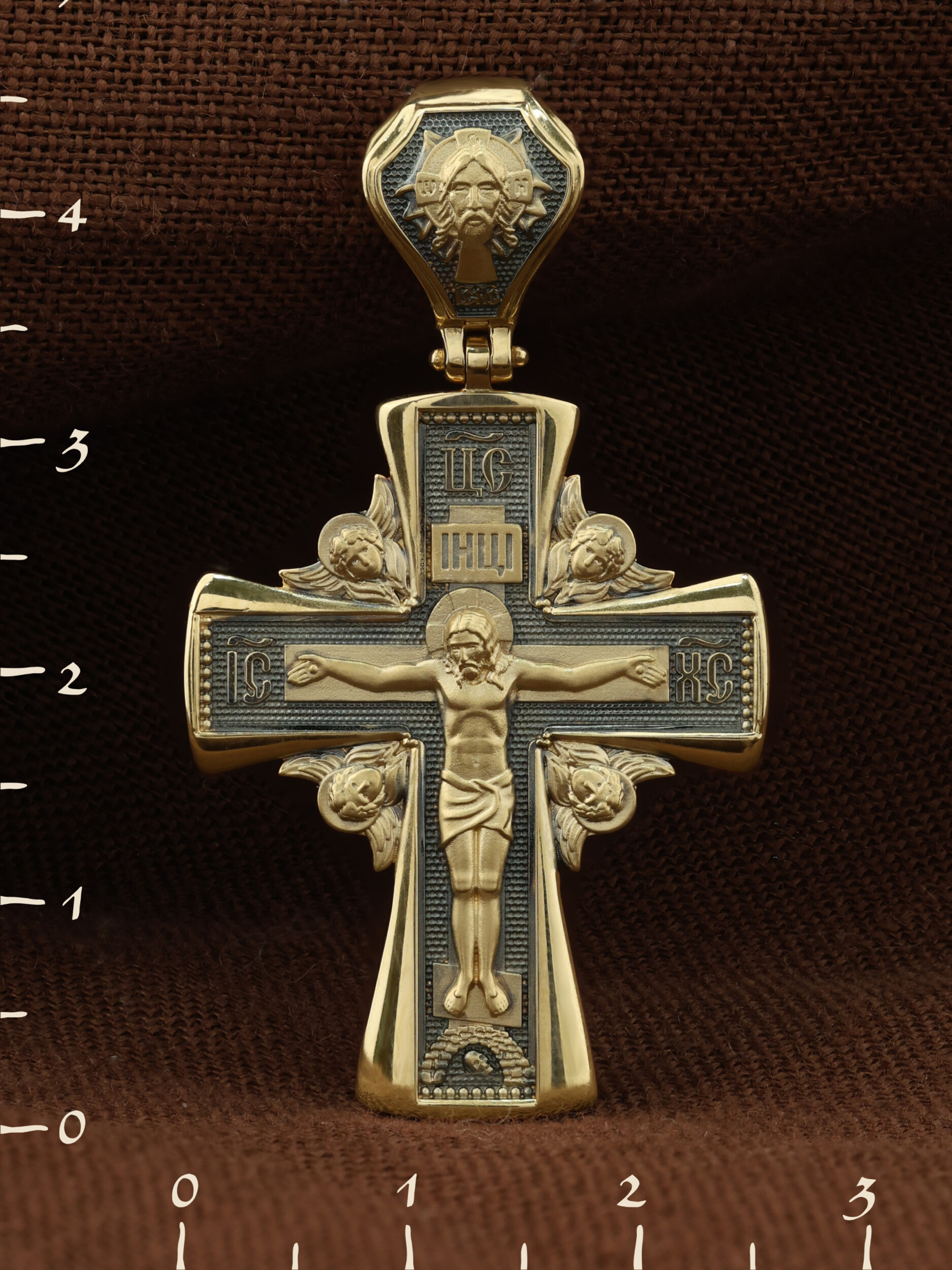 На лицевой стороне креста изображено Распятие Господа и Спасителя нашего Иисуса Христа, отдавшего Себя на смерть, для искупления грехов мира. Крест является символом жертвенной любви Всеблагого Бога к падшим людям, всепобеждающим духовным оружием христиан, основанием и средоточием церковной жизни. Господь сказал: кто хочет идти за Мною, отвергнись себя, и возьми крест свой, и следуй за Мною. (Мк. 8: 34). Над Распятием помещена надпись «Царь Славы». На верхней табличке, выше головы Иисуса, расположена надпись, составленная Понтием Пилатом — «IНЦI». Она означает «Иисус Назорей, Царь Иудейский». Надпись «IC» «ХC», означает Иисус Христос, помещается на разных сторонах поперечной перекладины креста. Возвышение, на котором стоит Крест, символизирует гору Голгофу, на которой произошло Распятие. Под подножием Креста изображена покоящаяся голова (череп) Адама. На кулонном кольце изображен Нерукотворный образ Господа и Спасителя нашего Иисуса Христа, чудесно отпечатавшийся на плате, которым Христос вытер свой лик.