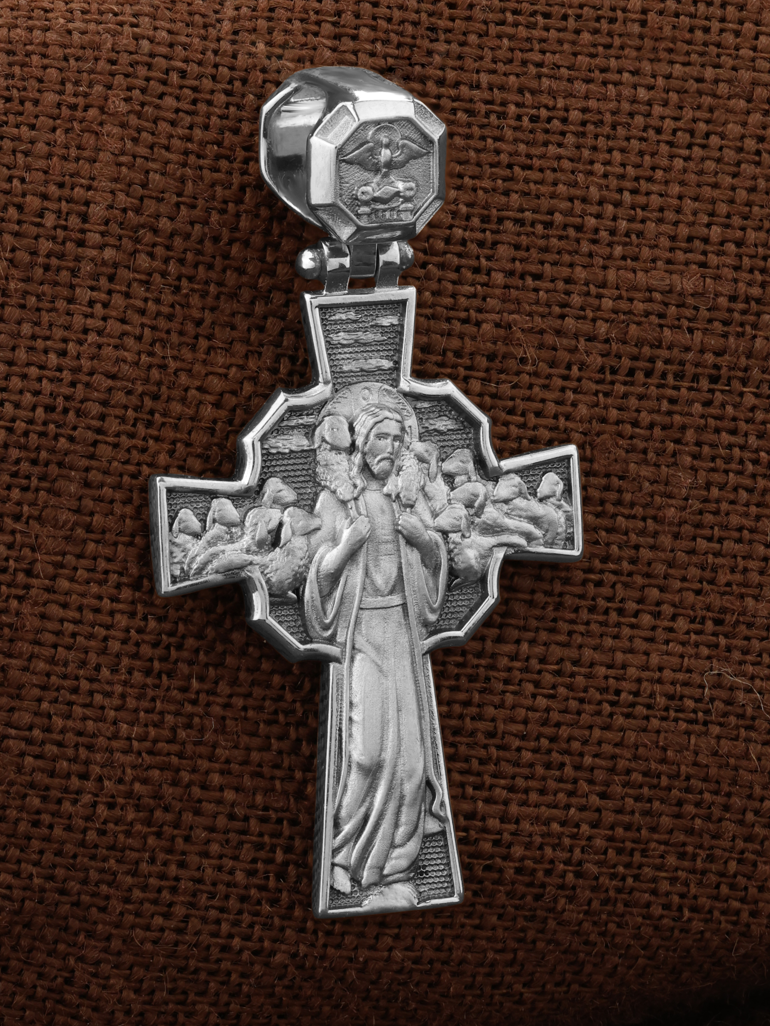 Но обратной стороне креста изображение Иисуса Христа. Добрый Пастырь — символическое именование и изображение Иисуса Христа, заимствованное из Ветхого Завета и повторенное Христом в Новом Завете в своей роли учителя. Иисус изображается с заблудшей овцой, вскинутой на плечи (Лк. 15:3−7).