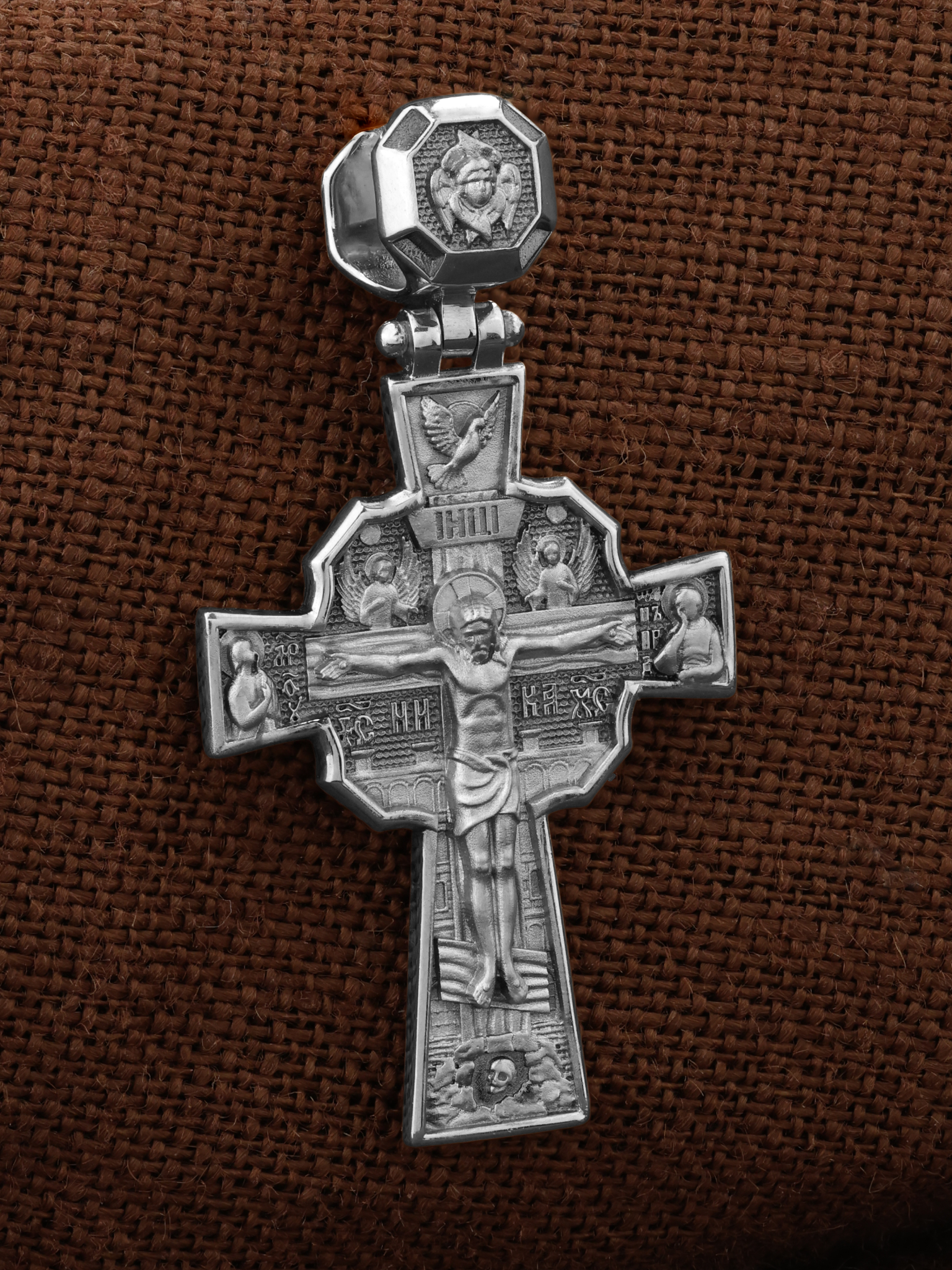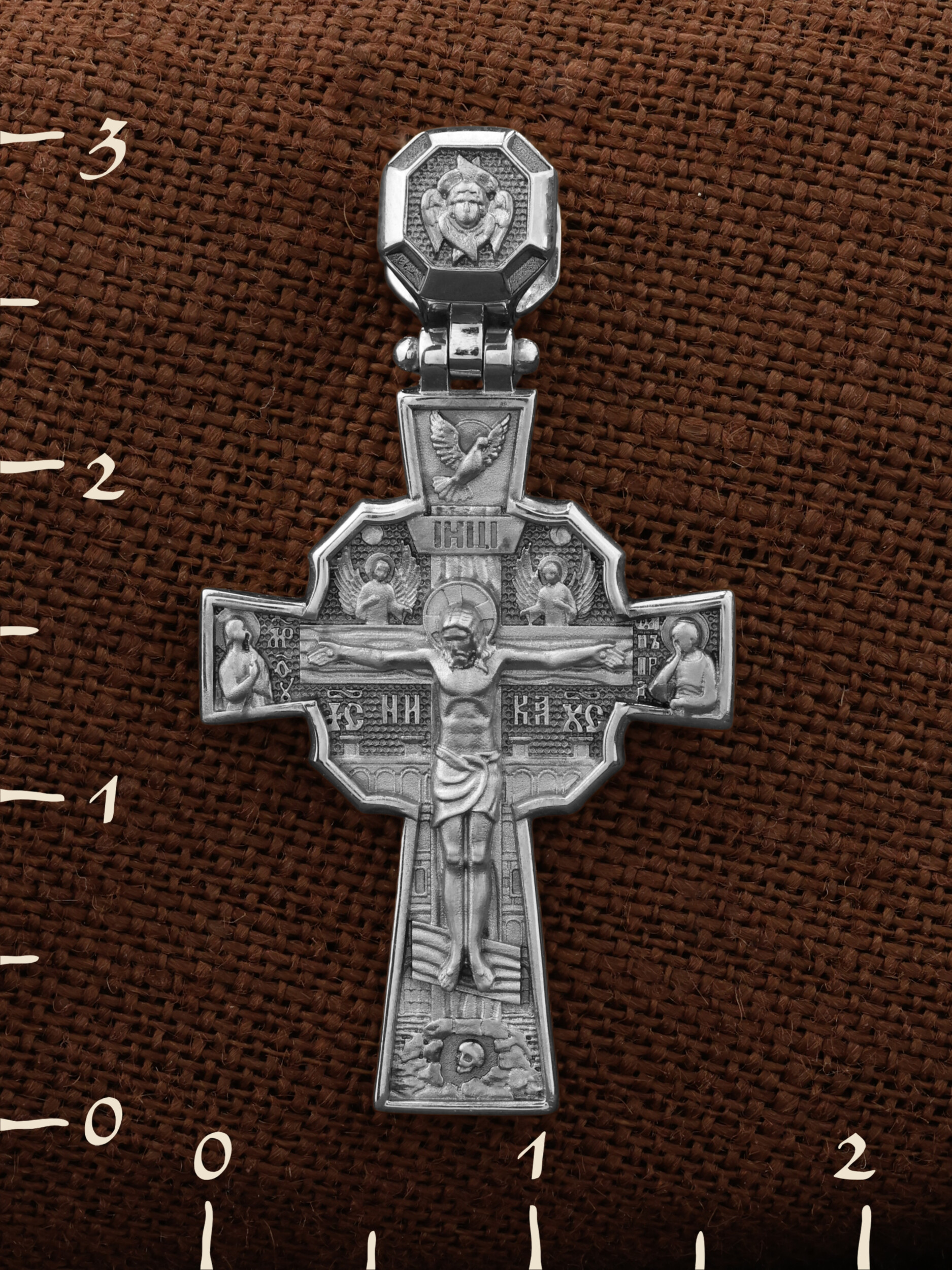 Над Распятием изображен парящий голубь — символ Святого Духа и Его благодати. На кулонном кольце изображен шестикрылый Серафим — самый приближенный к Господу Ангел.