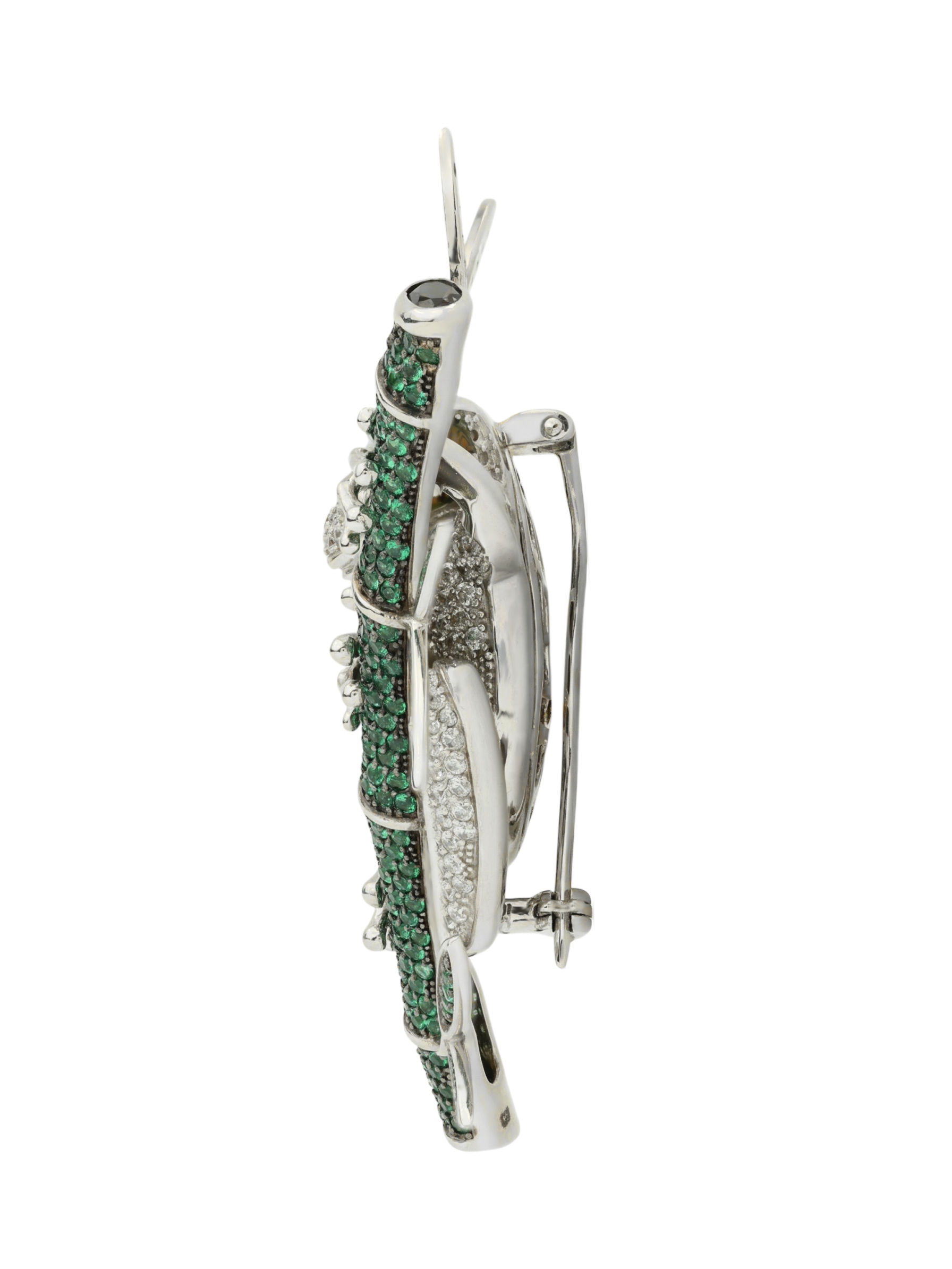 В центре композиции находится выразительная вставка из дымчатого кварца, чей глубокий коричневый оттенок придает образу загадочности. Роскошная отделка изделия включает 462 вставки: сочетание сверкающих фианитов серого цвета и эмали насыщенного зеленого оттенка создает живую, динамичную игру света. Форма вставок — круглая и овальная — гармонично дополняет плавные линии дизайна, придавая броши дополнительный объем.