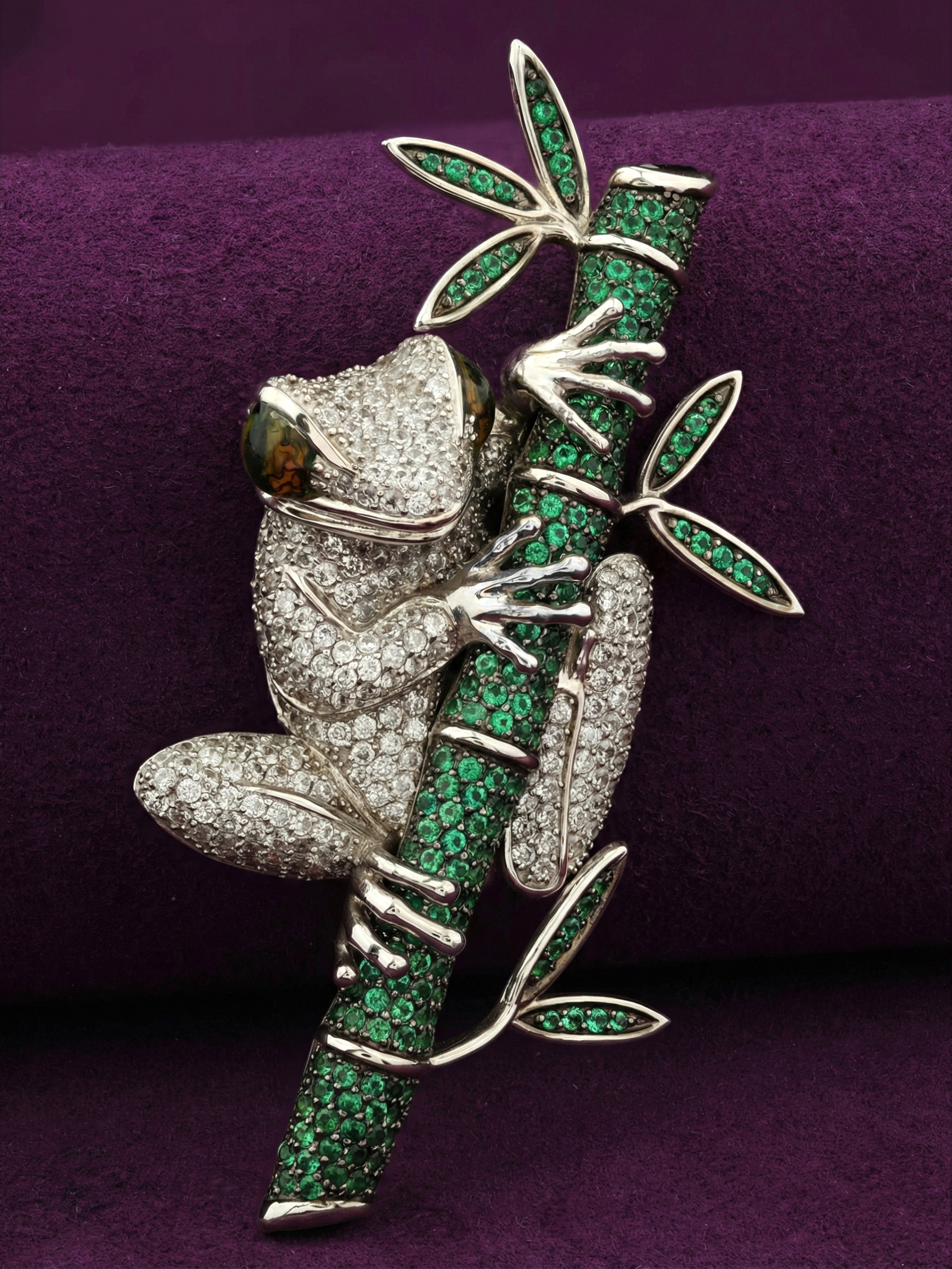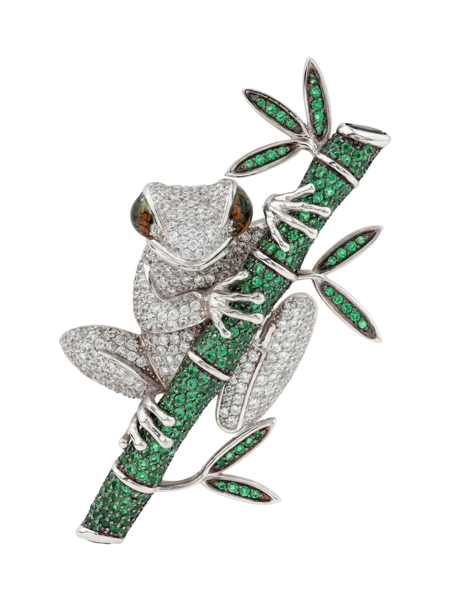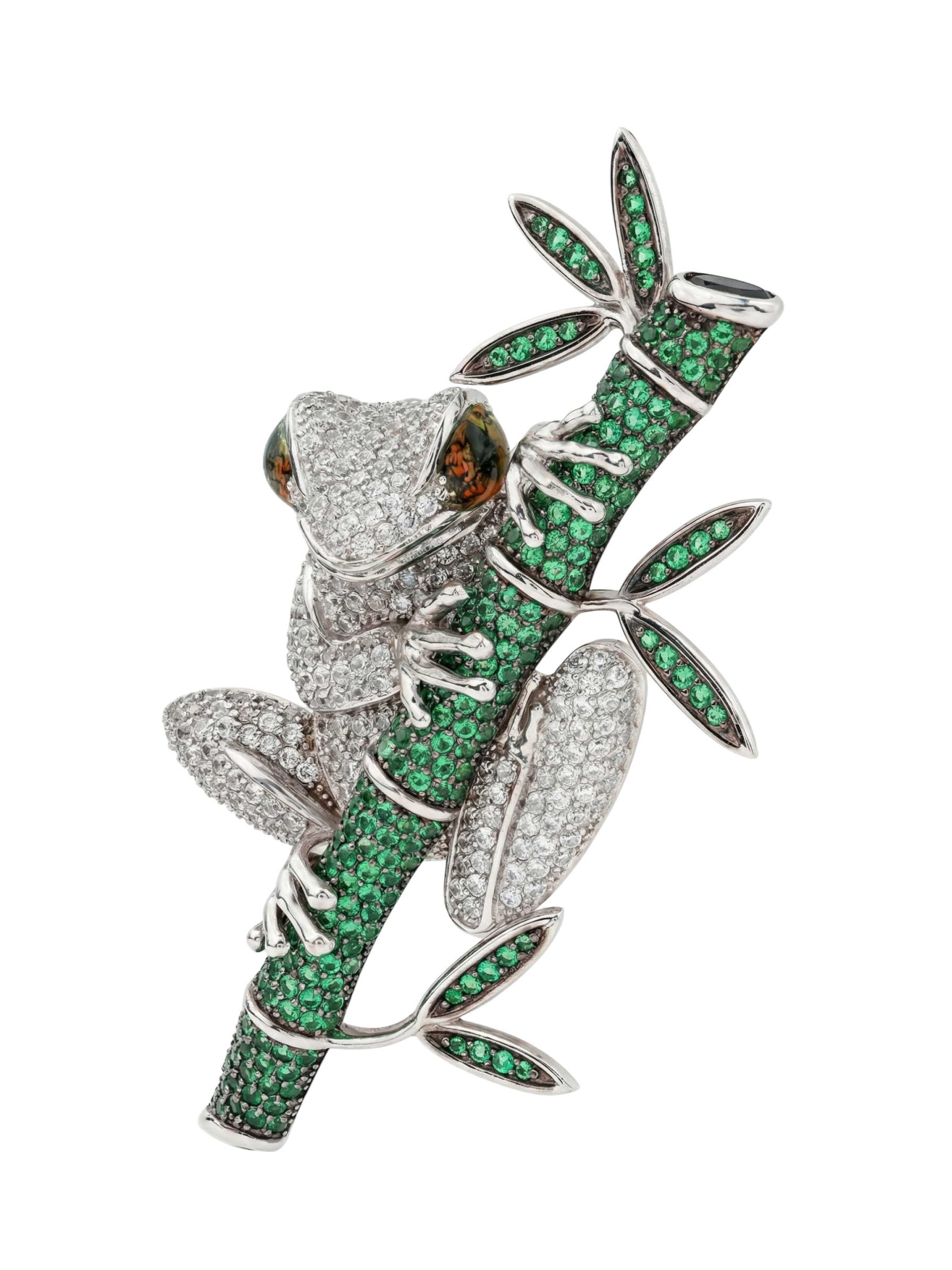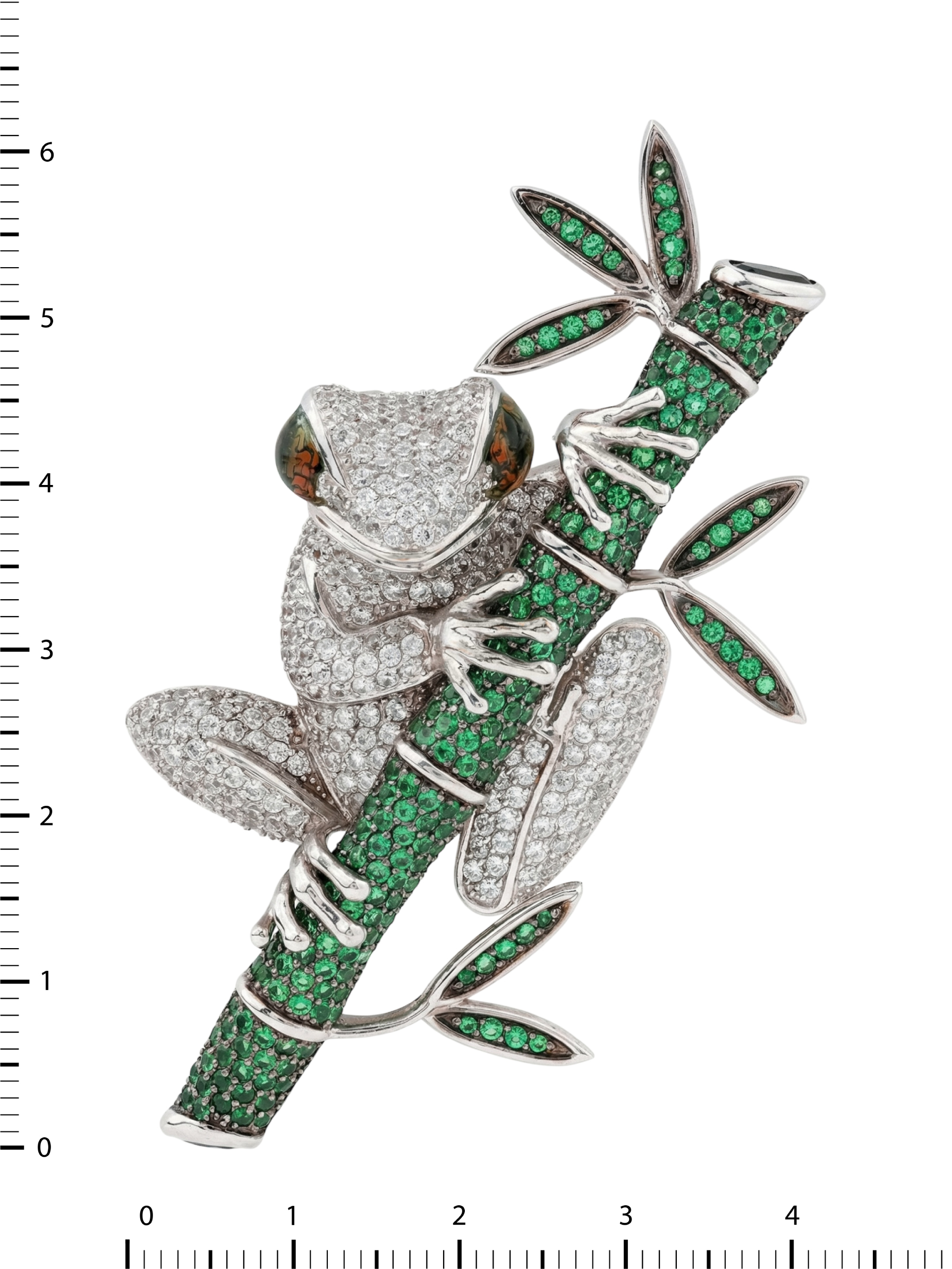 Эксклюзивная брошь из белого золота 585 пробы из коллекции De Luxe — Лягушки станет ярким акцентом в вашем гардеробе. Это ювелирное изделие воплощает мастерство работы с деталями: композиция в виде лягушки на бамбуке выполнена с потрясающей точностью, превращая украшение в настоящий предмет искусства. Художественное исполнение подчеркивается сочетанием фактур и драгоценных материалов, создавая глубокий визуальный эффект.