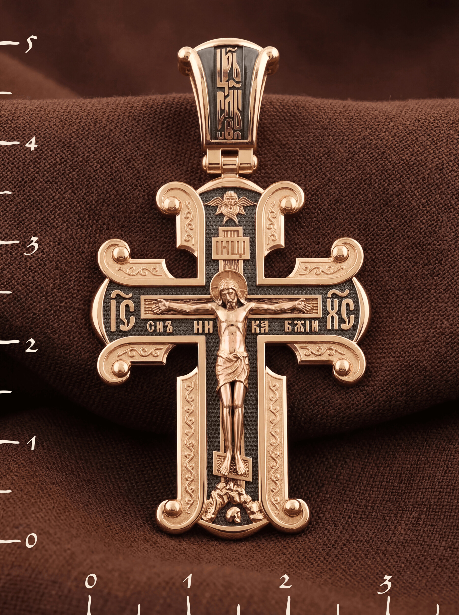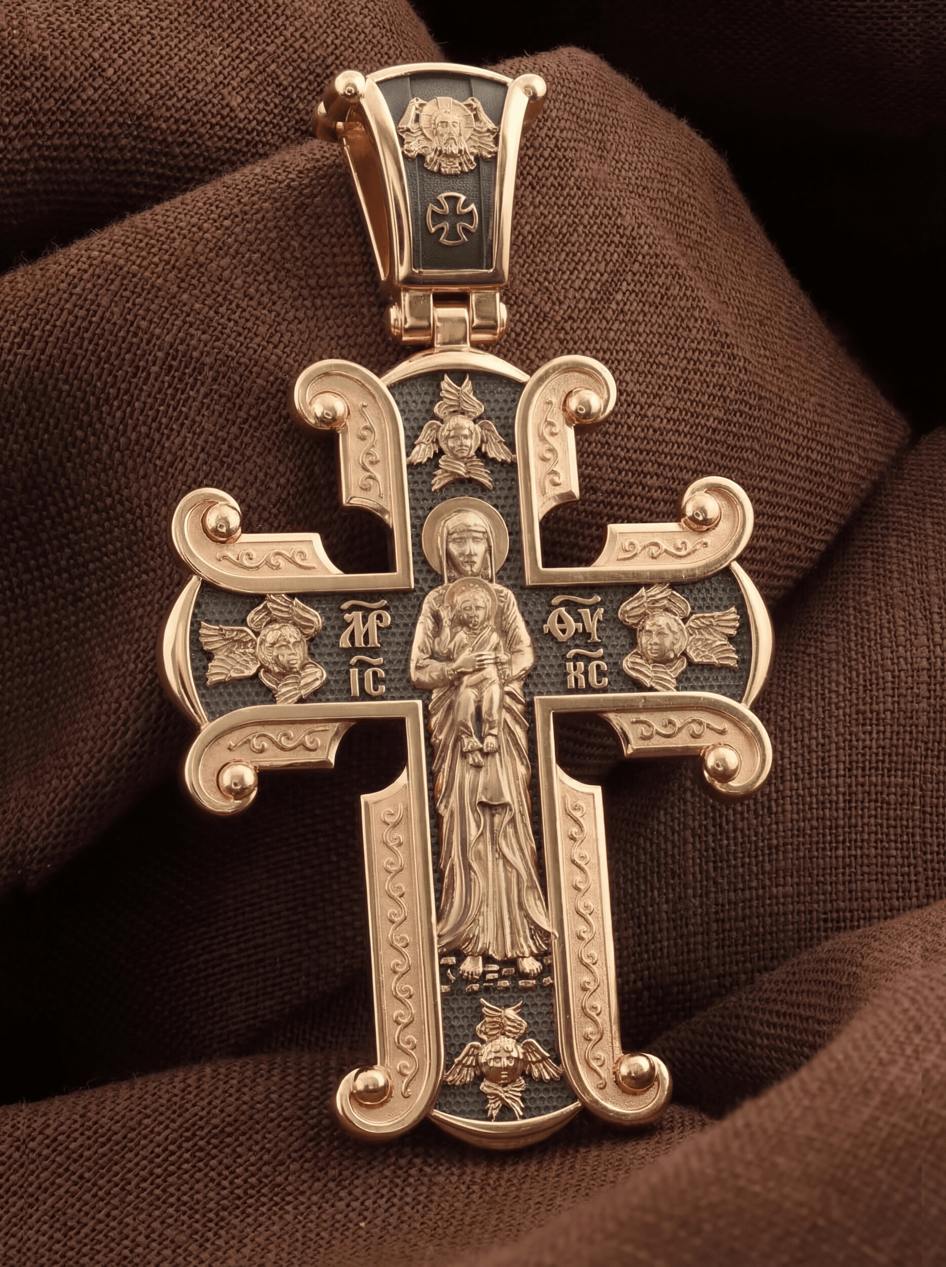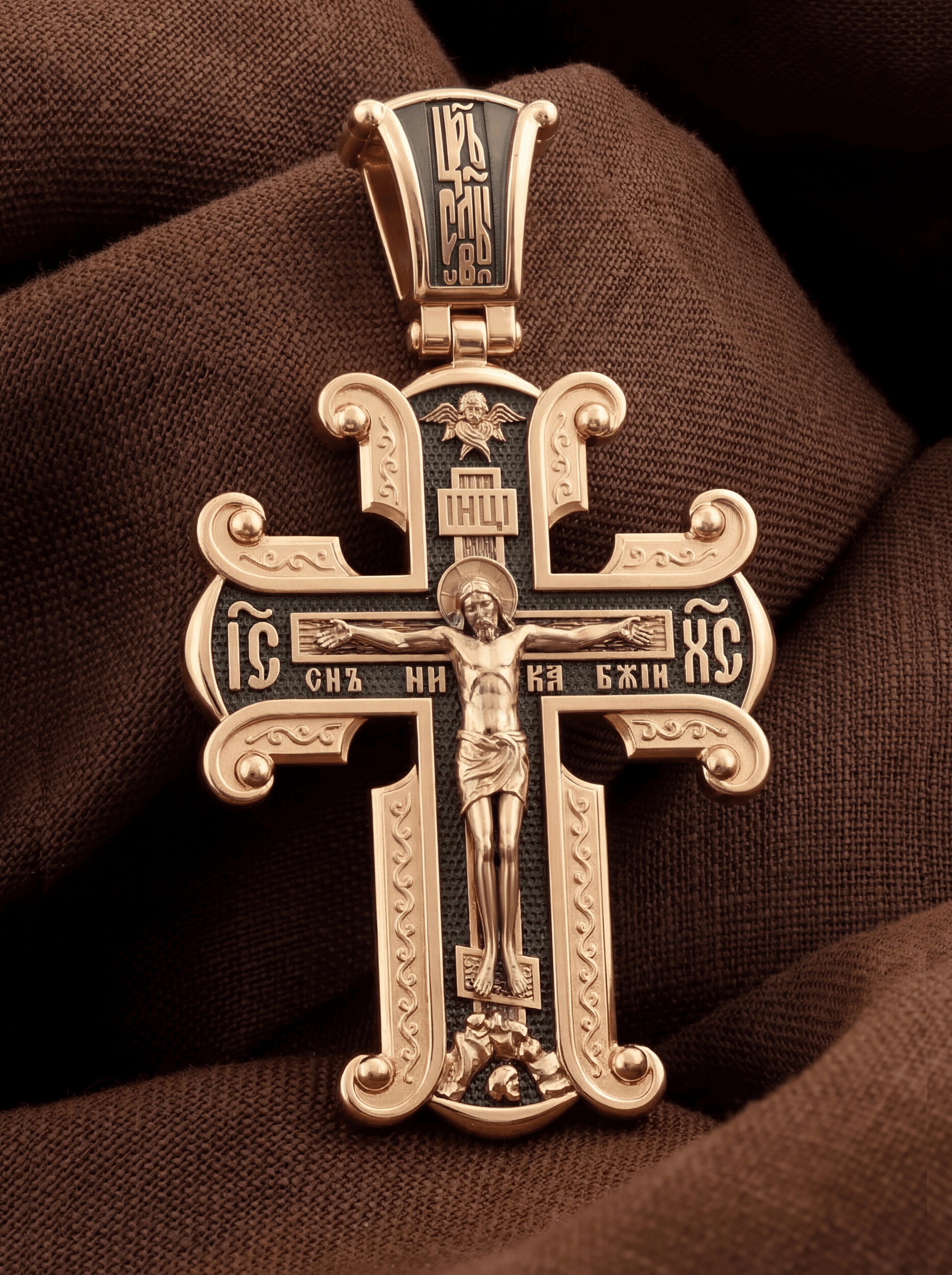На лицевой стороне необычной формы нательного креста мы видим распятие Господне. Сам крест украшен плетением полурастительной тематики и золотым ободком, заканчивающимся завитками. На кулонном кольце с лицевой стороны надпись — Царь Славы. Под ней — шестикрылый огненный серафим, и буквы «IНЦI», означающие Иисус Назорей Царь Иудейский. С обеих сторон горизонтальной перекладины надписи — монограмма Святого имени Христа — «ИС ХС», а под ней — «НИКА» (Победитель) и «Сын Божий». В подножии мы видим изображенную гору Голгофу в виде скалистой горки с Главой Адамовой в пещере.