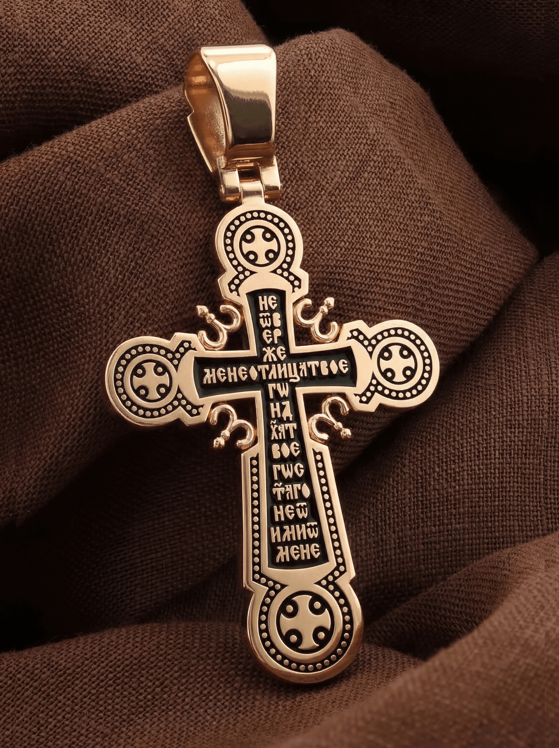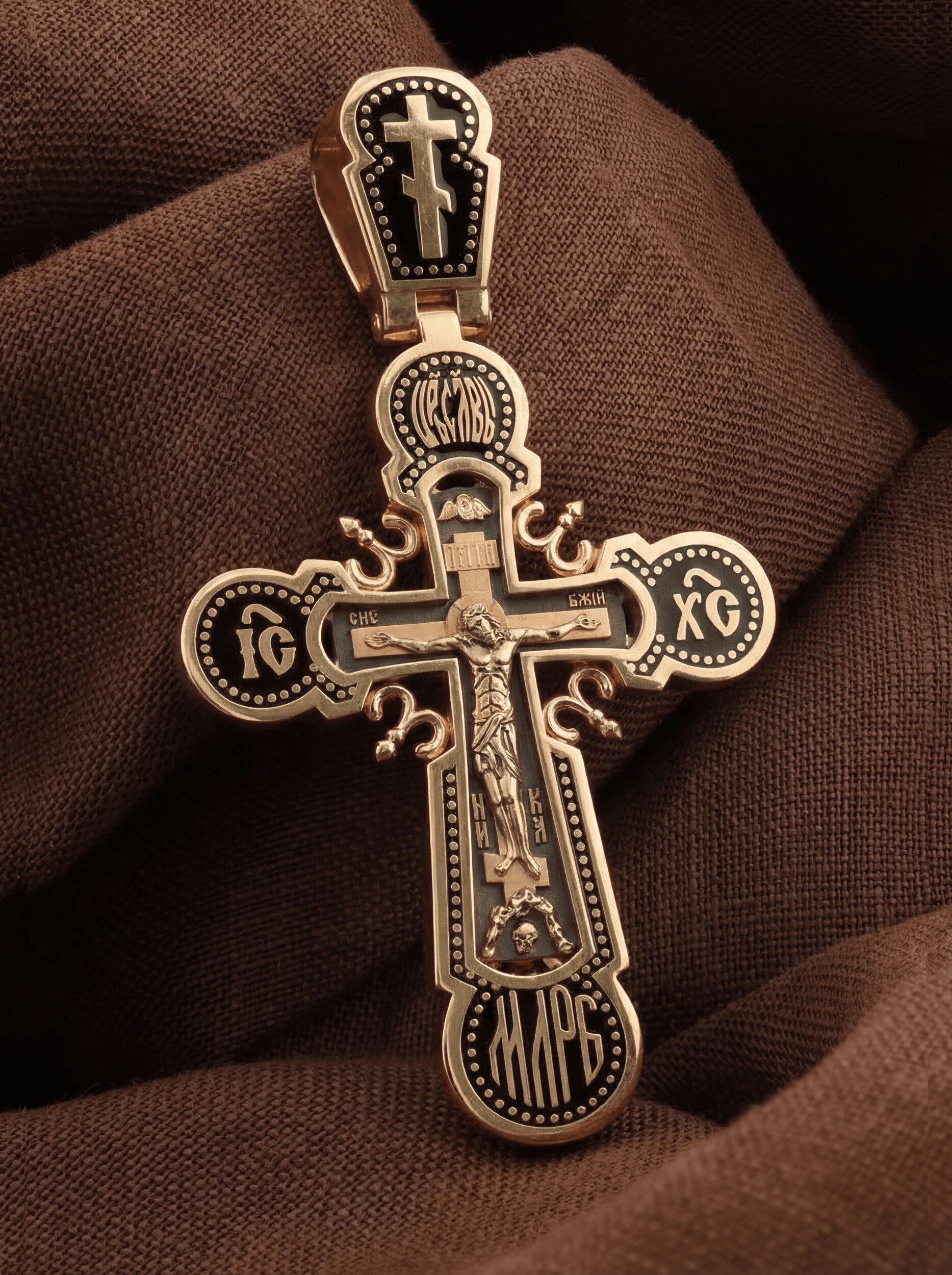 На лицевой стороне креста изображено Распятие Господа и Спасителя нашего Иисуса Христа. Крест- символ спасения и искупления рода человеческого, знамение победы над смертью и адом. Иисус Христос, как искупительная жертва освобождения человечества от власти греха, умер крестной смертью и в третий день воскрес. Над вершиной Распятия помещена надпись «Царь Славы» и изображение Духа Святого в виде голубя, сходящего с небес. На верхней табличке, выше головы Иисуса, расположена надпись, составленная Понтием Пилатом — «IНЦI». Она означает «Иисус Назорей, Царь Иудейский». Надпись «IС» « ХС» означает Иисус Христос и помещается на разных сторонах поперечной перекладины креста. Ниже — слово «НИКА», что означает «победитель». Надпись «МЛРБ» — «место лобное рай бысть» означает, что место лобное стало раем, помещается в нижней части креста. Крест стоит на горе камней, символизирующих Голгофу. В ее основании различается череп — это голова Адама. На православном кресте Христос не умирает, а свободно простирает руки, ладони Иисуса открыты, будто он хочет обнять все человечество, даря им свою любовь и открывая путь к вечной жизни. На кулонном кольце помещен крест.