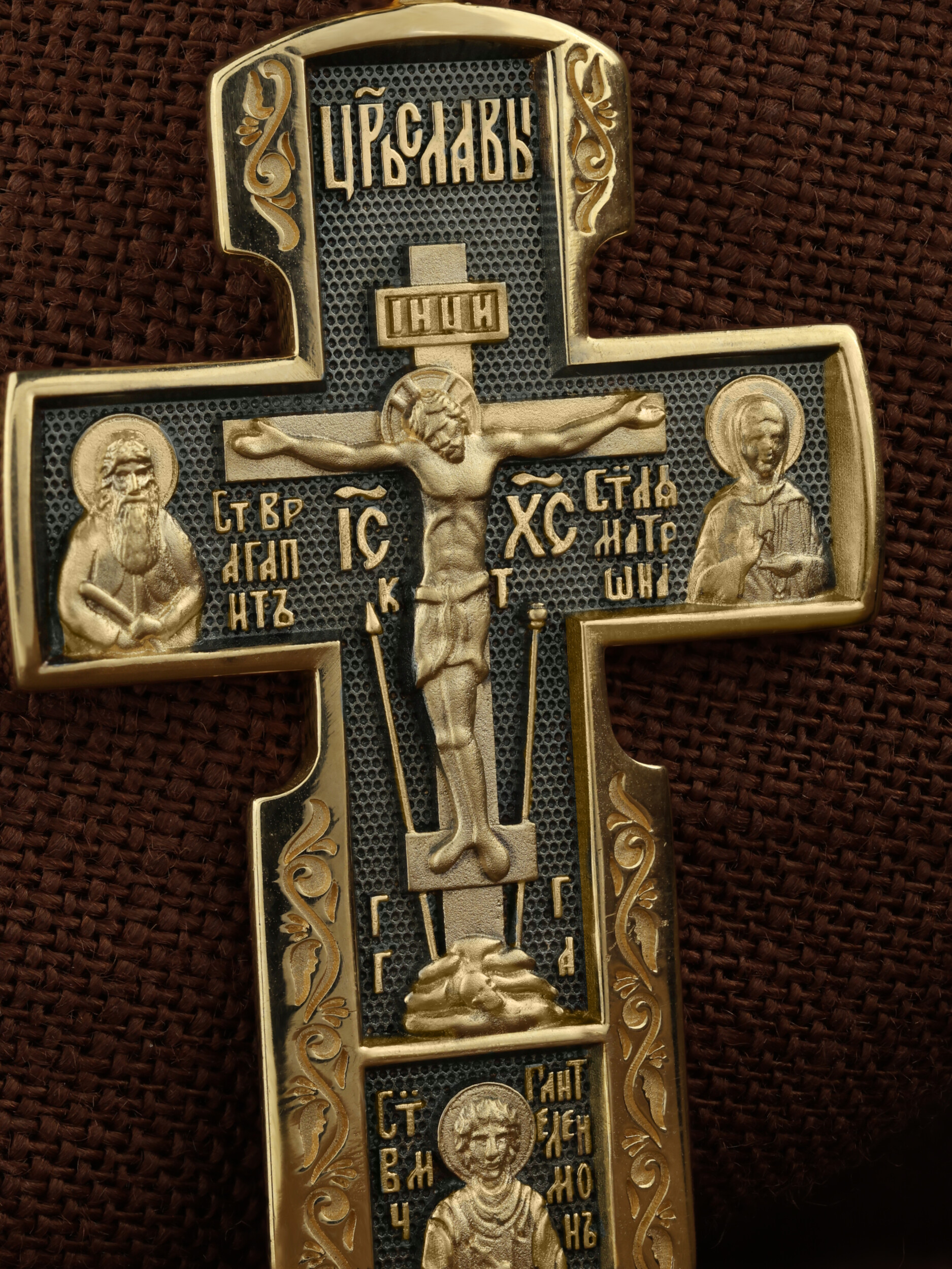 Как действенная помощь в немощах и болезнях был создан крест с образами святых целителей и со знаменитой афонской иконой Божией Матери «Всецарица». Над титлом видим слова «ЦРЬ СЛВЫ» — Царь Славы. Верхняя перекладина символизирует собой табличку с надписью «IHЦI» — Иисус Назарянин Царь Иудейский. Под перекладиной пишется сокращенно имя Спасителя «IC XC» — Иисус Христос. Возвышение, на котором стоит Крест, символизирует гору Голгофу, на которой произошло Распятие. У подножия Креста изображают прах Адама, обозначенный черепом. Справа от Распятия помещен образ прославленной святой блаженной Матроны. Слева — икона преподобный Агапита. Этот святой жил в пещерах Киево-Печерского монастыря в XI веке и бескорыстно врачевал мирян и монахов. У основания Креста Господня изображен великомученик Пантелеимон Целитель. Господь даровал удивительную силу его молитве. Ею он исцелял любые болезни и даже воскрешал умерших.