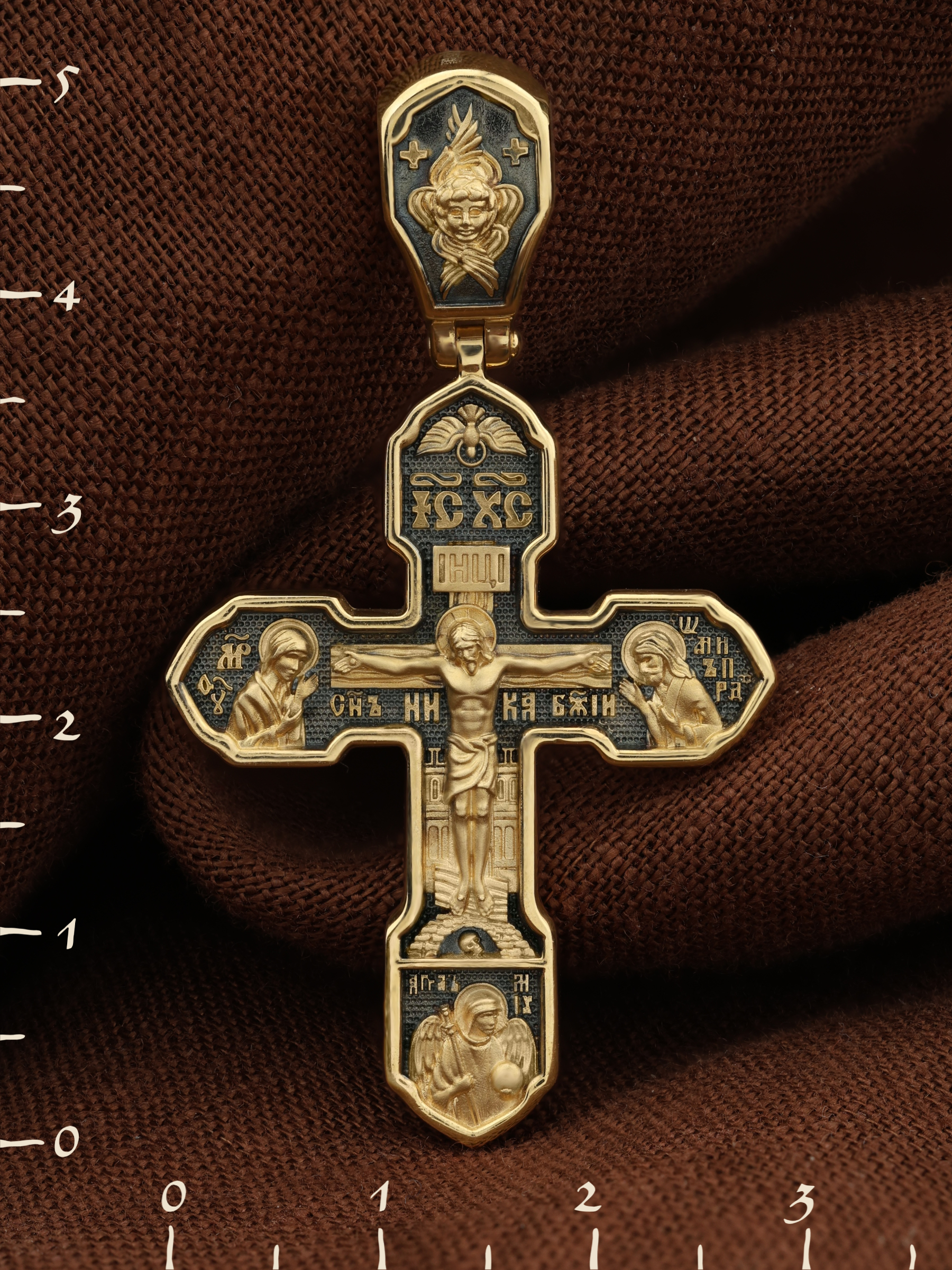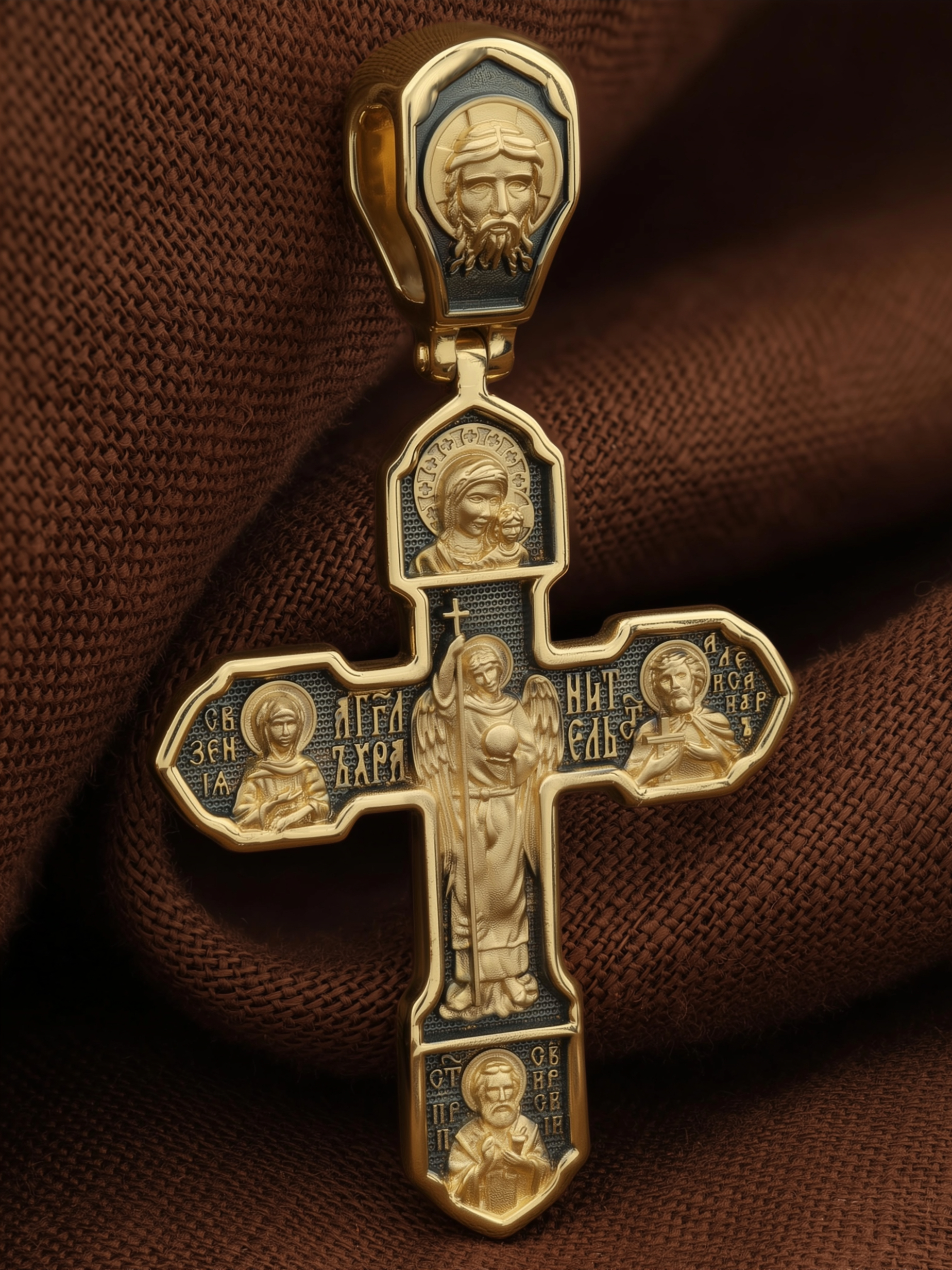 На лицевой стороне изображено Распятие Господа Иисуса Христа, над вершиной которого помещены титлы Его святого имени — «ИС ХС». Под основной перекладиной надписи — «НИКА», что в переводе с греческого означает «победитель», и словосочетание «СЫН БОЖИЙ», что означает божественную природу Иисуса Христа. С двух сторон Христу предстоят Пресвятая Богородица и св. Андрей Первозванный. Внизу — образ Архангела Михаила, могучего защитника от злых сил. Это он низверг дьявола и встал во главе ангелов для борьбы с бесовскими силами. Его имя означает «Кто яко Бог?».