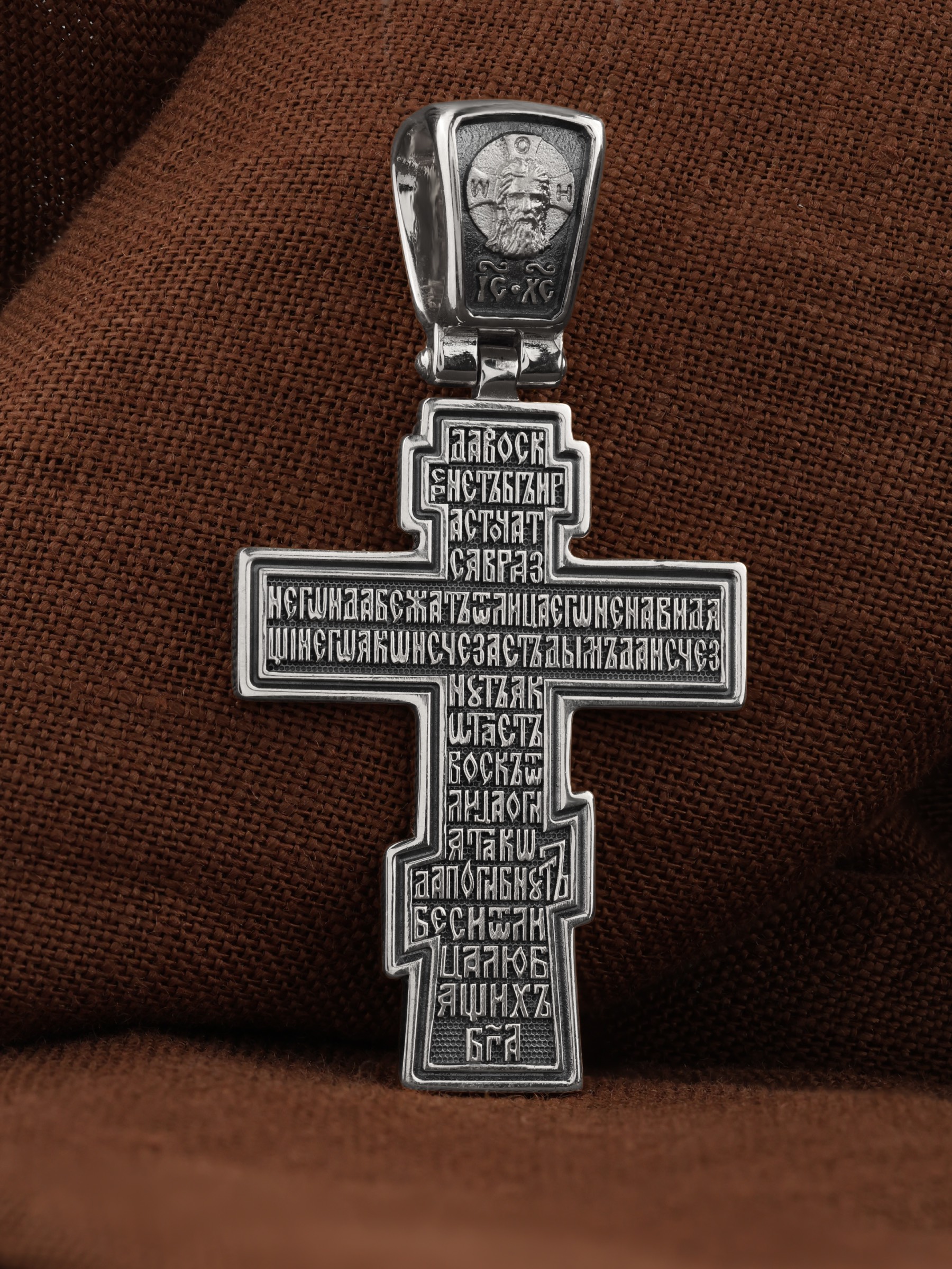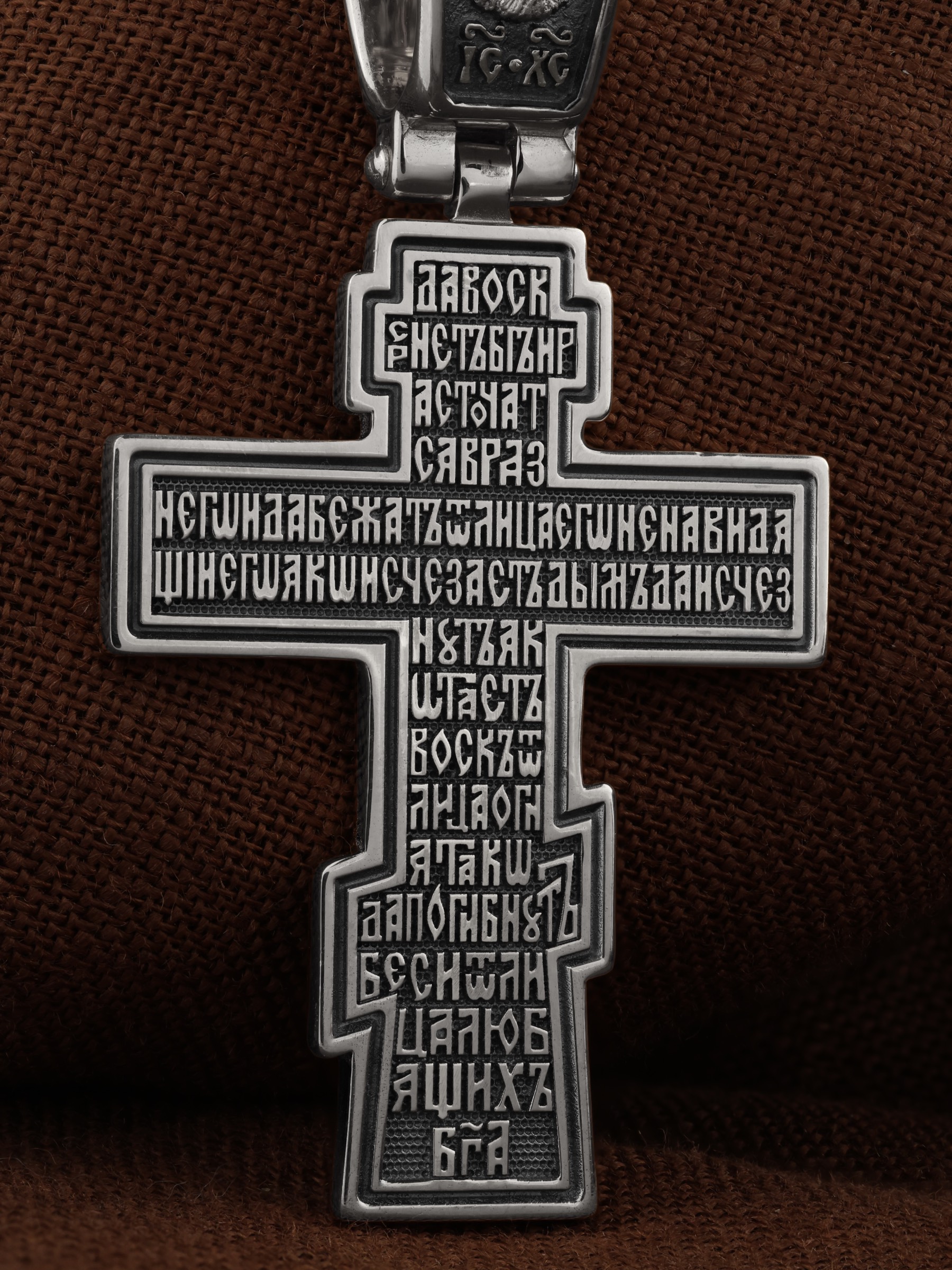 На обороте написаны начальные стихи оградительной молитвы Честному Кресту Господню. Эту молитву читают в опасности, а также носят при себе для защиты от злых сил: Да воскреснет Бог, и расточатся врази Его, и да бежат от лица Его ненавидящий Его. Яко исчезает дым, да исчезнут; яко тает воск от лица огня, тако да погибнут беси от лица любящих Бога и знаменующихся крестным знамением, и в веселии глаголющих: радуйся, Пречестный и Животворящий Кресте Господень, прогоняй бесы силою на тебе пропятаго Господа нашего Иисуса Христа, во ад сшедшаго и поправшаго силу диаволю, и даровавшаго нам тебе Крест Свой Честный на прогнание всякаго супостата. О, Пречестный и Животворящий Кресте Господень! Помогай ми со Святою Госпожею Девою Богородицею и со всеми святыми во веки. Аминь»