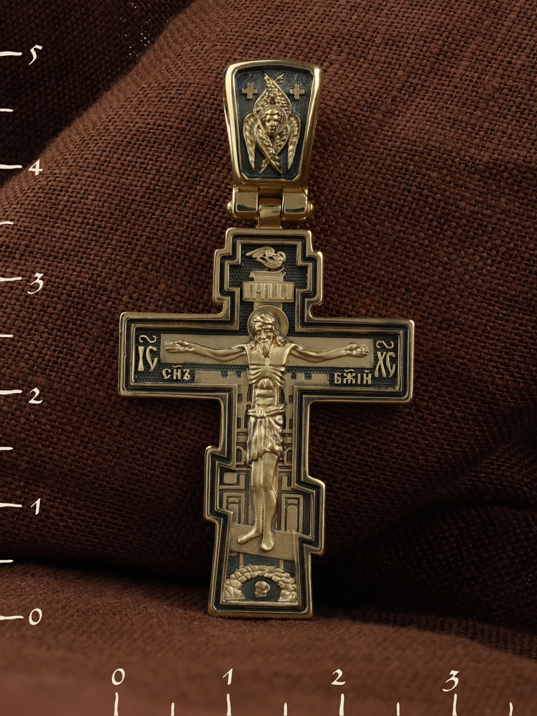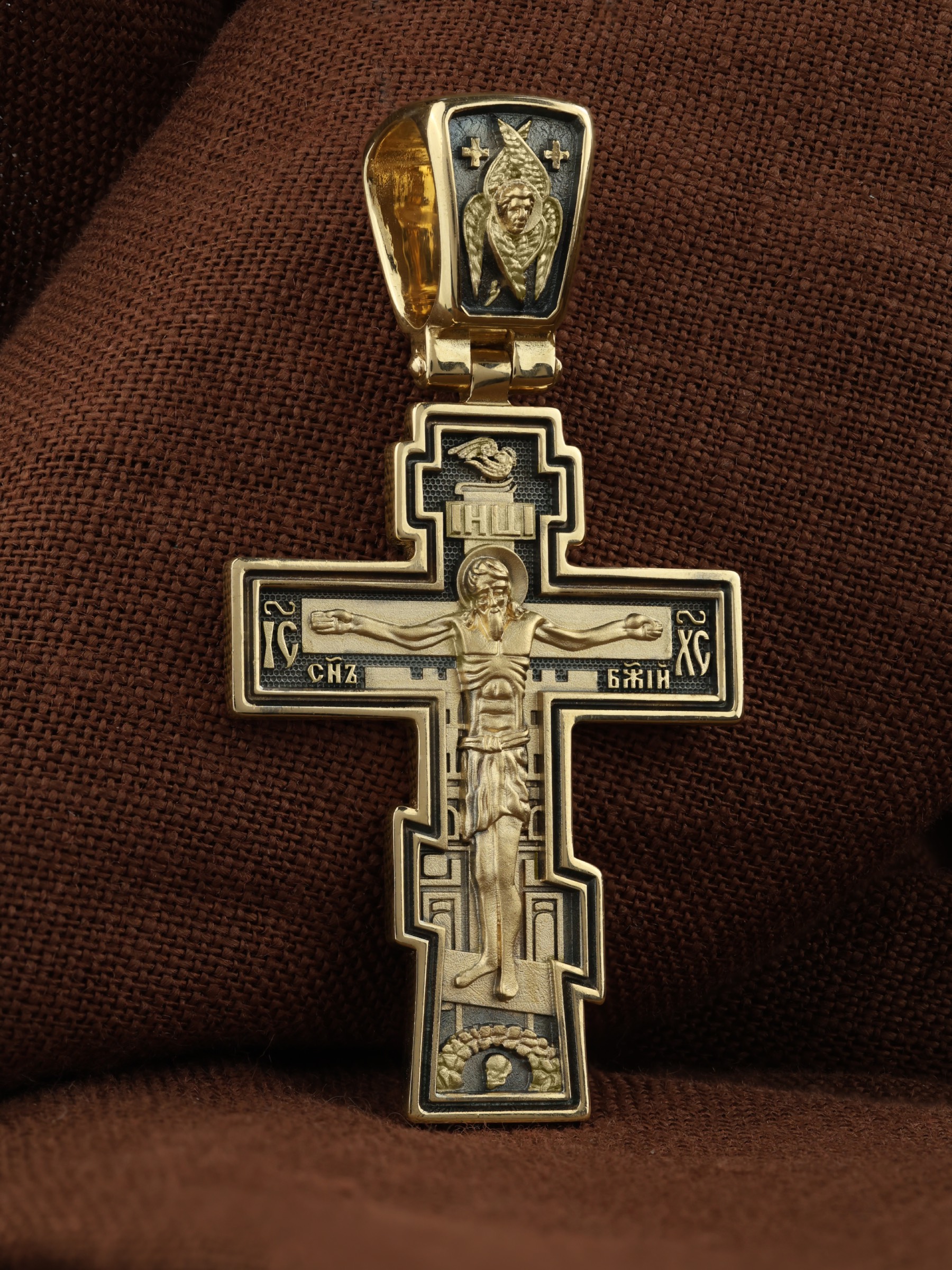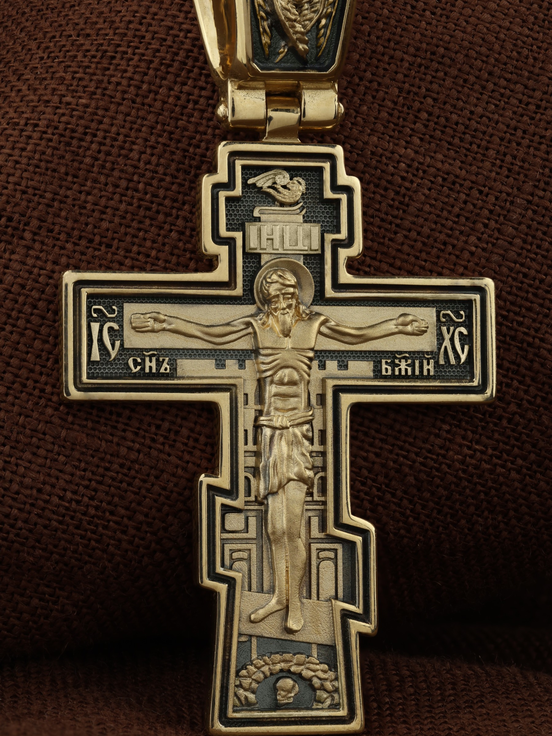 Восьмиконечный нательный крест с Распятием Иисуса Христа на горе Голгофе. Форма этого кресты является одной из самых распространенных на Руси и более всего соответствует тому Кресту, на котором был распят Христос.