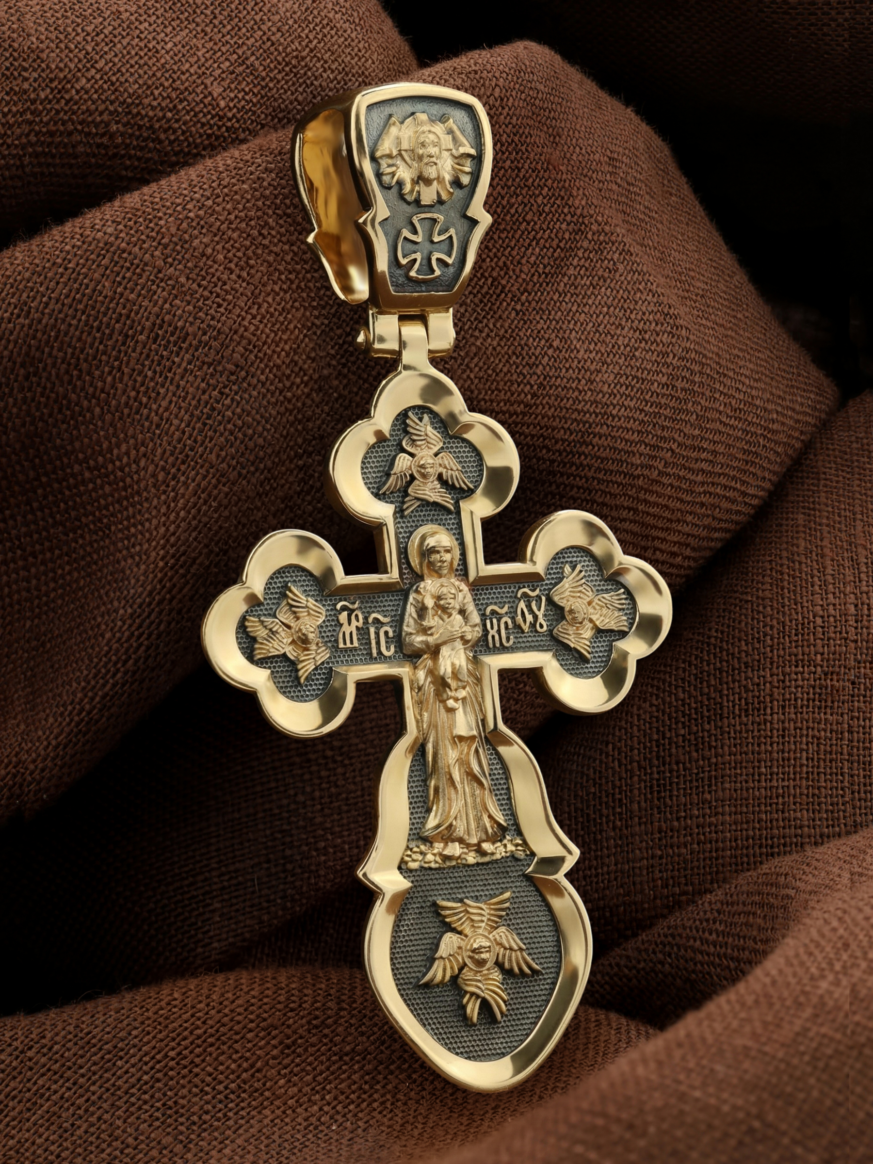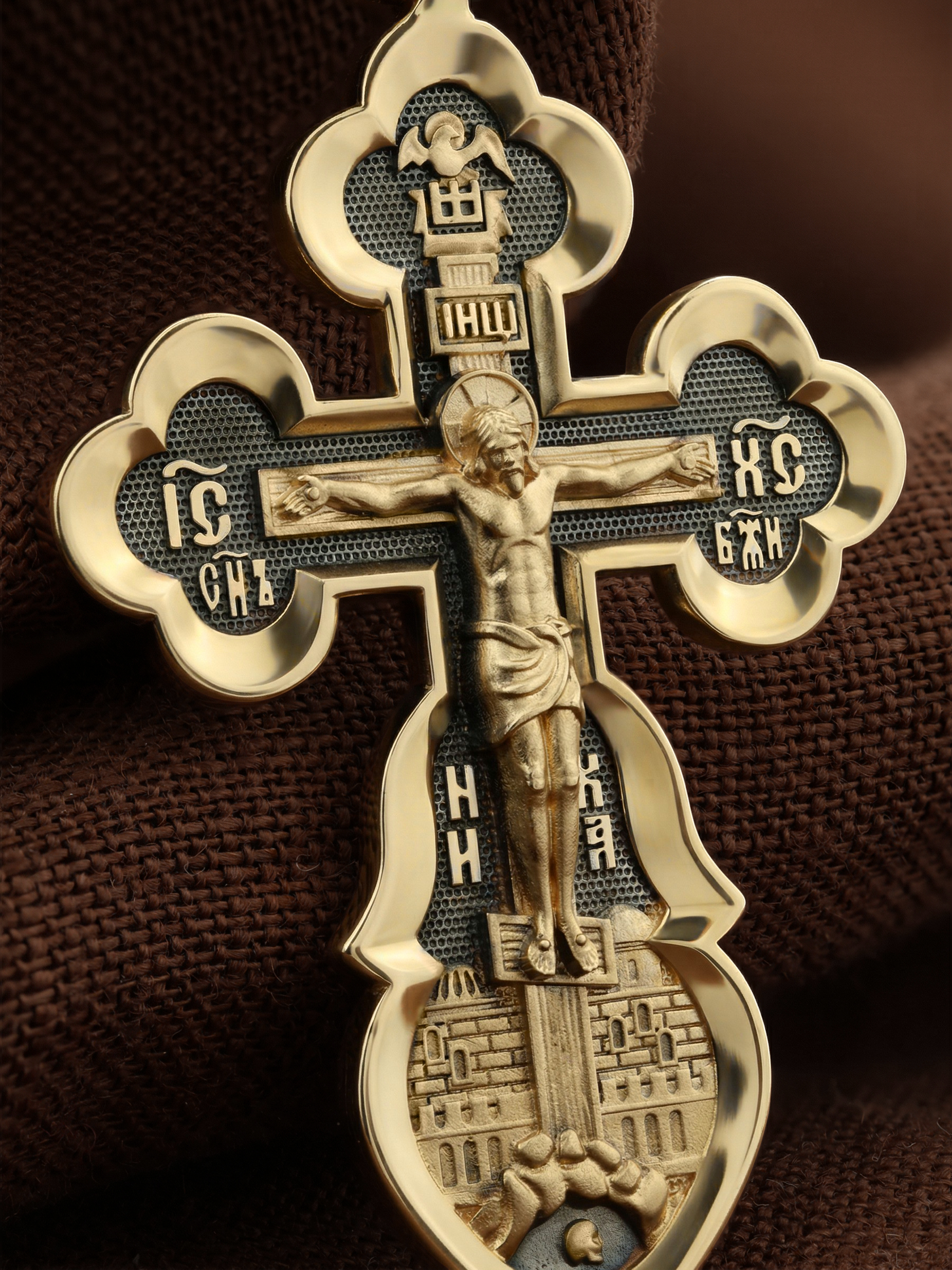 Распятие сопровождается иконографическими надписями, прославляющими Господа Иисуса Христа. На боковых оконечностях размещены инициалы святого имени Спасителя «IС ХС» и надпись «Сын Божий», обозначающая Его божественную природу. На подножии Креста можно прочитать надпись «НИКА» (Победитель) — символ победы Господа над смертью. Венчает лицевую сторону образ Святого Духа в виде голубя.