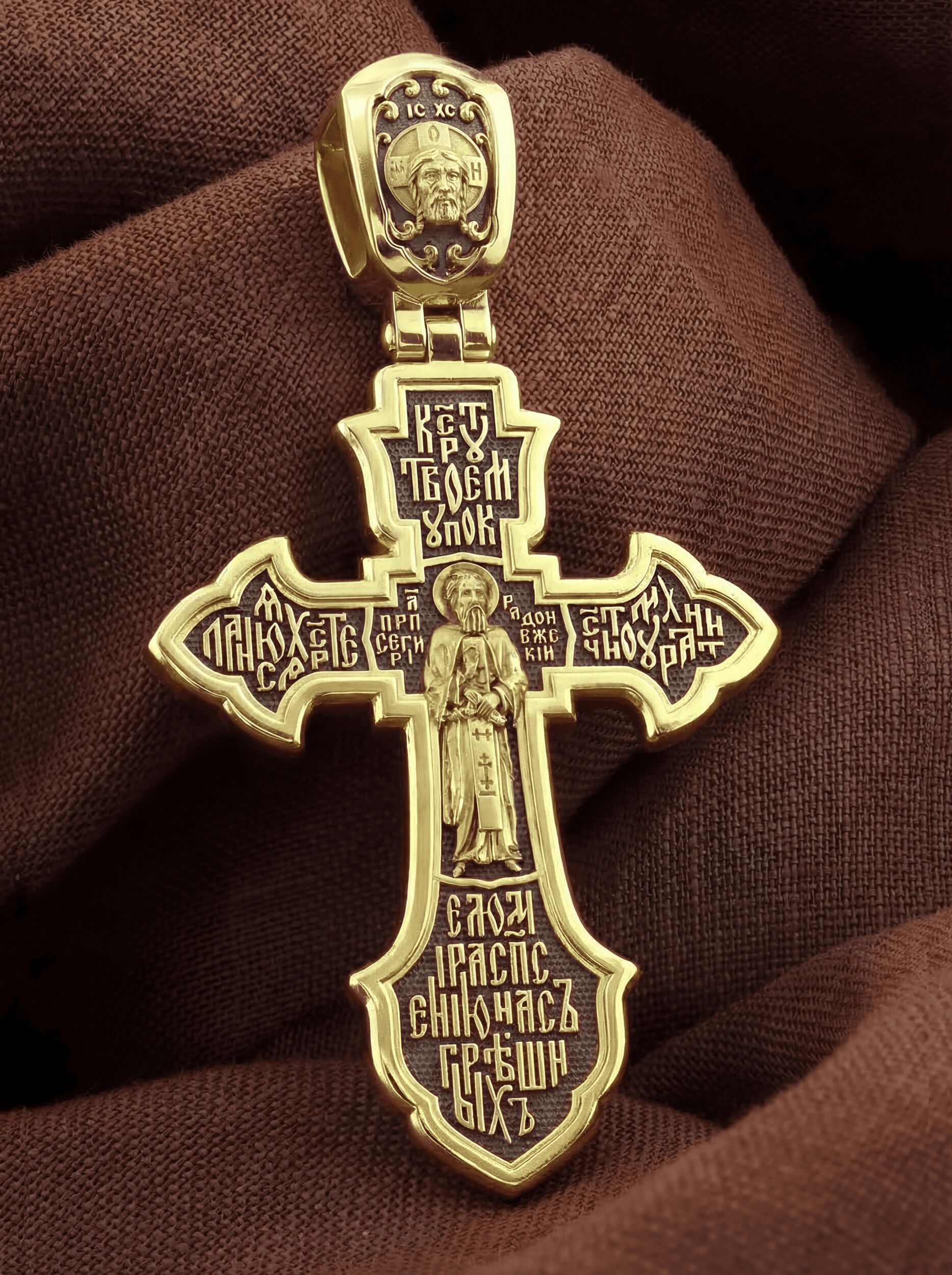 На лицевой стороне этого креста центральную часть занимает икона Распятия Христа — образ жертвы, принесенной Господом за грехи людей. Именно ко Христу, сошедшему на землю ради нашего спасения, возносятся все молитвы. Рядом с Его образом помещены слова — «НИКА» и «Царь Славы». Эти слова характеризуют Господа как Великого Архиерея, победителя смерти. Также Распятие сопровождается надписями, олицетворяющими Христа — это святое имя Христа «IC» (Иисус) «ХС» (Христос). Венчает лицевую сторону креста надпись «Царь Славы». На кулонном кольце помещено изображение Спаса Нерукотворного.
