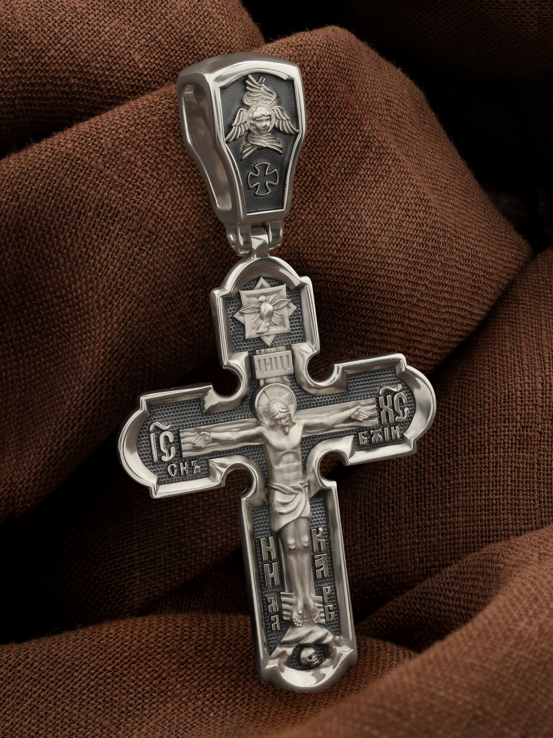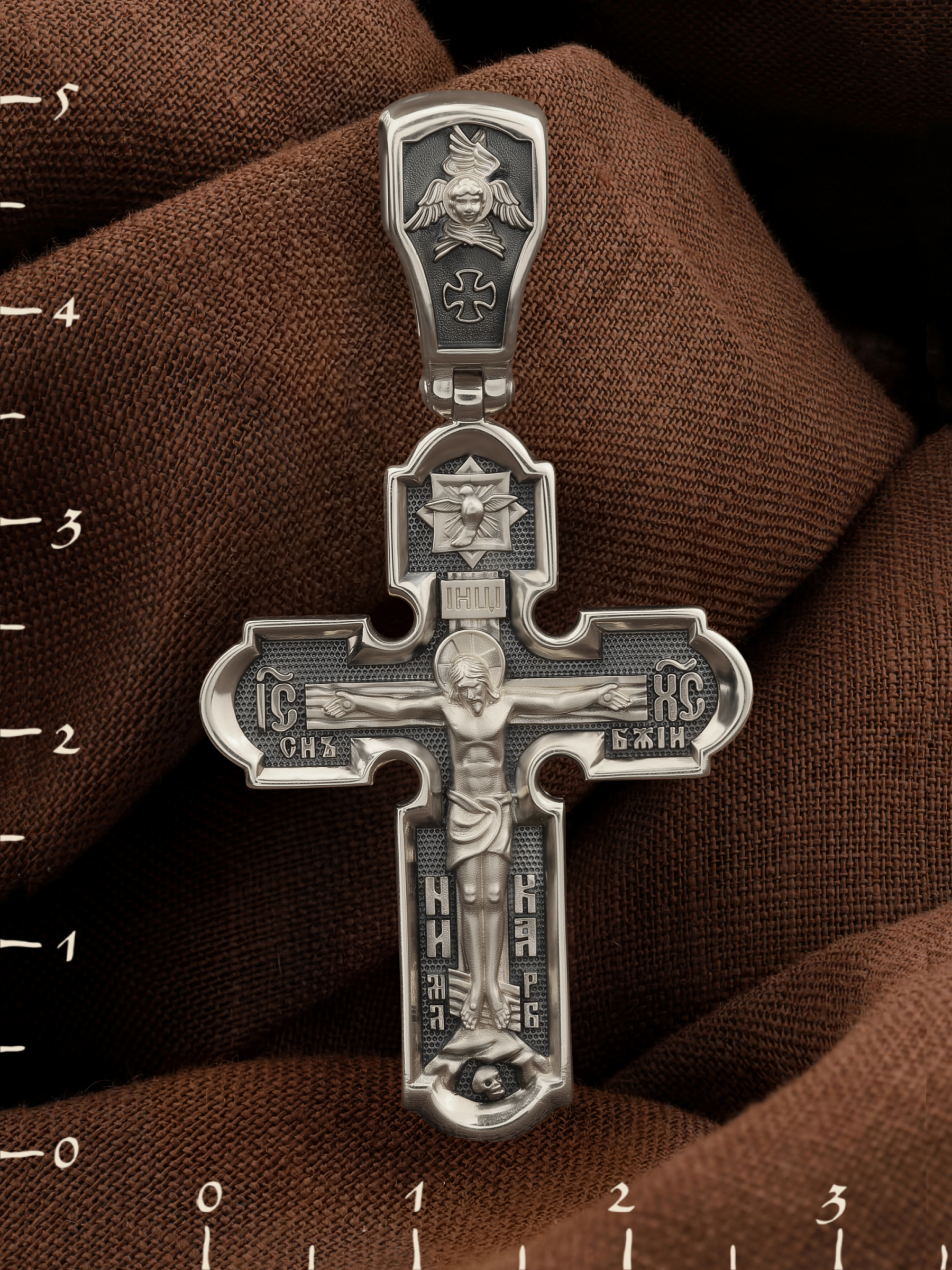На лицевой стороне креста изображено Распятие Господа и Спасителя нашего Иисуса Христа. Христос, подвергнутый на кресте мучительной казни, своими страданиями искупил нас от древнего греха и даровал нам жизнь вечную. На верхней табличке, выше головы Иисуса, расположена надпись, составленная Понтием Пилатом — «IНЦI». Она означает «Иисус Назорей, Царь Иудейский». Надпись «IС» « ХС» означает Иисус Христос и словосочетание «СЫН БОЖИЙ», что означает божественную природу Иисуса Христа. В нижней части креста находятся надписи «НИКА» и «МЛРБ». В переводе с греческого, слово «НИКА» означает «победитель». Надпись «МЛРБ» — «место лобное рай бысть» — означает, что место лобное стало раем. Крест стоит на горе камней, символизирующих Голгофу. Под подножием Креста изображена покоящаяся голова (череп) Адама.