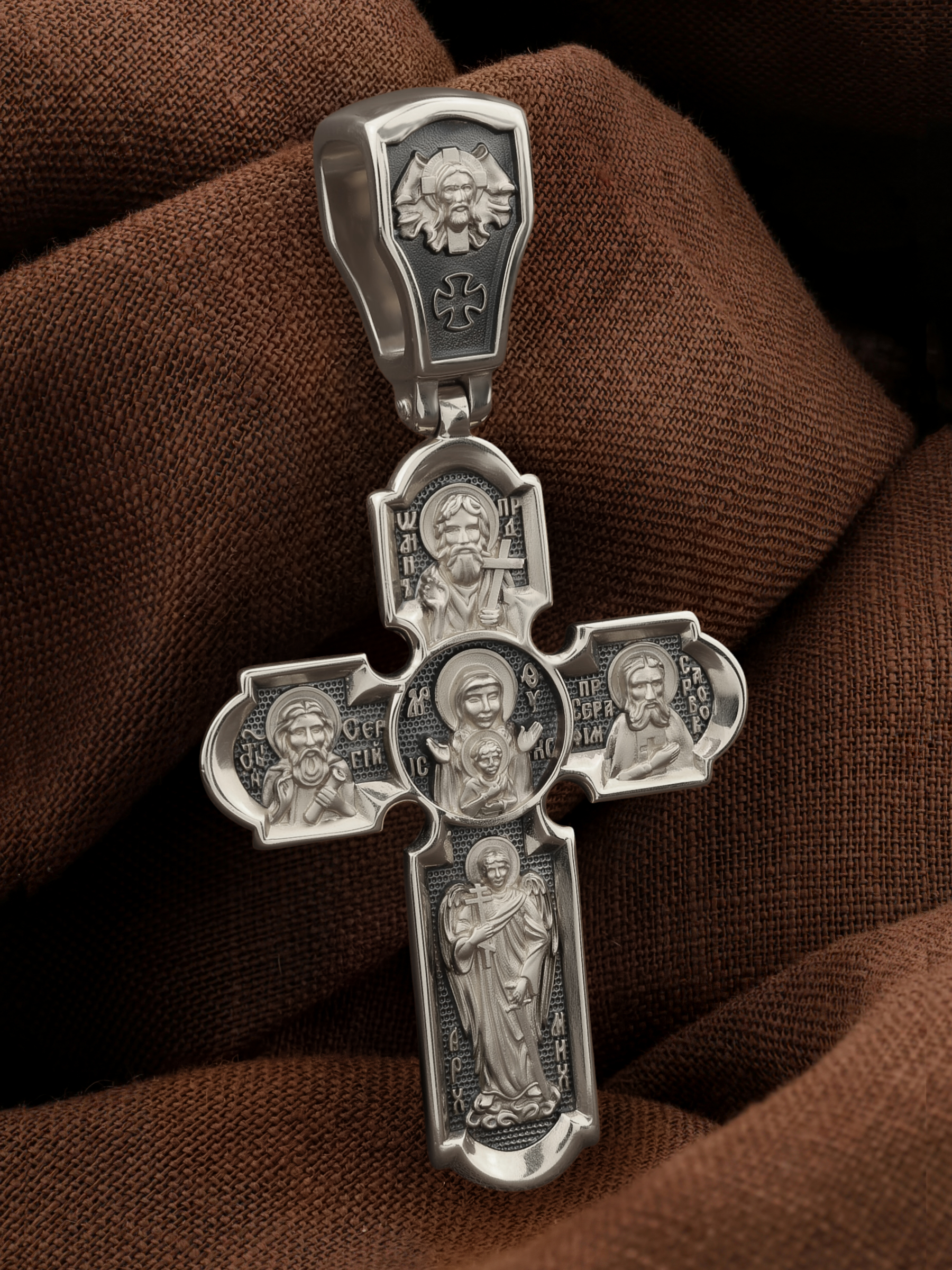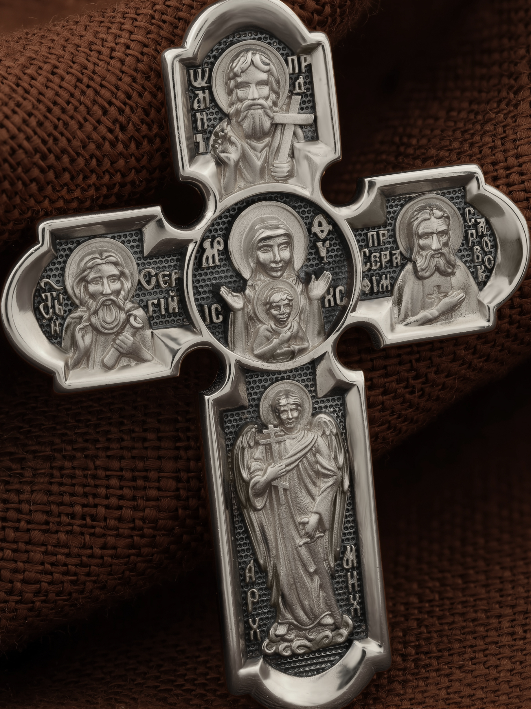 Центральную часть оборотной стороны креста украшает икона Божией Матери «Знамение». Иконы Божией Матери, известные под именем «Знамение», появились на Руси в XI — XII веках, а называться так стали после чудесного знамения от Новгородской иконы, случившегося в 1170 году. Многочисленные списки с иконы Знамения известны по всей России. На кресте внизу изображен Архангел Михаил, слева — Преподобный Сергий Радонежский, справа — Преподобный Серафим Саровский, вверху — Предтеча Господень Иоанн Креститель. На кулонном кольце помещено изображение Спаса Нерукотворного — образ Спасителя, который Он запечатлел на плате и передал для исцеления больному проказой царю Эдессы. Ему придается победное и защитное значение.