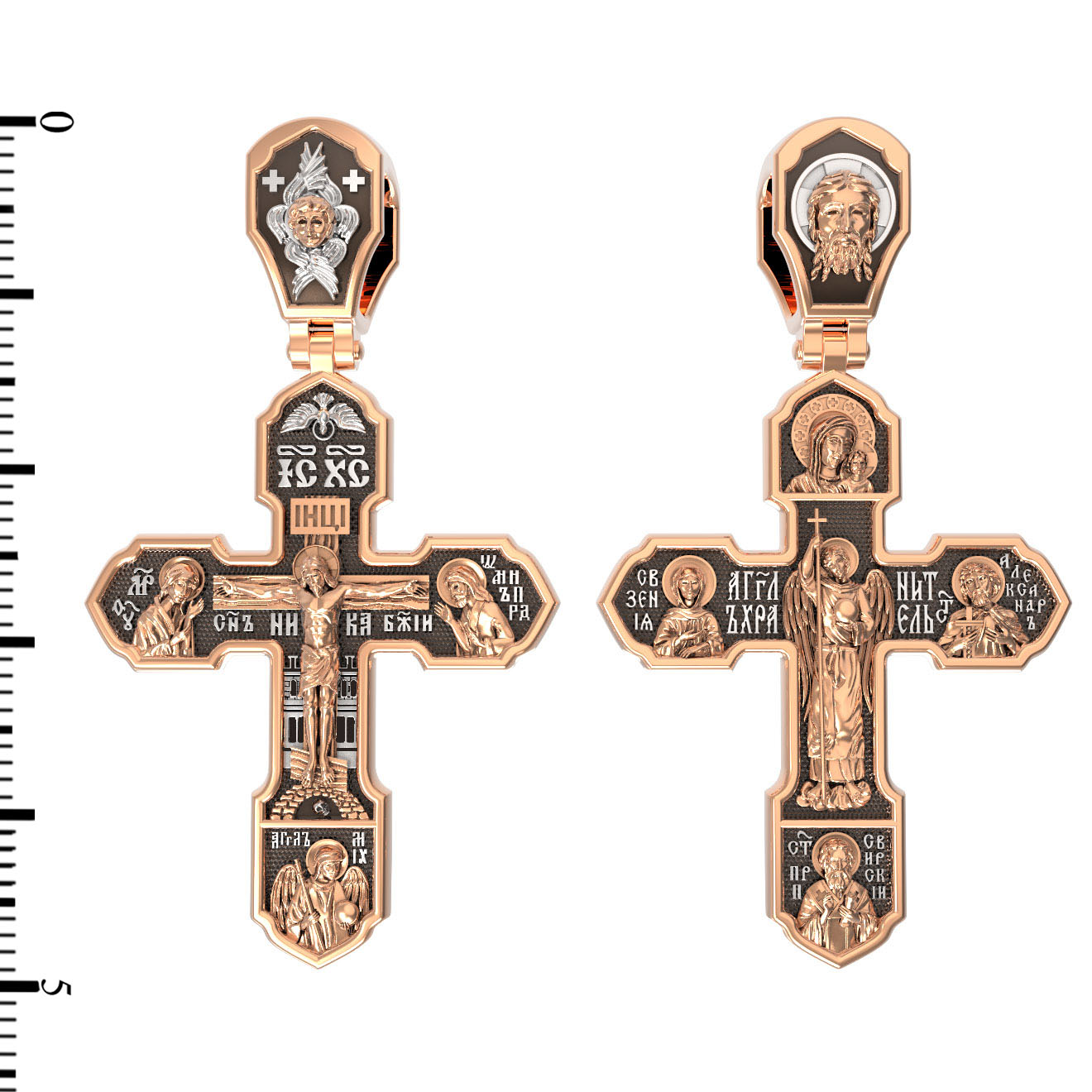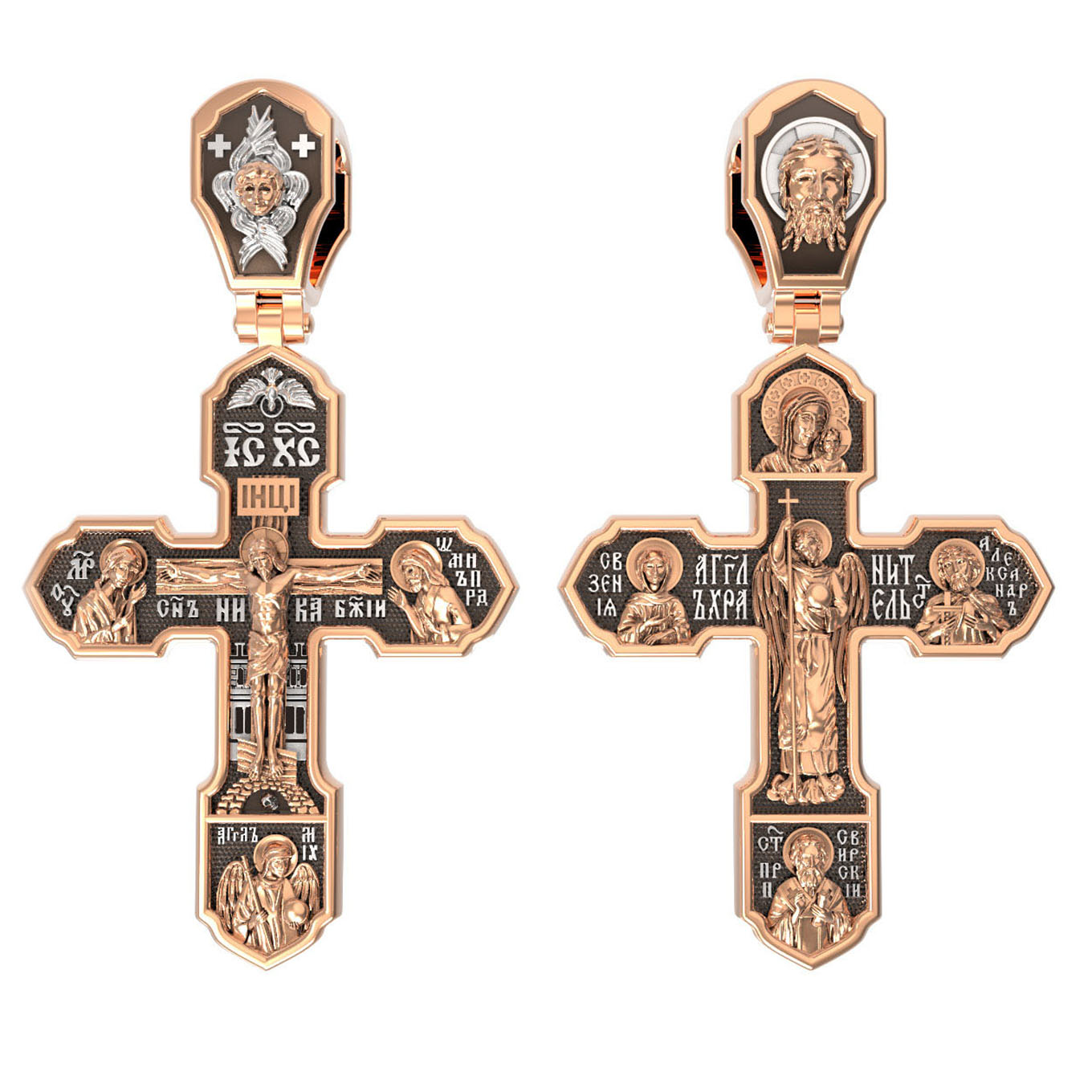 На лицевой стороне изображено Распятие Господа Иисуса Христа, над вершиной которого помещены титлы Его святого имени — «ИС ХС». Под основной перекладиной надписи — «НИКА», что в переводе с греческого означает «победитель», и словосочетание «СЫН БОЖИЙ», что означает божественную природу Иисуса Христа. С двух сторон Христу предстоят Пресвятая Богородица и св. Андрей Первозванный. Внизу — образ Архангела Михаила, могучего защитника от злых сил. Это он низверг дьявола и встал во главе ангелов для борьбы с бесовскими силами. Его имя означает «Кто яко Бог?».