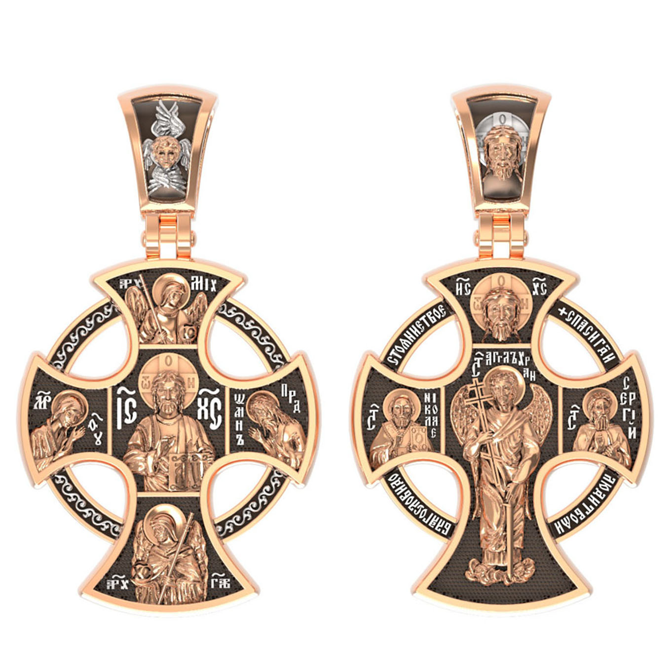 В центре лицевой стороны изображена ипостась Сына Божьего в окружении Пресвятой Богородицы и св. пророка и Предтечи Господня Иоанна Крестителя, которые имеют особое дерзновение перед Богом молиться за всех людей. Над образом Иисуса Христа изображен архангел Михаил, в нижней части креста — архангел Гавриил. В руках у Иисуса Христа находится Новый Завет. В кулонное кольцо помещено изображение Спаса Нерукотворного, образ Спасителя, который Он запечатлел на плате и передал для исцеления больному проказой царю Эдессы.