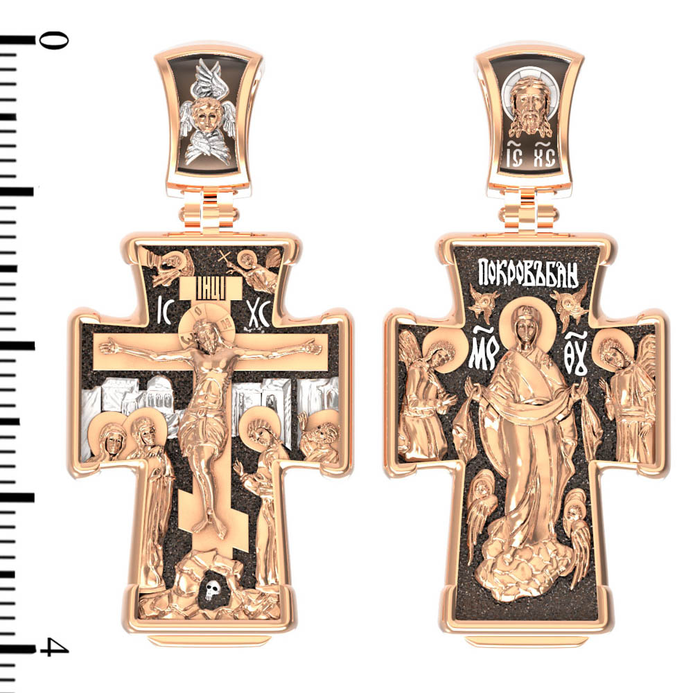 На обороте креста изображена икона Покрова Пресвятой Богородицы. Праздник Покрова Божией Матери является воспоминанием чуда, которое произошло во Влахнернской церкви 1 (14) октября 910 года: Пресвятая Богородица явилась верующим над алтарем храма и распростерла над ними Свое покрывало. В этот день Божия Матерь открыла людям, что Она является Ходатаицей за них перед Богом. Богородица простирает Свой молитвенный покров над всеми православными христианами и умоляет Сына Своего о даровании вечного спасения каждому человеку.
