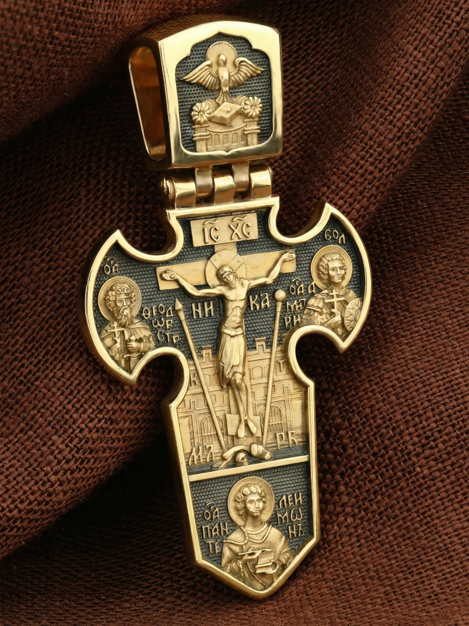С двух сторон от Распятия расположены образы воинов-великомучеников Феодора Стратилата и Димитрия Солунского. В нижней части Воинского креста помещено изображение вмч. и целителя Пантелеимона, святого врача-бессребреника, который почитался не только как врачеватель ран, но и как помощник на поле брани.