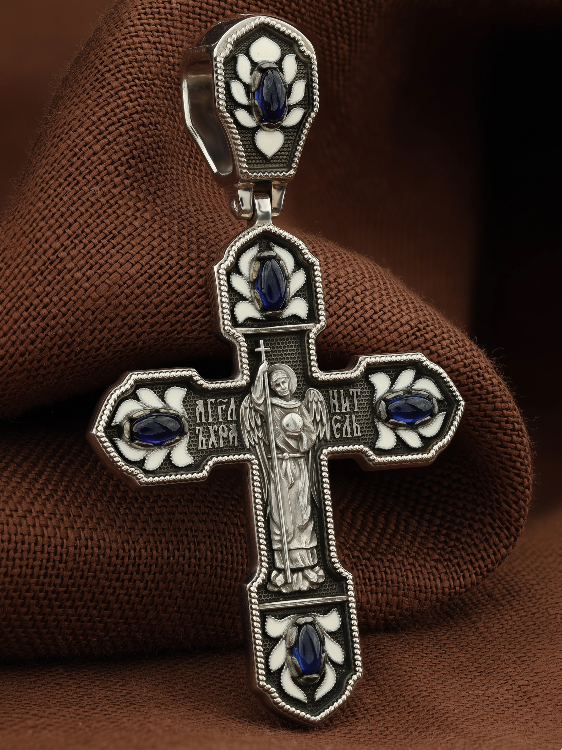 Крест из белого золота c эмалью и сапфиром