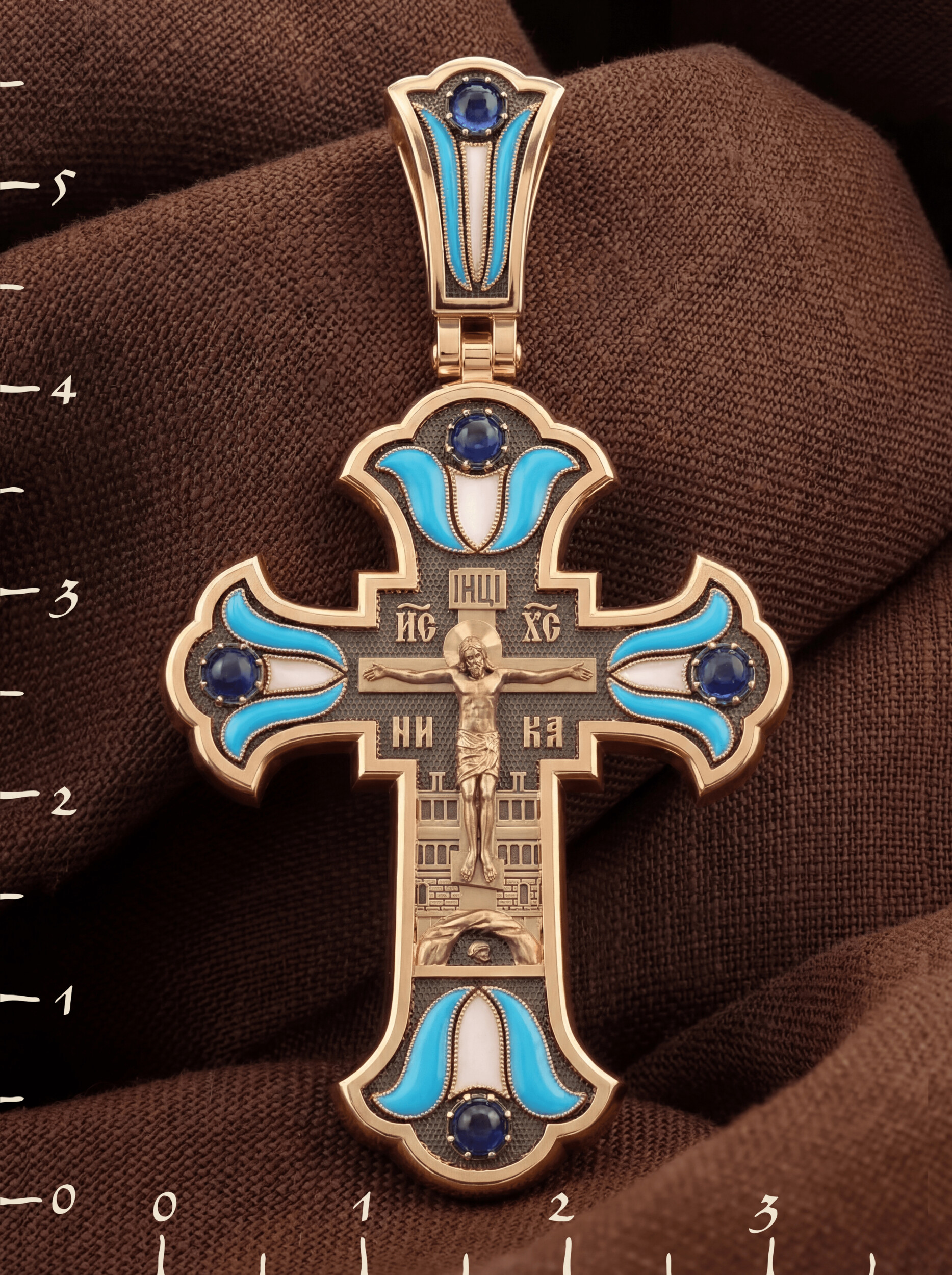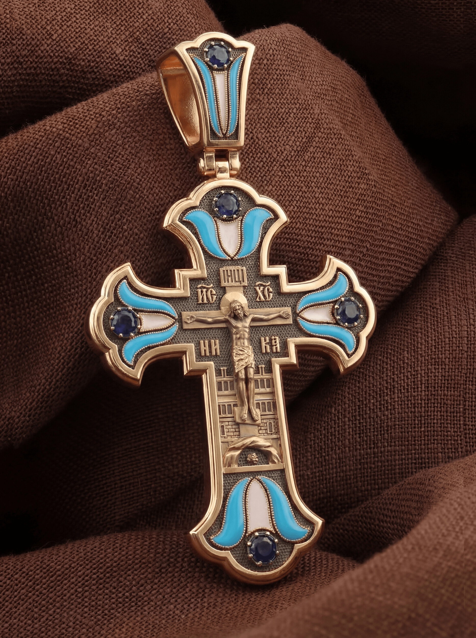 На лицевой стороне креста изображено Распятие Господа и Спасителя нашего Иисуса Христа. Христос, подвергнутый на кресте мучительной казни, своими страданиями искупил нас от древнего греха и даровал нам жизнь вечную. На верхней табличке, выше головы Иисуса, расположена надпись, составленная Понтием Пилатом — «IНЦI». Она означает «Иисус Назорей, Царь Иудейский». Надписи «IС» « ХС» означает Иисус Христос и слово «НИКА», что означает «победитель», помещается на разных сторонах поперечной перекладины креста. За крестом высится Иерусалимская стена, в знак того, что Господь был распят вне стен города. Крест стоит на горе камней, символизирующих Голгофу. Под подножием Креста изображена покоящаяся голова (череп) Адама, грехи которого Христос омыл Своею Кровью.