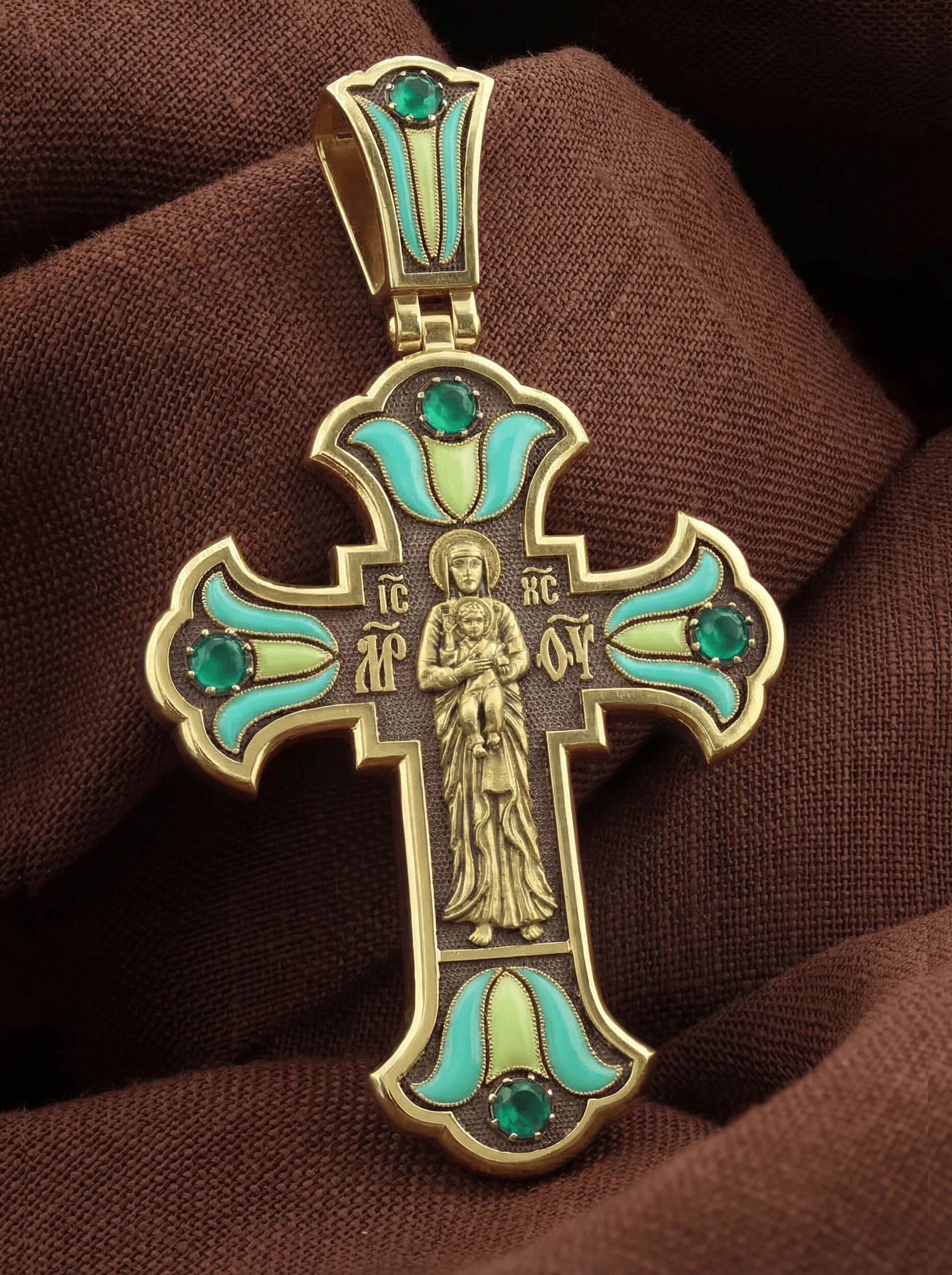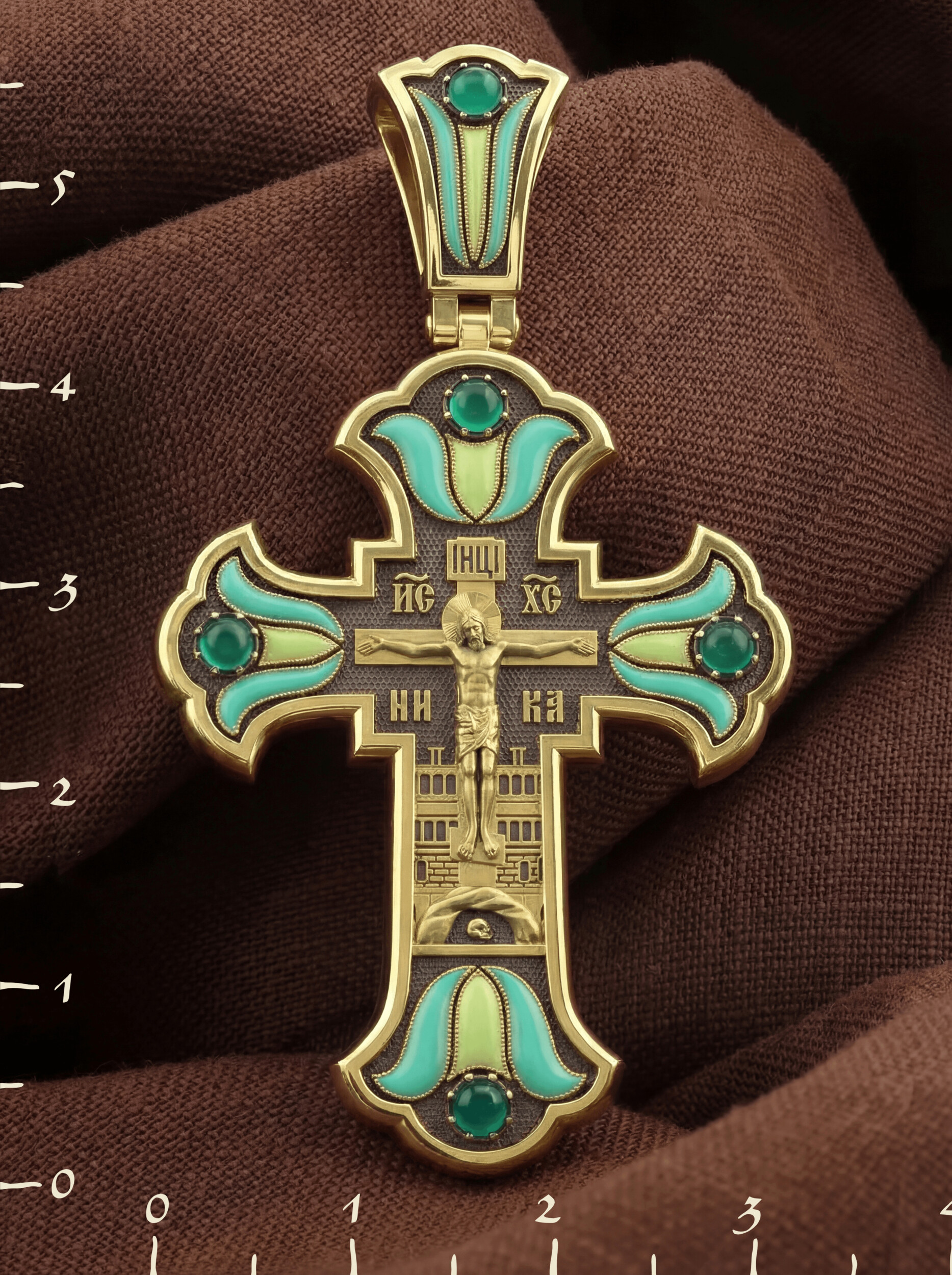 На лицевой стороне креста изображено Распятие Господа и Спасителя нашего Иисуса Христа. Христос, подвергнутый на кресте мучительной казни, своими страданиями искупил нас от древнего греха и даровал нам жизнь вечную. На верхней табличке, выше головы Иисуса, расположена надпись, составленная Понтием Пилатом — «IНЦI». Она означает «Иисус Назорей, Царь Иудейский». Надписи «IС» « ХС» означает Иисус Христос и слово «НИКА», что означает «победитель», помещается на разных сторонах поперечной перекладины креста. За крестом высится Иерусалимская стена, в знак того, что Господь был распят вне стен города. Крест стоит на горе камней, символизирующих Голгофу. Под подножием Креста изображена покоящаяся голова (череп) Адама, грехи которого Христос омыл Своею Кровью.