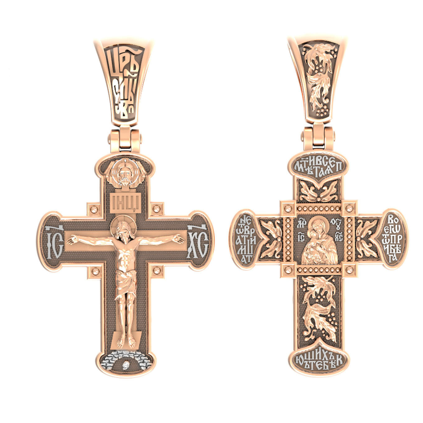 На лицевой стороне креста изображено Распятие Господа и Спасителя нашего Иисуса Христа, отдавшего Себя на смерть, для искупления грехов мира. Крест является символом жертвенной любви Всеблагого Бога к падшим людям, всепобеждающим духовным оружием христиан, основанием и средоточием церковной жизни. Господь сказал: «кто хочет идти за Мною, отвергнись себя, и возьми крест свой, и следуй за Мною». (Мк. 8: 34). На кулонном кольце помещена надпись «Царь Славы». На верхней табличке, выше головы Иисуса, расположена надпись, составленная Понтием Пилатом — «IНЦI». Она означает «Иисус Назорей, Царь Иудейский». Над ней — Нерукотворный образ Господа и Спасителя нашего Иисуса Христа, чудесно отпечатавшийся на плате, котором Христос вытер свой лик. Надпись «IC» «ХC», означает Иисус Христос, помещается на разных сторонах поперечной перекладины креста. Крест стоит на горе камней, символизирующих Голгофу. В ее основании различается череп– это голова Адама.