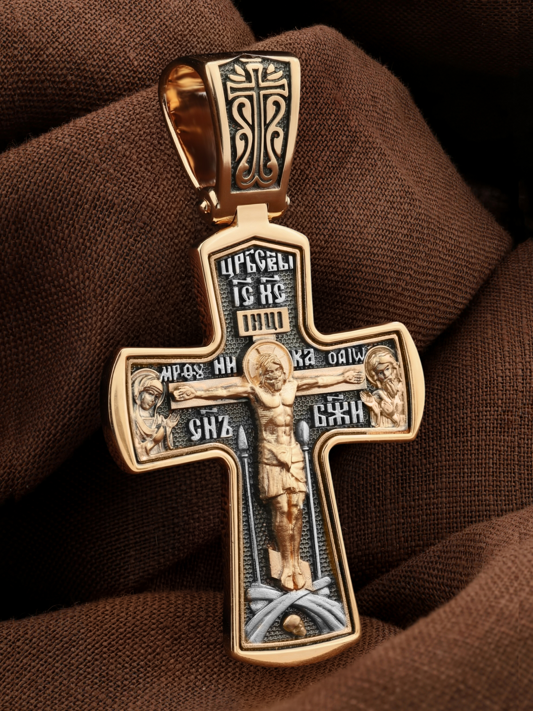 На лицевой стороне креста изображено Распятие Господа и Спасителя нашего Иисуса Христа, отдавшего Себя на смерть, для искупления грехов мира. Крест является символом жертвенной любви Всеблагого Бога к падшим людям, всепобеждающим духовным оружием христиан, основанием и средоточием церковной жизни. Господь сказал: «кто хочет идти за Мною, отвергнись себя, и возьми крест свой, и следуй за Мною». (Мк. 8: 34). На кулонном кольце изображен процветший крест. На верхней табличке, выше головы Иисуса, расположена надпись, составленная Понтием Пилатом — «IНЦI». Она означает «Иисус Назорей, Царь Иудейский». Распятие сопровождается каноническими надписями. Выше Распятия помещена надпись «Царь Славы» и надпись «IC» «ХC», означает Иисус Христос. Слово «НИКА», что означает «победитель» и надпись «Сын Божий», что означает божественную природу Иисуса Христа, помещаются на разных сторонах поперечной перекладины креста. Слева от Распятия изображена Пресвятая Богородица, справа — Про¬рок Предтеча и Креститель Господень Иоанн. Вдоль креста помещены Орудия Страстей Господних — копие сотника Лонгина и трость с губкой. Крест стоит на горе камней, символизирующих Голгофу. В ее основании различается череп– это голова Адама. На православном кресте Христос не умирает, а свободно простирает руки, ладони Иисуса открыты, будто он хочет обнять все человечество, даря им свою любовь и открывая путь к вечной жизни.